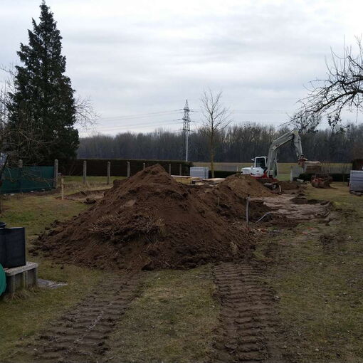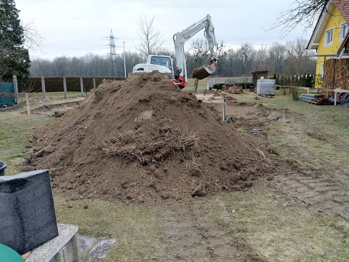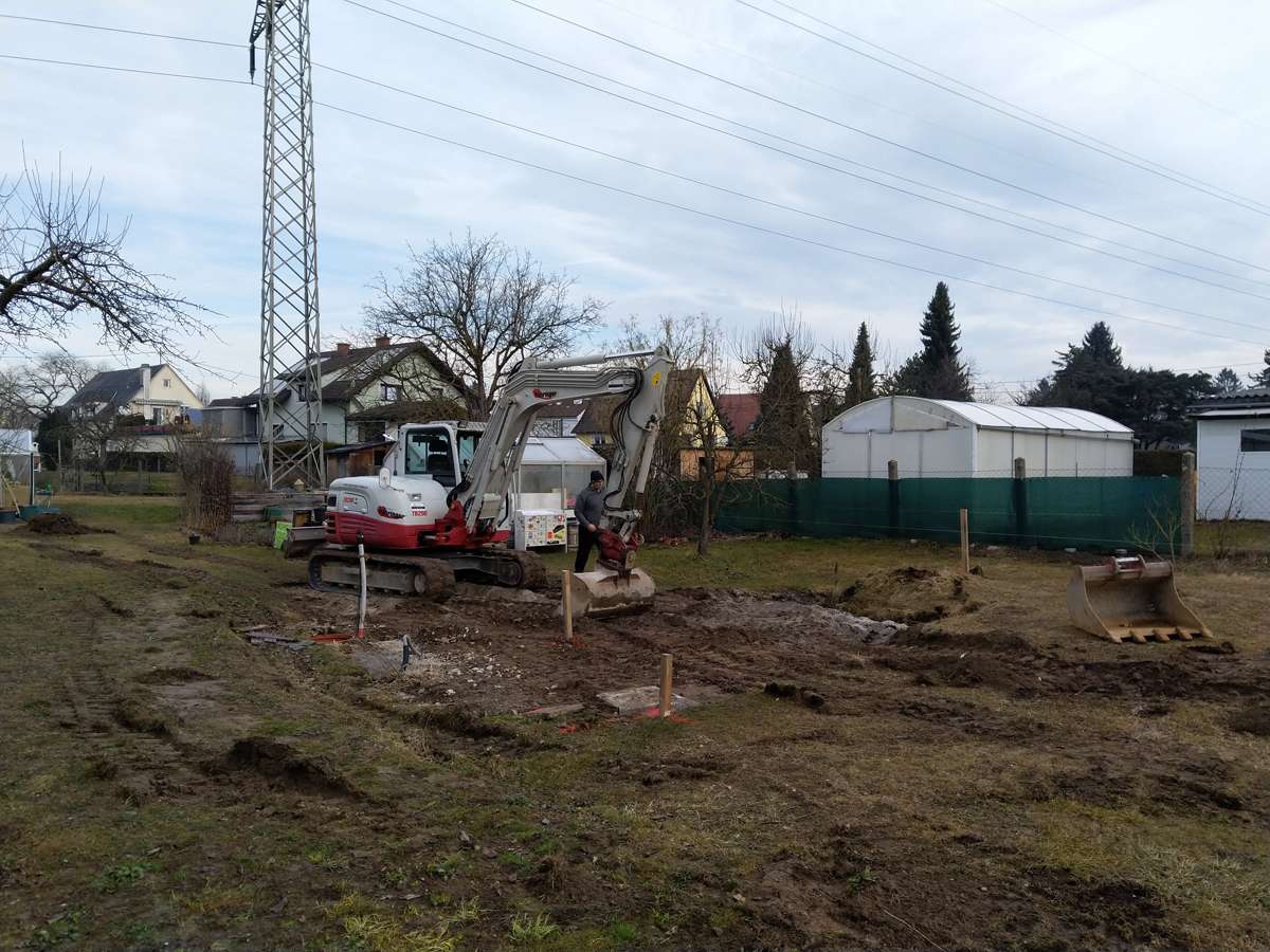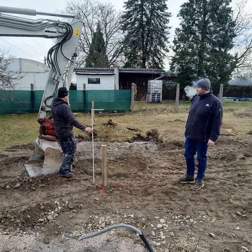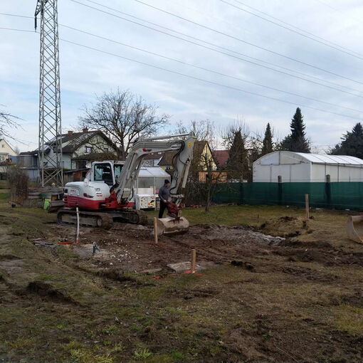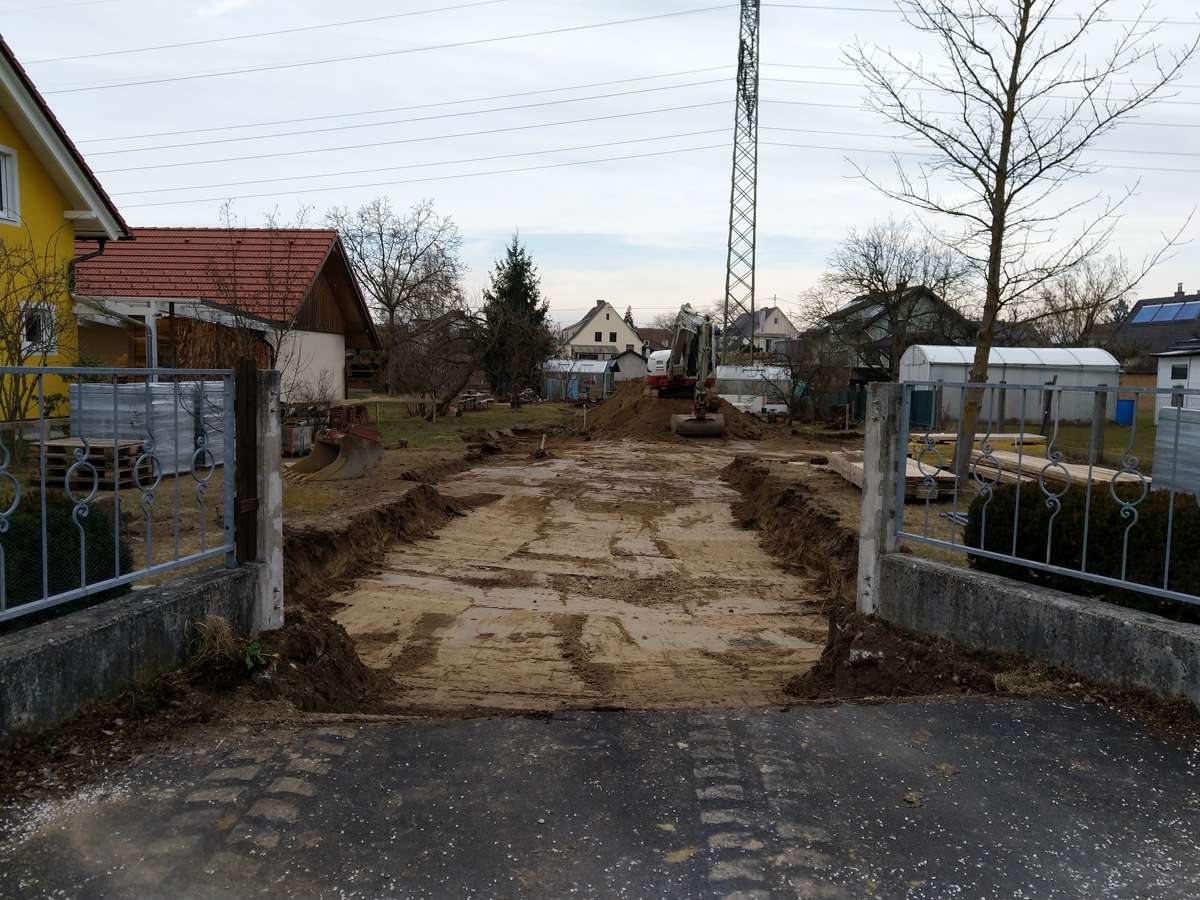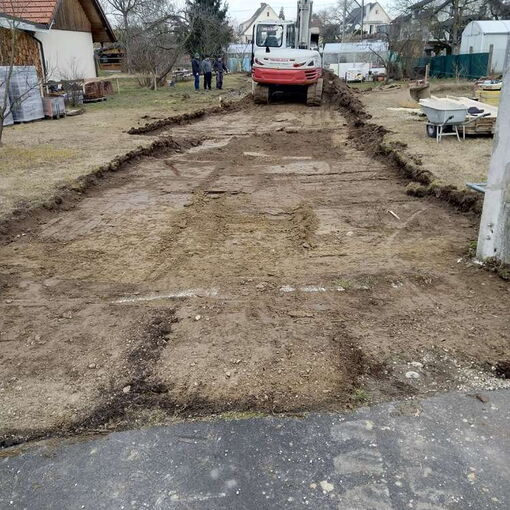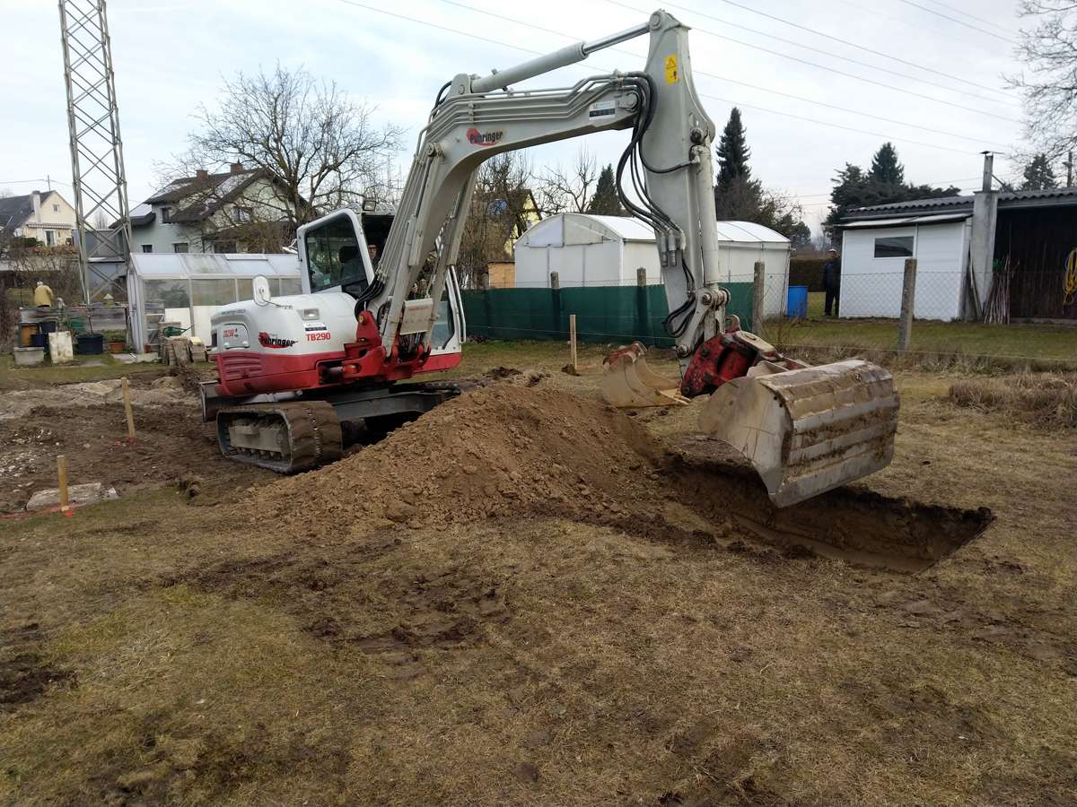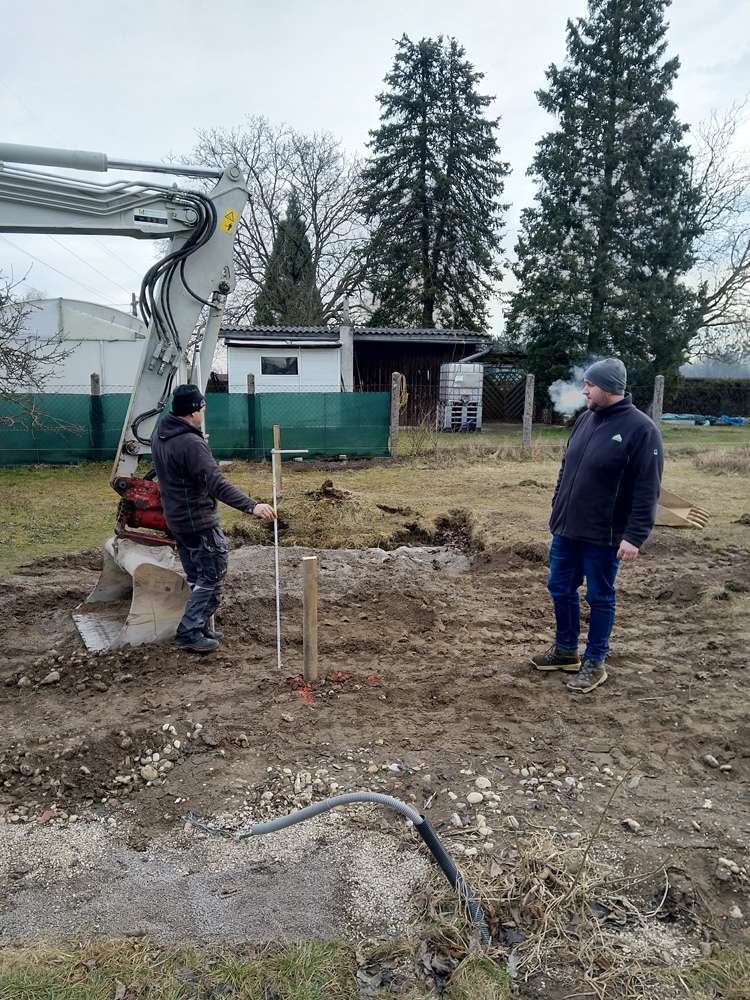 Der Bautrupp ist um 7:00 Uhr vor Ort, die Baufrau kommt ein bisschen später, die Baustelle wird eingerichtet und die erste Höhenmessung bringt eine kleine Überraschung: wir befinden uns mit der Fußbodenoberkante 1,36 cm über dem aktuellen Niveau – müssen also verdammt viel Schotter und Erde aufschütten – wieso hat das vorher keiner gecheckt? Auflösung: steht eh so im Einreichplan, aber man unterschätzt das halt schnell einmal ...