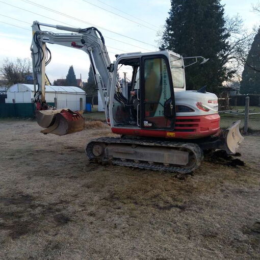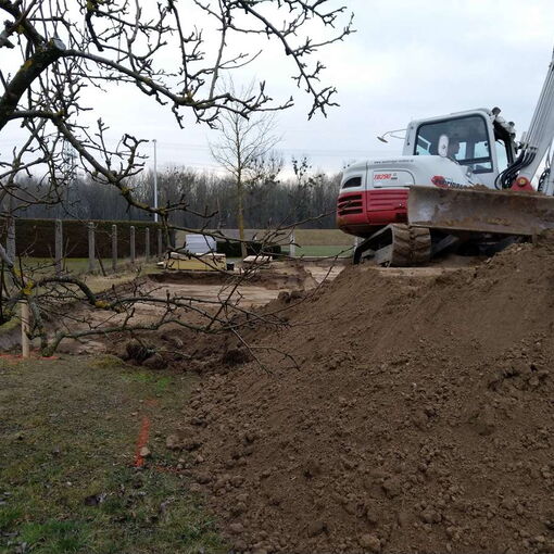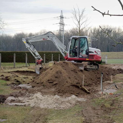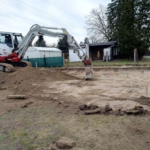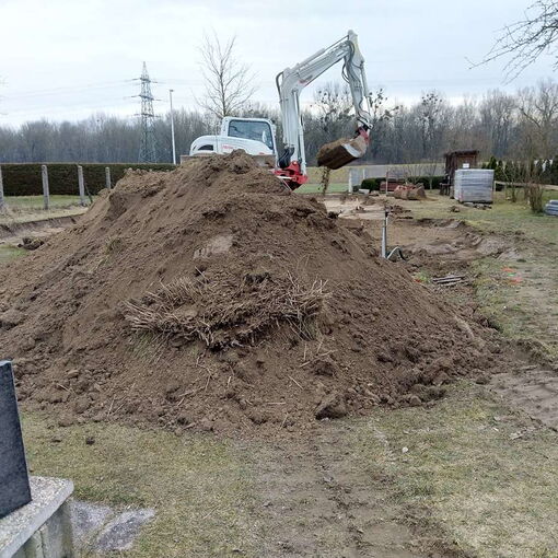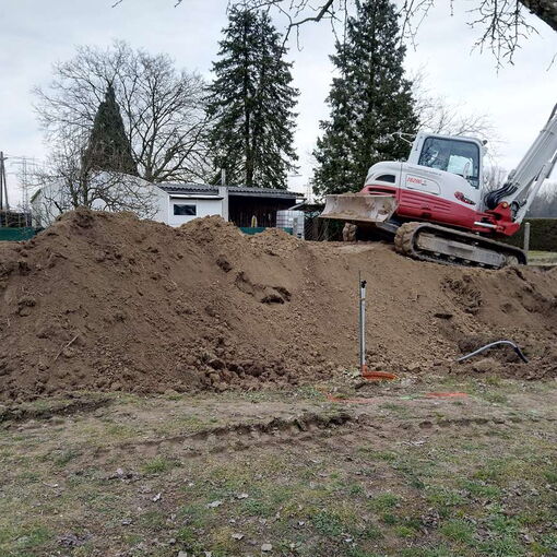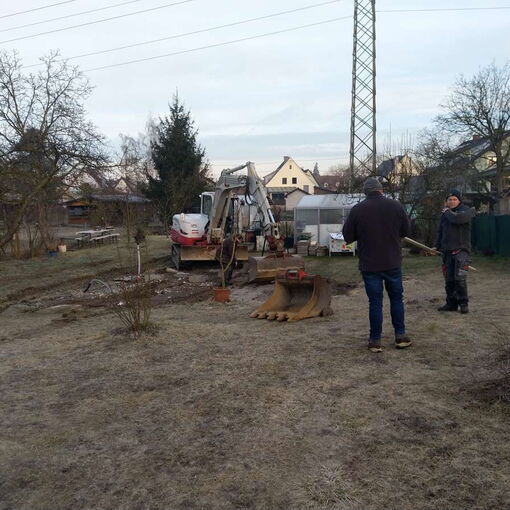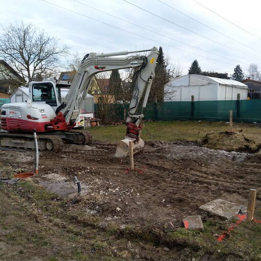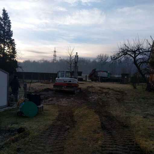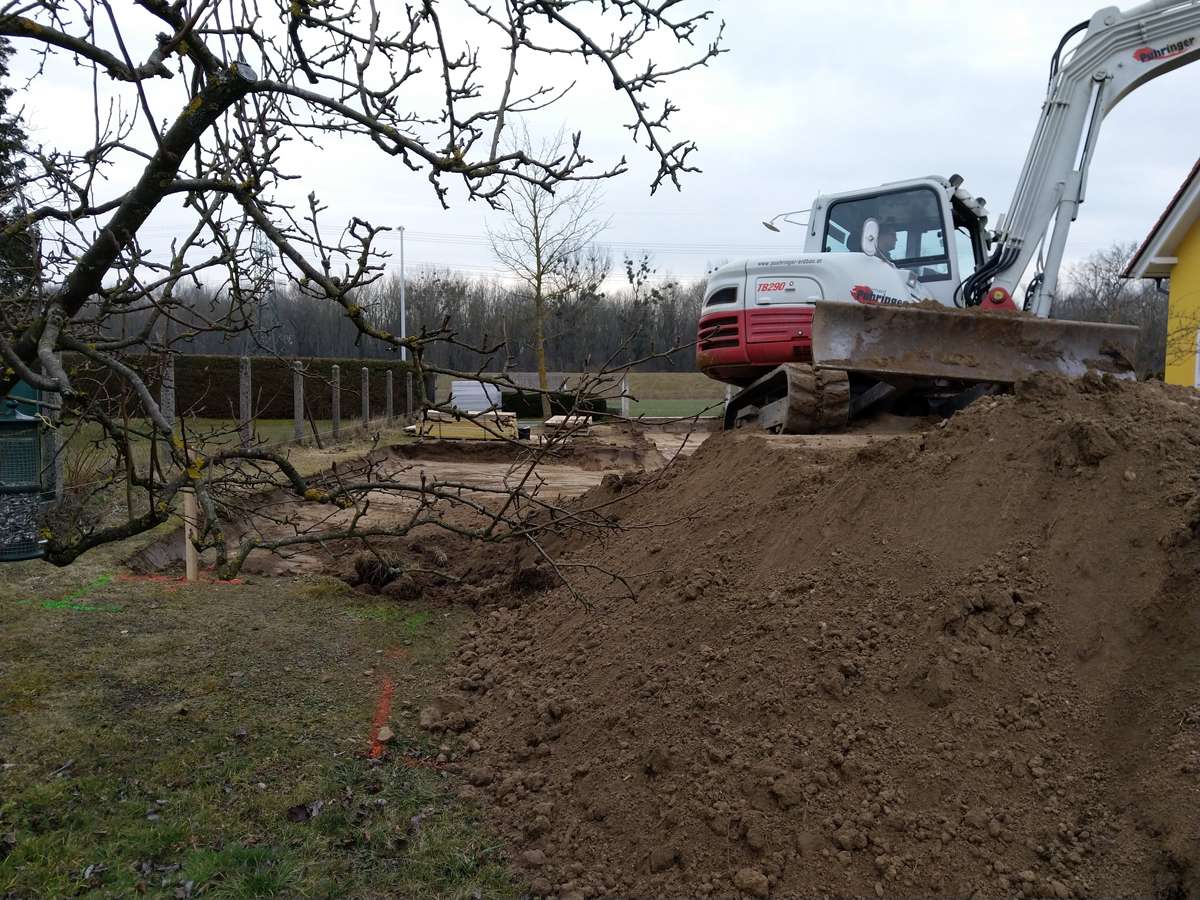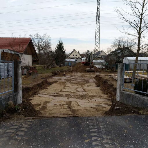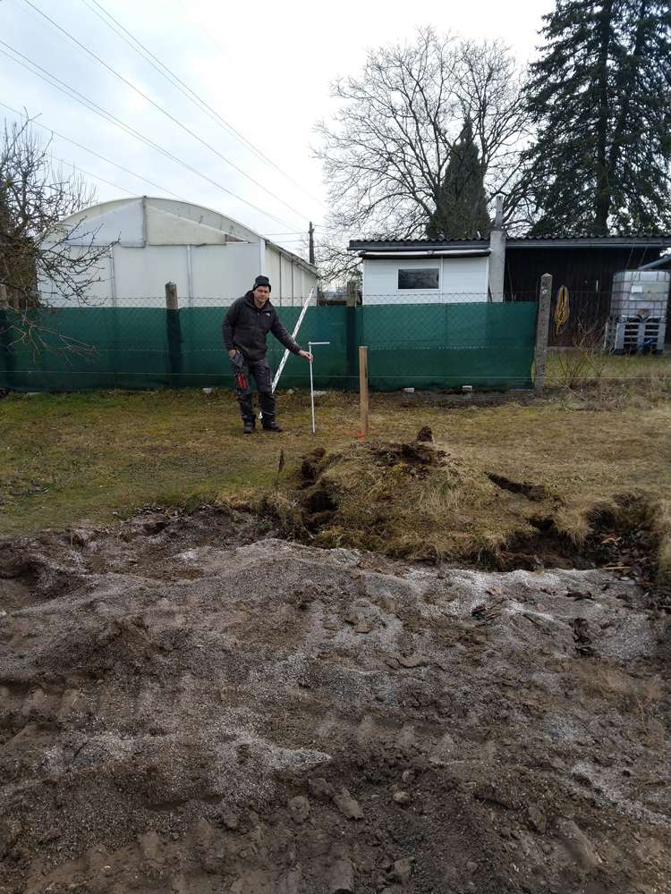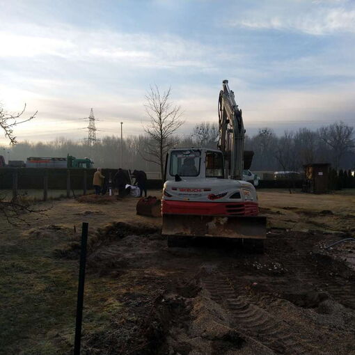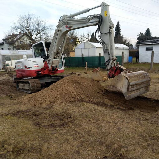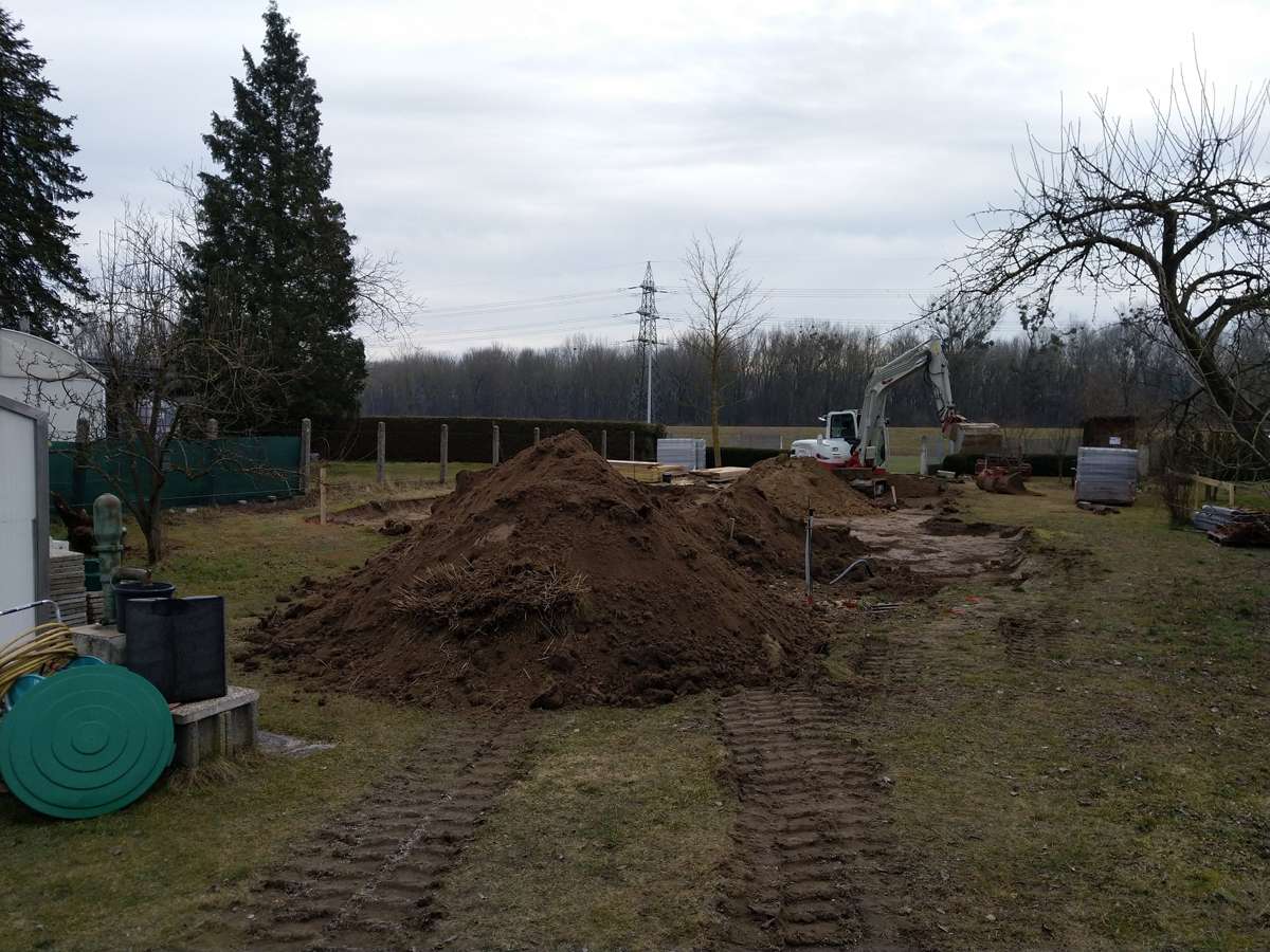 Der Bautrupp ist um 7:00 Uhr vor Ort, die Baufrau kommt ein bisschen später, die Baustelle wird eingerichtet und die erste Höhenmessung bringt eine kleine Überraschung: wir befinden uns mit der Fußbodenoberkante 1,36 cm über dem aktuellen Niveau – müssen also verdammt viel Schotter und Erde aufschütten – wieso hat das vorher keiner gecheckt? Auflösung: steht eh so im Einreichplan, aber man unterschätzt das halt schnell einmal ...