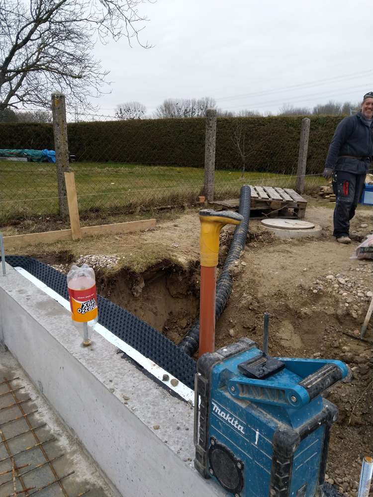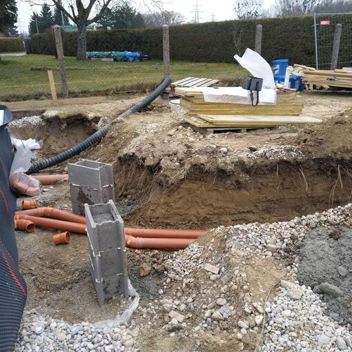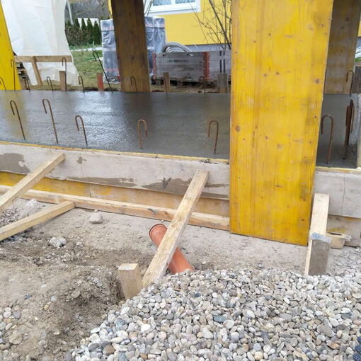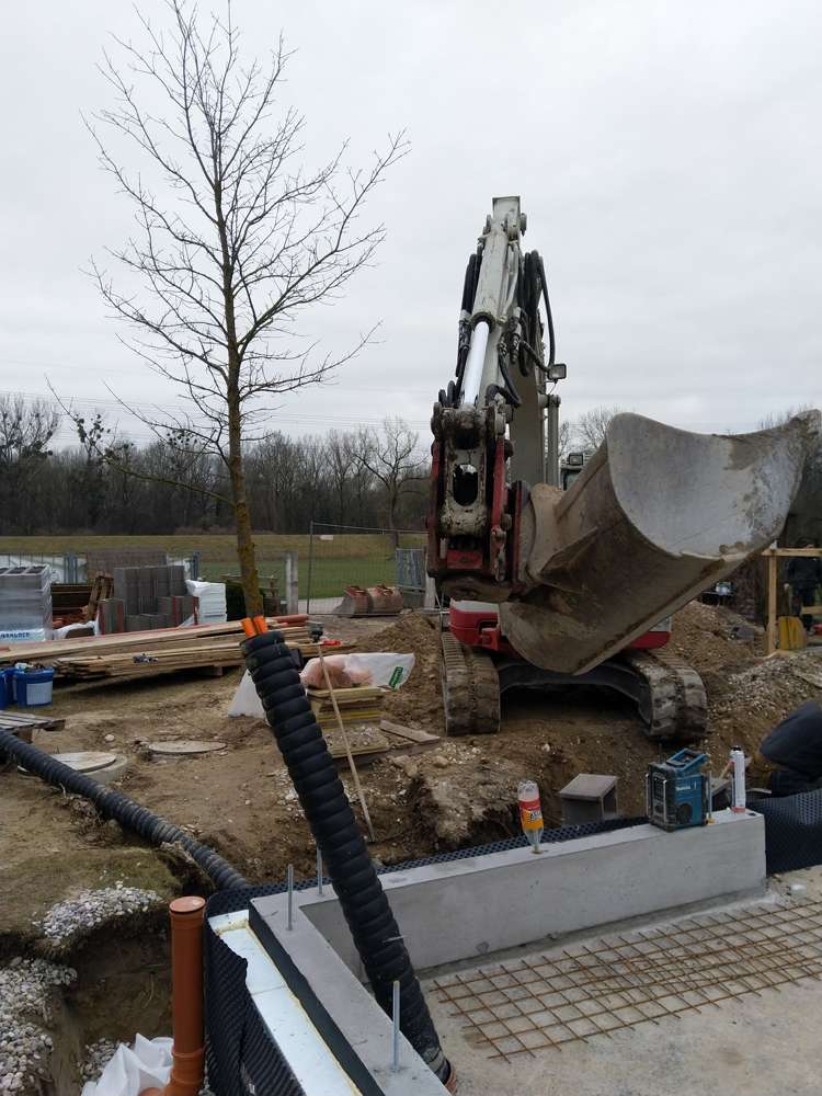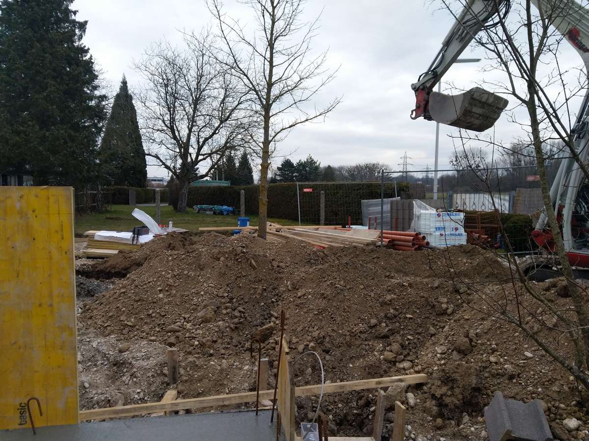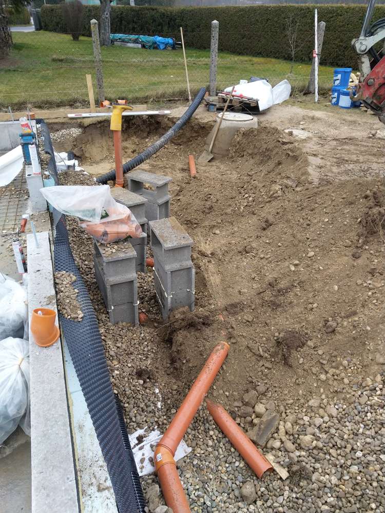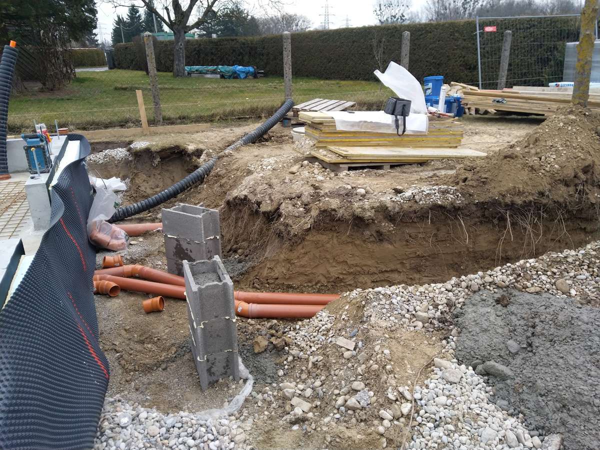 Trotz bescheidener Wetterverhältnisse wird wieder gearbeitet, was das Zeug hält. Die Betonpumpe besucht uns ein weiteres Mal und gießt die Fundamente für Terrasse und Gartenhaus. Dadurch ist der Weg nach hinten verbaut und der Bagger weiß jetzt nicht mehr so recht, wo er den Aushub für die Leerverrohrung für die Strom- und Wasserleitungen deponieren soll. Er entscheidet sich für links und rechts des Grabens und muss folglich immer wieder seinen eigenen Weg freischaufeln. Vor dem Eingang werden die Punktfundamente für das Eingangspodest gesetzt und die Drainage wird eingefüllt.