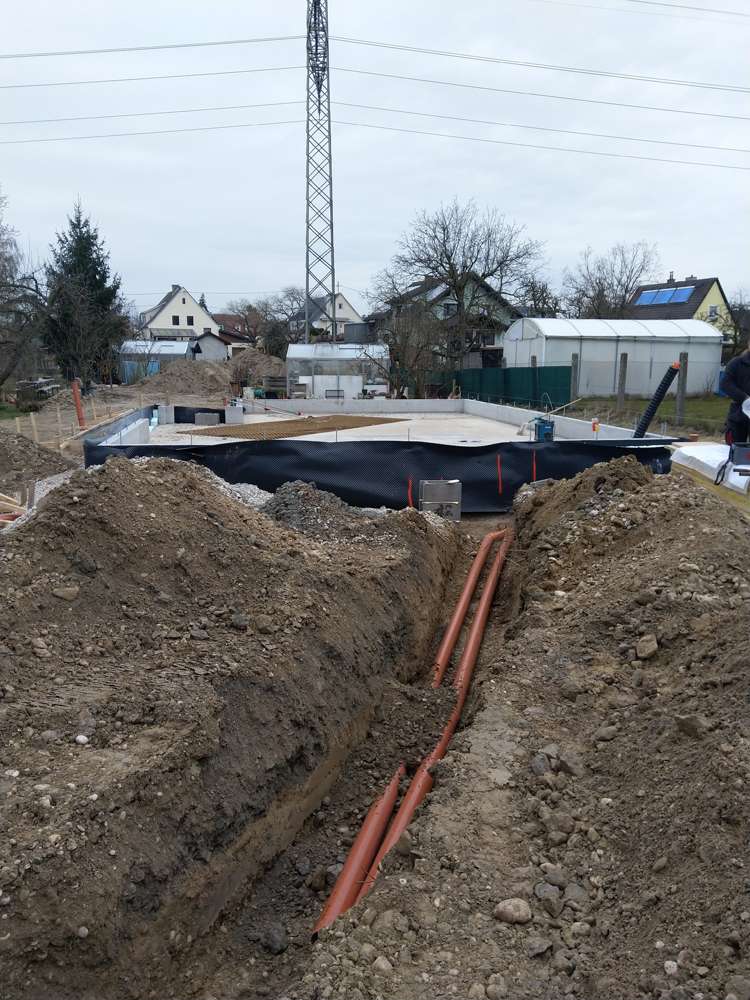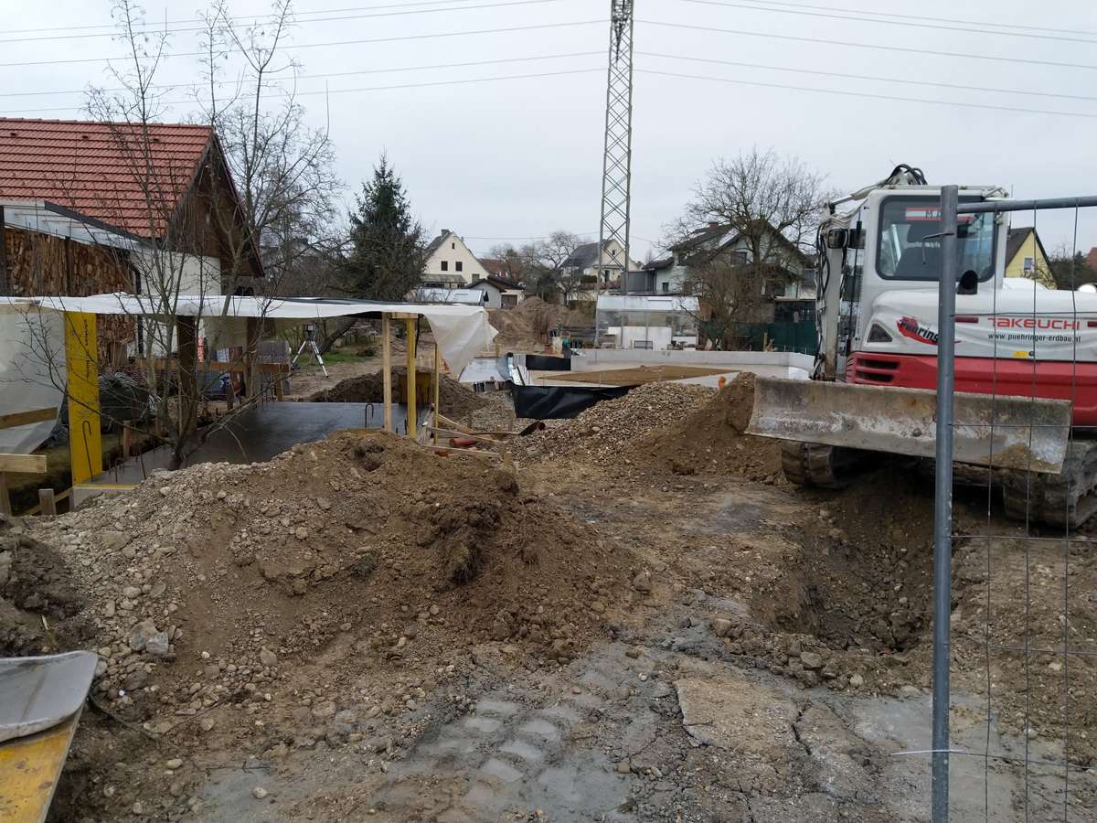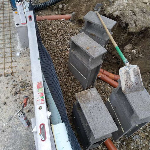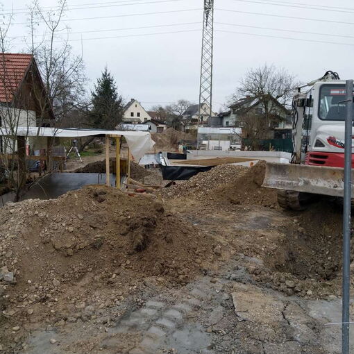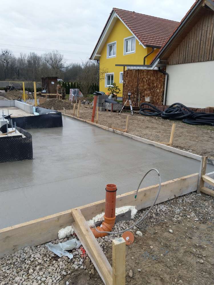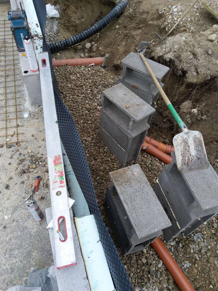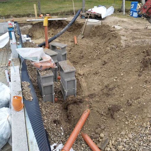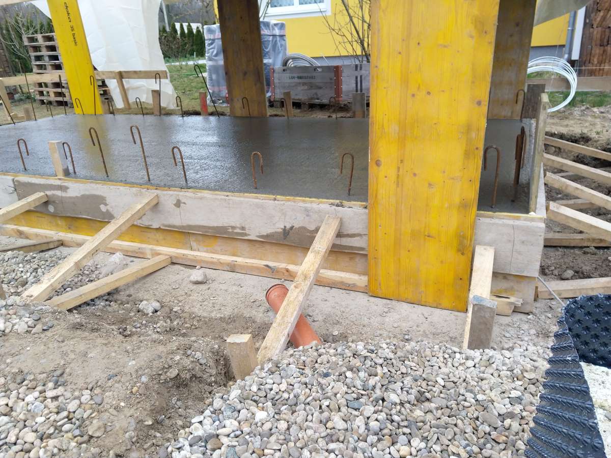Trotz bescheidener Wetterverhältnisse wird wieder gearbeitet, was das Zeug hält. Die Betonpumpe besucht uns ein weiteres Mal und gießt die Fundamente für Terrasse und Gartenhaus. Dadurch ist der Weg nach hinten verbaut und der Bagger weiß jetzt nicht mehr so recht, wo er den Aushub für die Leerverrohrung für die Strom- und Wasserleitungen deponieren soll. Er entscheidet sich für links und rechts des Grabens und muss folglich immer wieder seinen eigenen Weg freischaufeln. Vor dem Eingang werden die Punktfundamente für das Eingangspodest gesetzt und die Drainage wird eingefüllt.