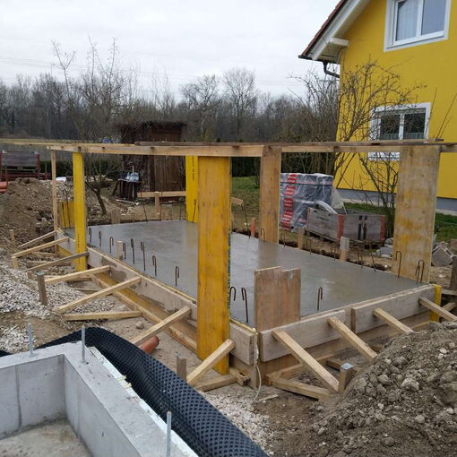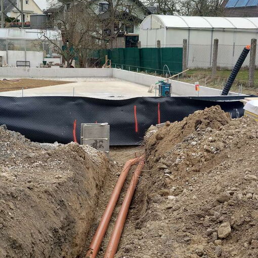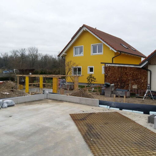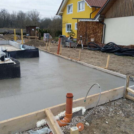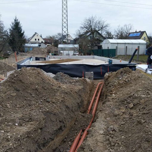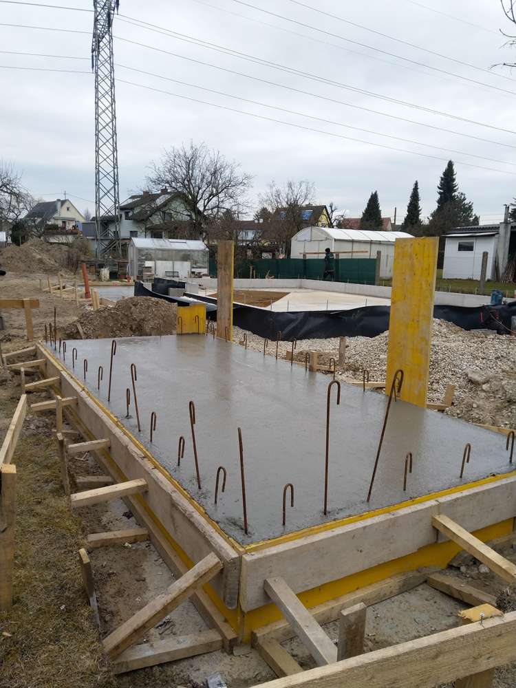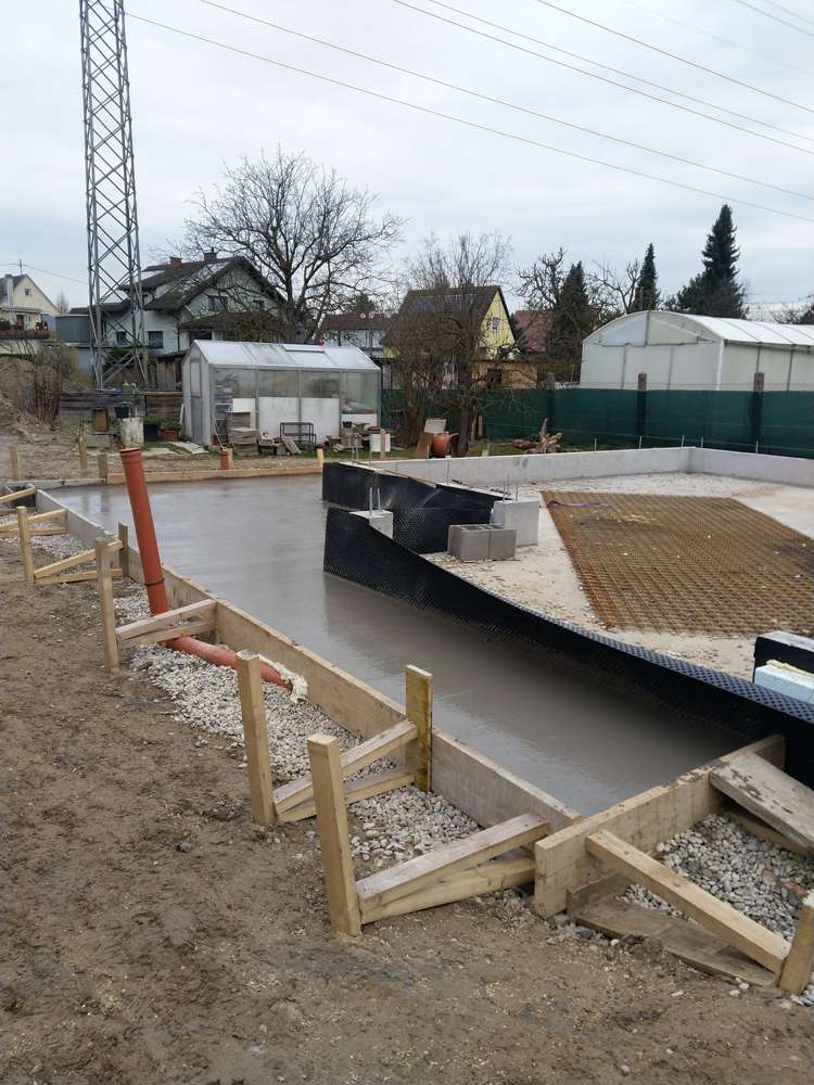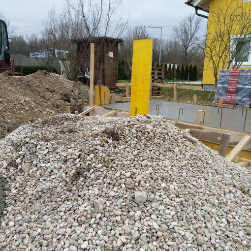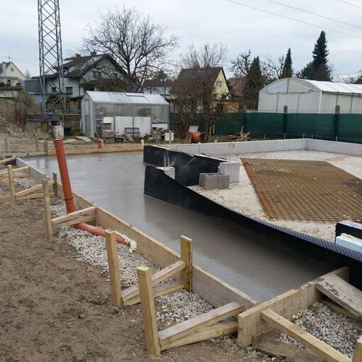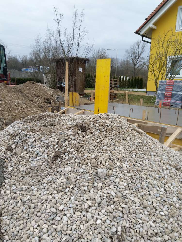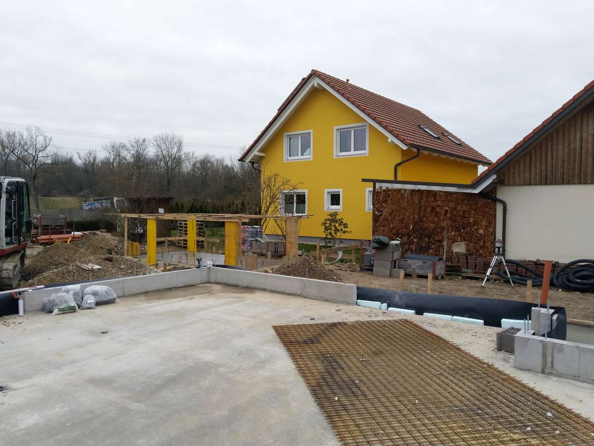 Trotz bescheidener Wetterverhältnisse wird wieder gearbeitet, was das Zeug hält. Die Betonpumpe besucht uns ein weiteres Mal und gießt die Fundamente für Terrasse und Gartenhaus. Dadurch ist der Weg nach hinten verbaut und der Bagger weiß jetzt nicht mehr so recht, wo er den Aushub für die Leerverrohrung für die Strom- und Wasserleitungen deponieren soll. Er entscheidet sich für links und rechts des Grabens und muss folglich immer wieder seinen eigenen Weg freischaufeln. Vor dem Eingang werden die Punktfundamente für das Eingangspodest gesetzt und die Drainage wird eingefüllt.