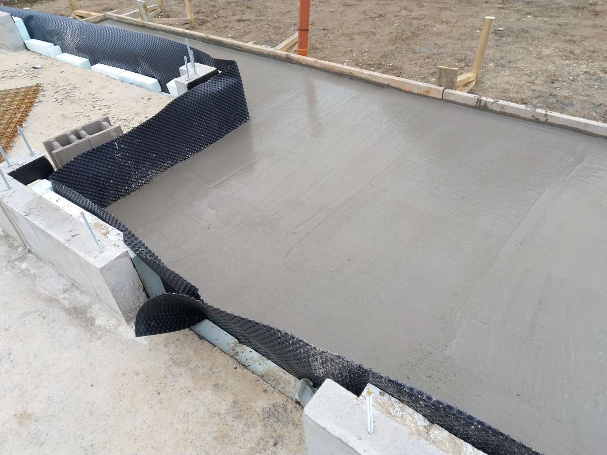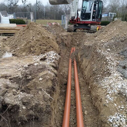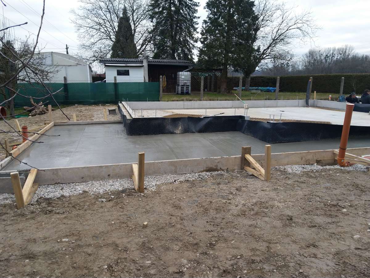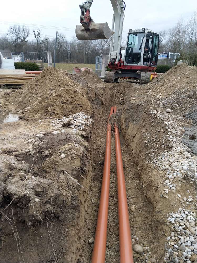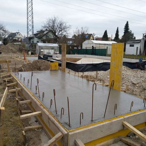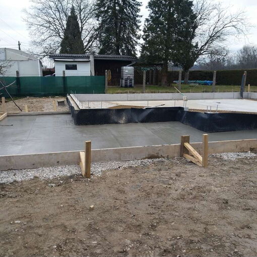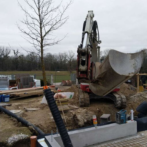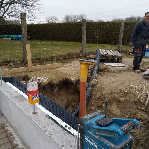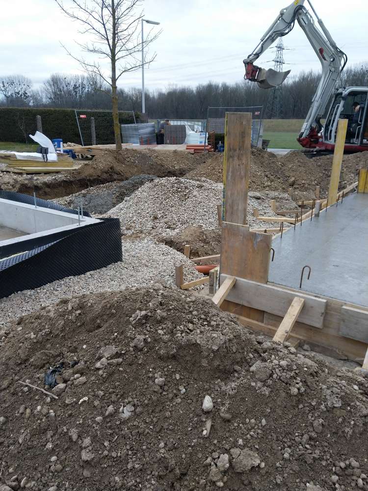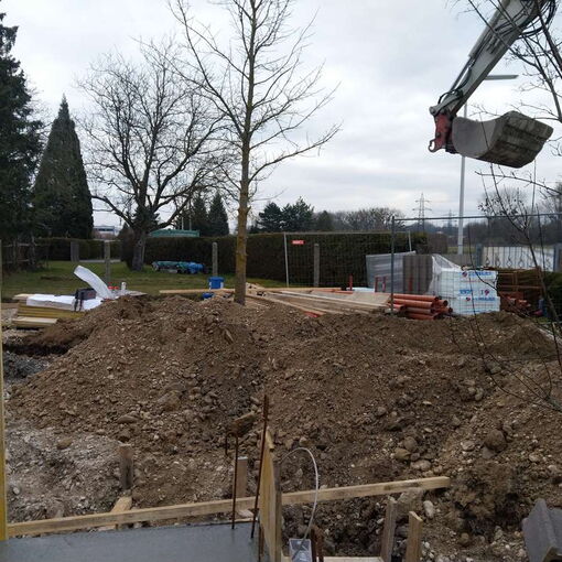 Trotz bescheidener Wetterverhältnisse wird wieder gearbeitet, was das Zeug hält. Die Betonpumpe besucht uns ein weiteres Mal und gießt die Fundamente für Terrasse und Gartenhaus. Dadurch ist der Weg nach hinten verbaut und der Bagger weiß jetzt nicht mehr so recht, wo er den Aushub für die Leerverrohrung für die Strom- und Wasserleitungen deponieren soll. Er entscheidet sich für links und rechts des Grabens und muss folglich immer wieder seinen eigenen Weg freischaufeln. Vor dem Eingang werden die Punktfundamente für das Eingangspodest gesetzt und die Drainage wird eingefüllt.