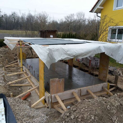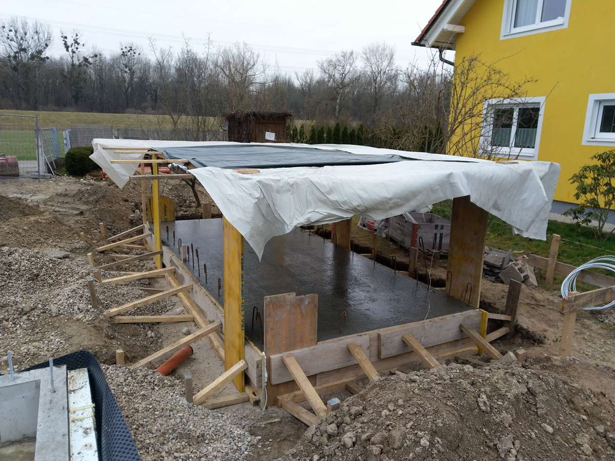 Für das Gartenhüttenfundament muss ein provisorisches Dach gebaut werden, da weitere Niederschläge drohen und der Beton spiegelglatt gestrichen werden soll. Dass der Arbeitstag lang wird, ahnt noch niemand – die Betonglättung zieht sich aufgrund der tiefen Temperaturen bis fast 21:00 Uhr!