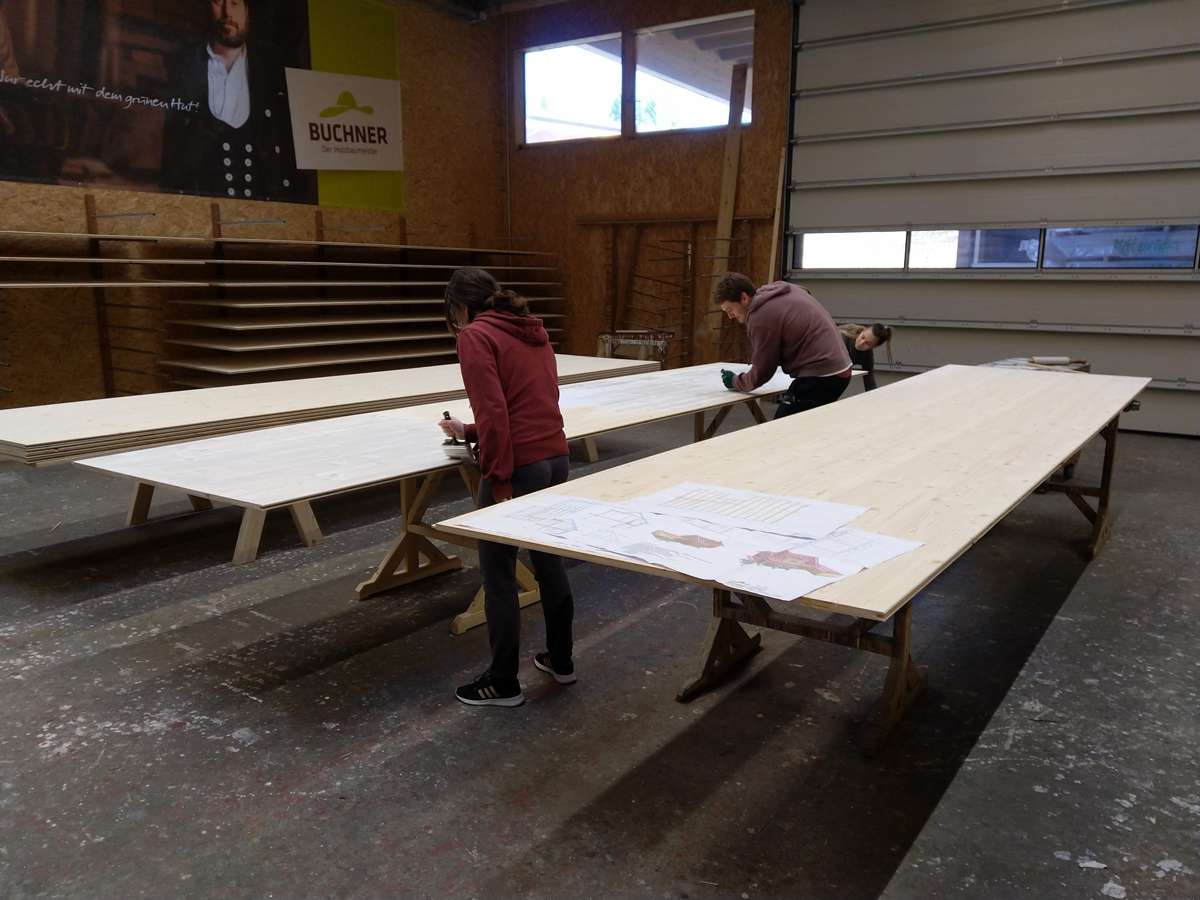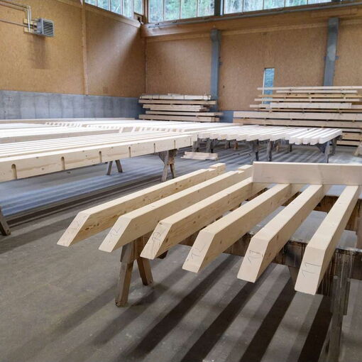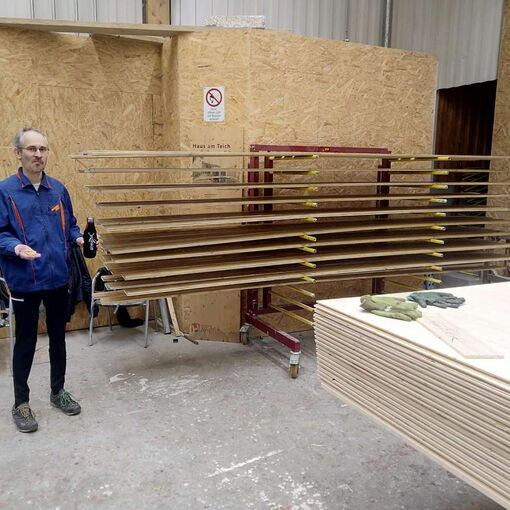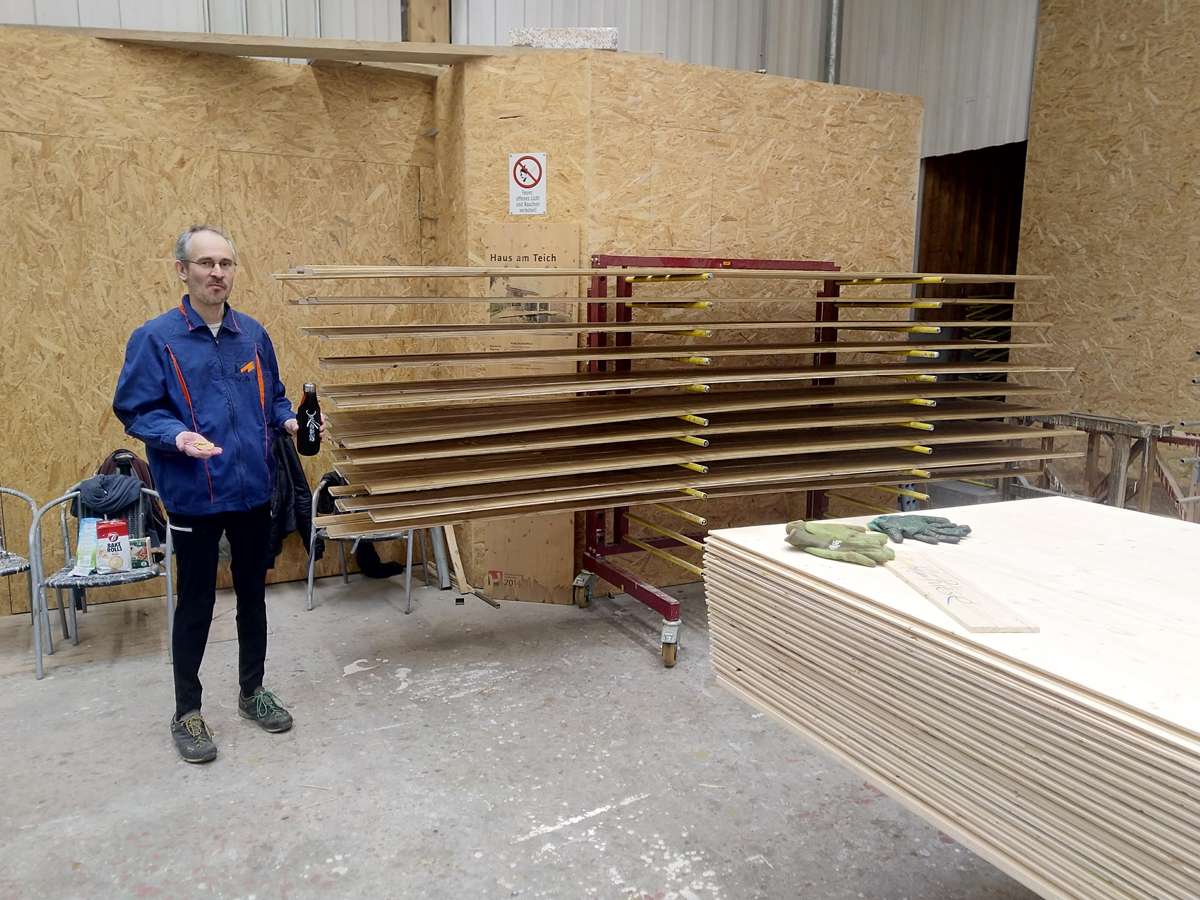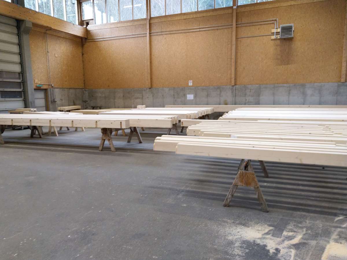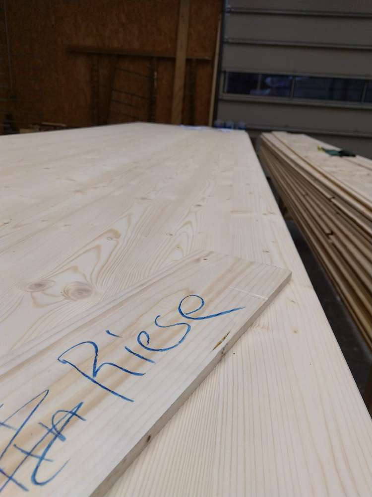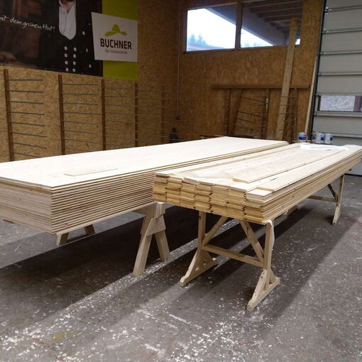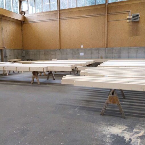 In der Streichhalle angekommen sind wir erst einmal fast ein bisschen enttäuscht, weil da doch relativ wenige Bretter liegen. Aber Moment, da kommt noch was. Der Großteil liegt in der Halle nebenan, in der das Holz zugeschnitten wird. Und das sieht auf den ersten Blick nicht so aus, als würden zwei Tage reichen ...