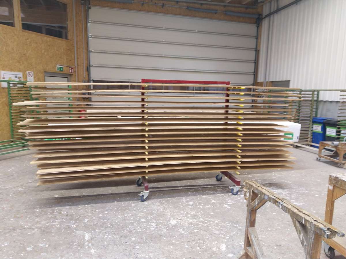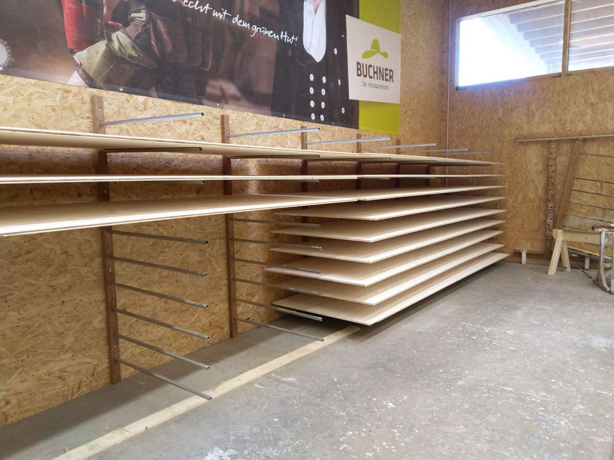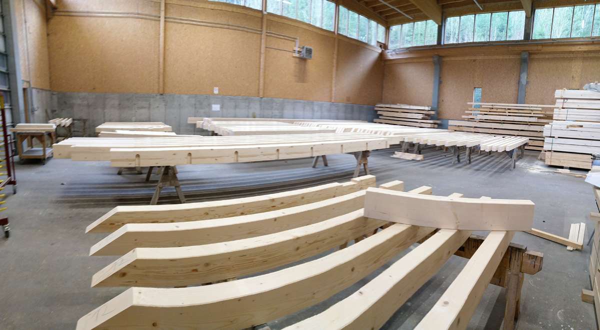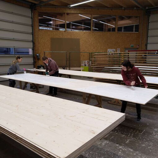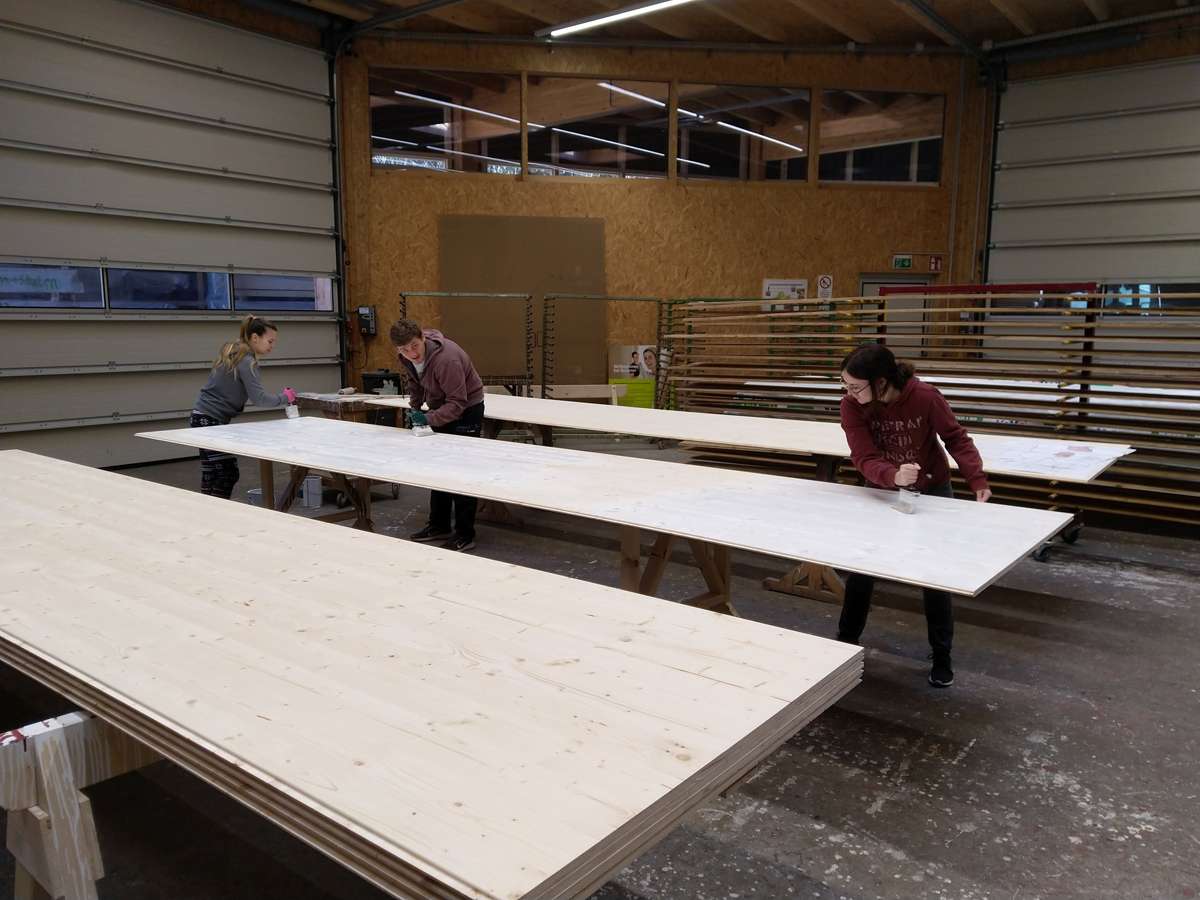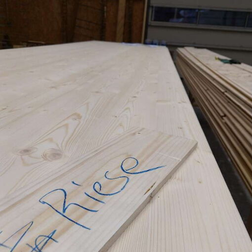 In der Streichhalle angekommen sind wir erst einmal fast ein bisschen enttäuscht, weil da doch relativ wenige Bretter liegen. Aber Moment, da kommt noch was. Der Großteil liegt in der Halle nebenan, in der das Holz zugeschnitten wird. Und das sieht auf den ersten Blick nicht so aus, als würden zwei Tage reichen ...