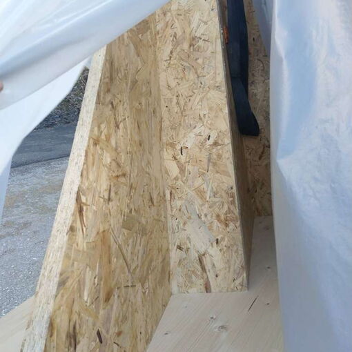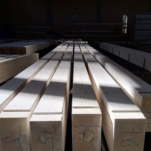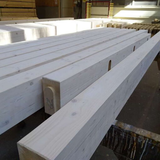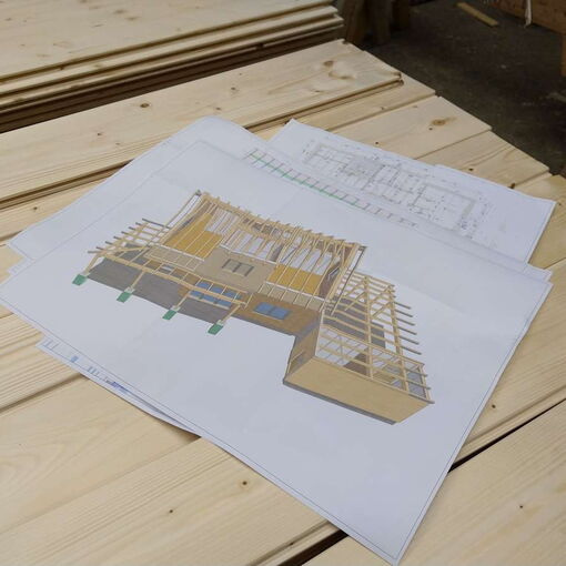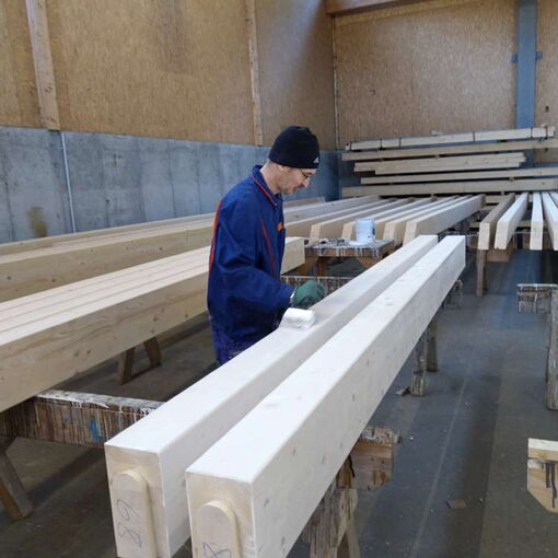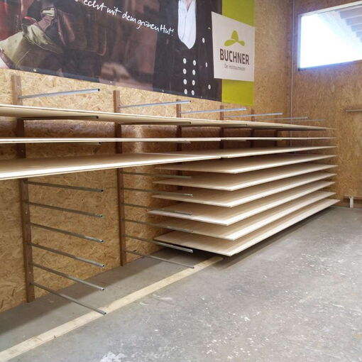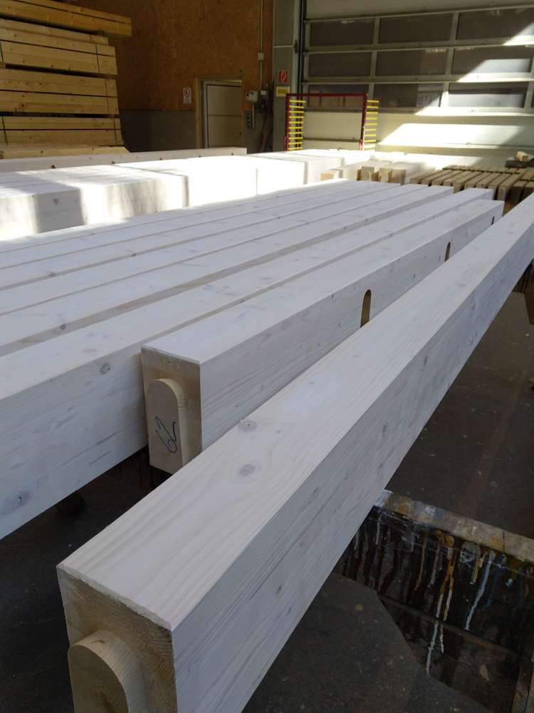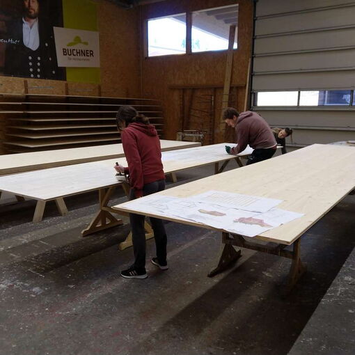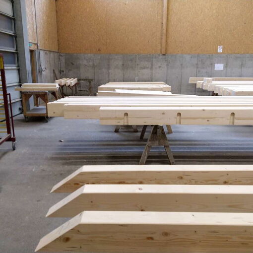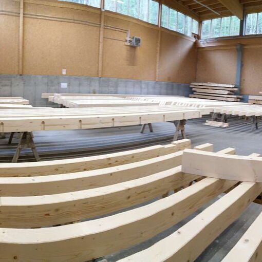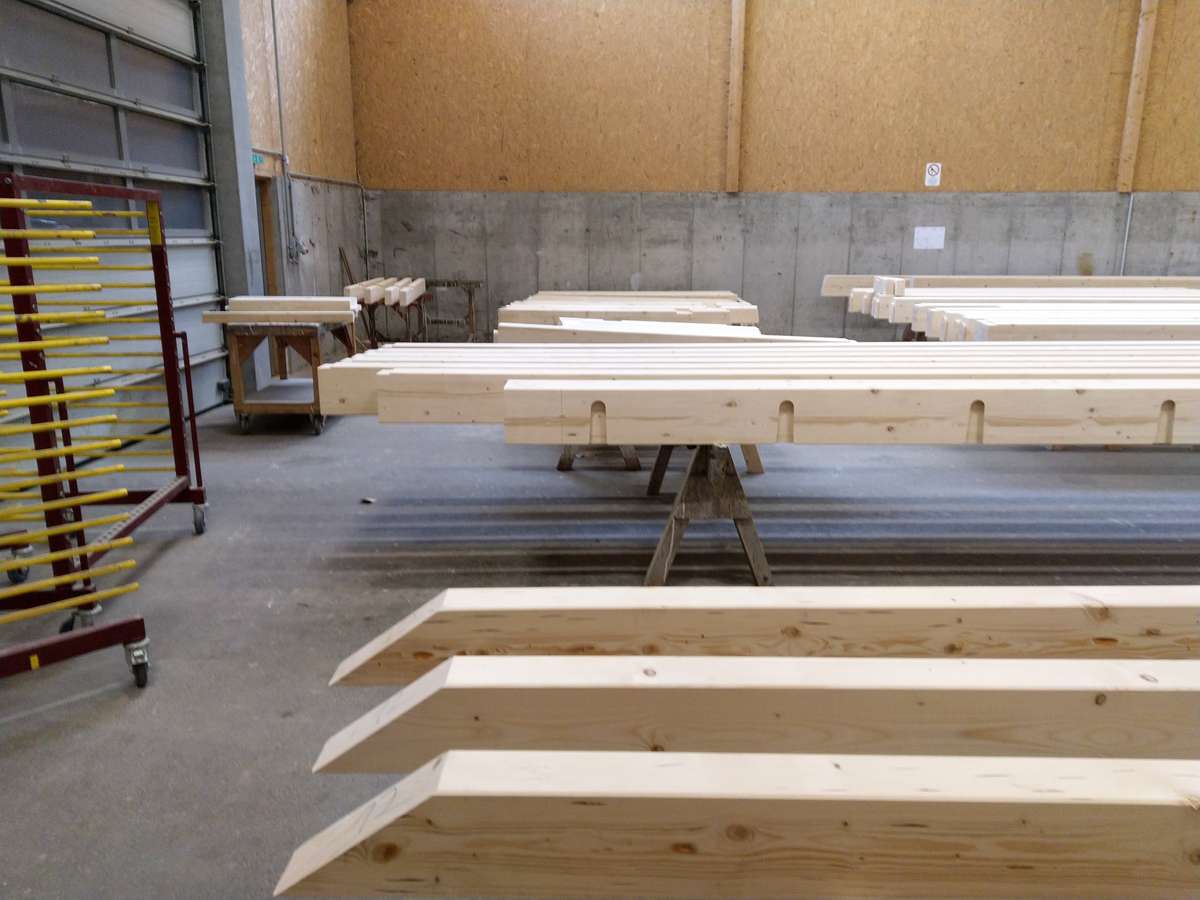 In der Streichhalle angekommen sind wir erst einmal fast ein bisschen enttäuscht, weil da doch relativ wenige Bretter liegen. Aber Moment, da kommt noch was. Der Großteil liegt in der Halle nebenan, in der das Holz zugeschnitten wird. Und das sieht auf den ersten Blick nicht so aus, als würden zwei Tage reichen ...