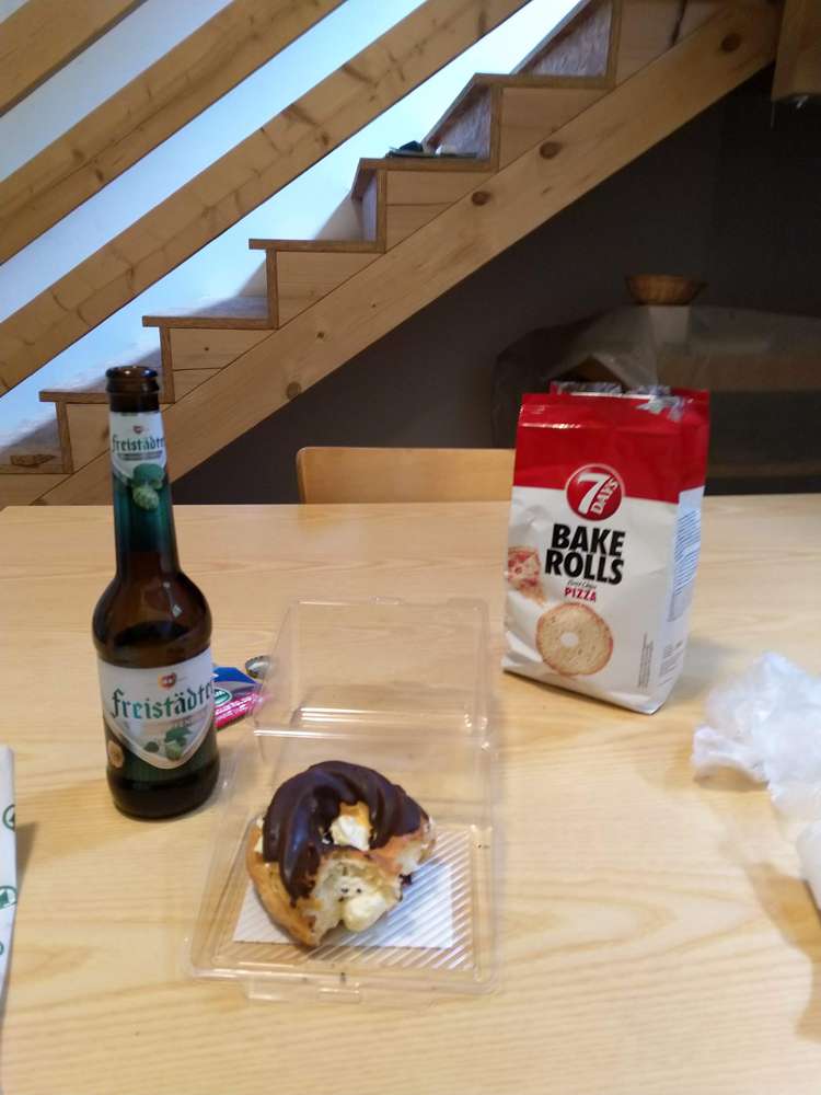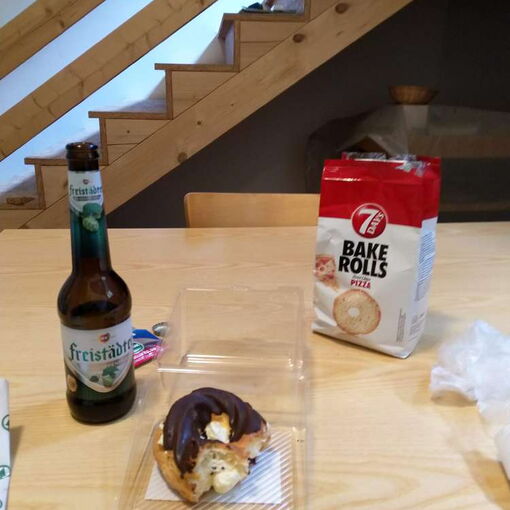 (In solchen Ausnahmesituationen darf man ausnahmsweise ungesundes Zeug essen, deshalb gibt es zu Mittag wieder Leberkässemmerl.)