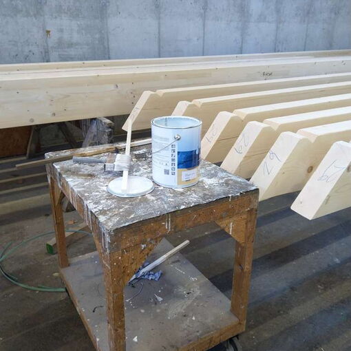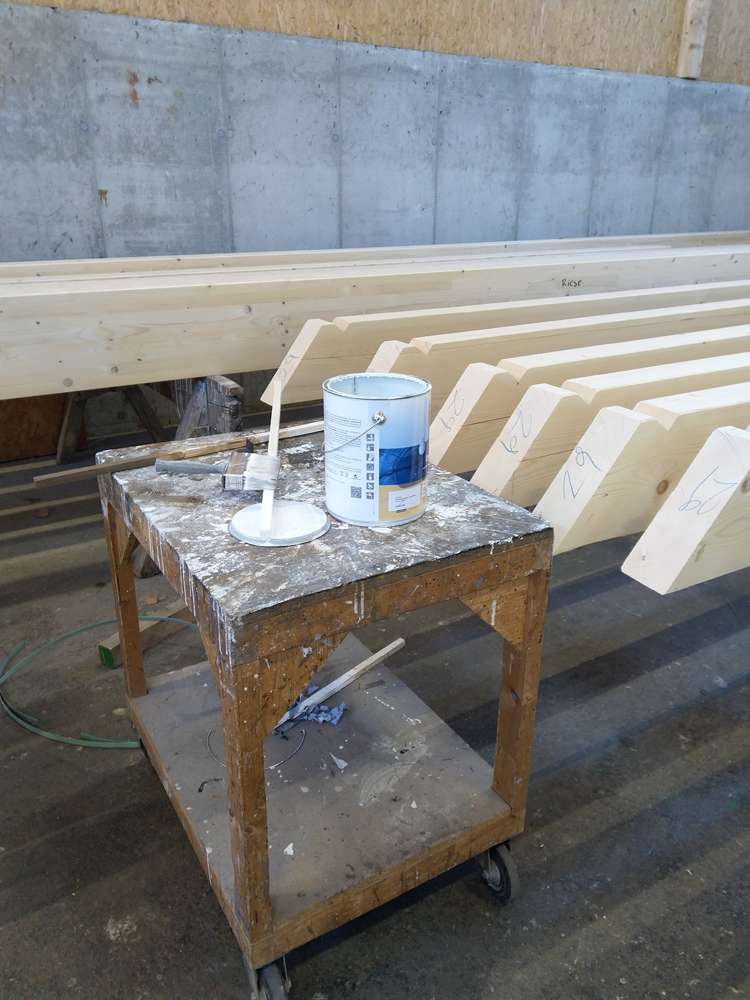 Der Samstag verläuft ähnlich wie der Freitag. Abfahrt um 6:15, Arbeitsbeginn ca. 7:15, heute klebt an der Tür zur Streichhalle ein Zettel mit Verhaltensregeln zu Corona. Abstand halten ist kein Problem, wir sind eh alleine - bis auf einen fleißigen Menschen, der in der großen Halle am Vormittag noch Holz zuschneidet. Und weiter geht's, der nächste Farbkübel wird geöffnet, aber irgendwie wird es nicht weniger ...