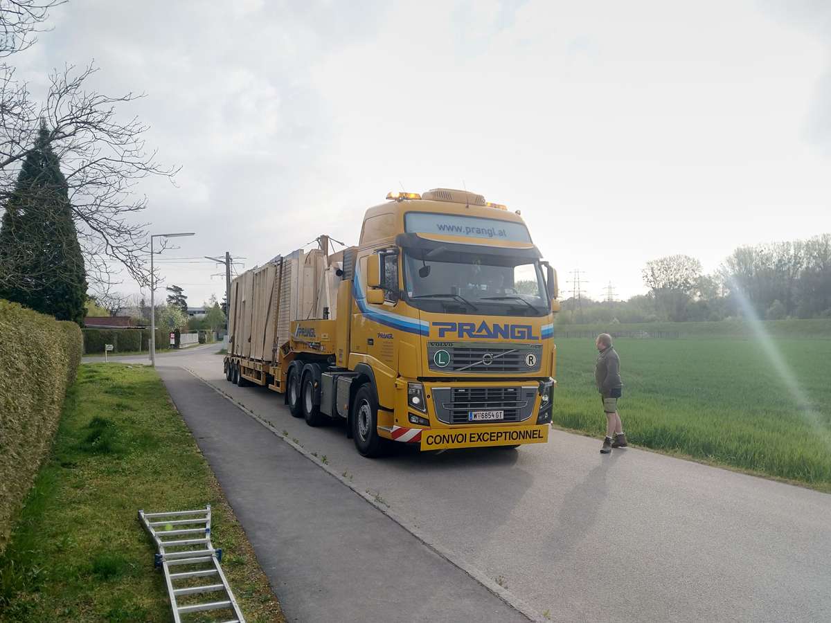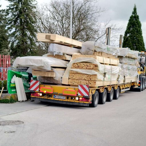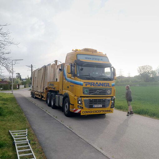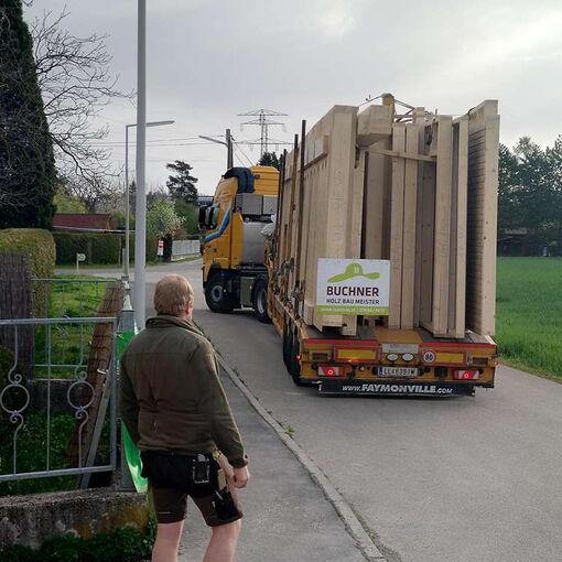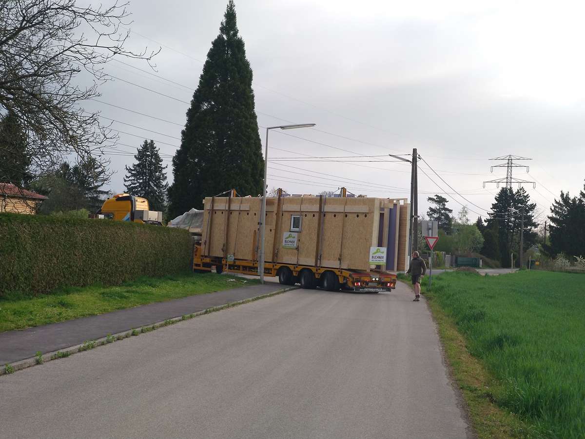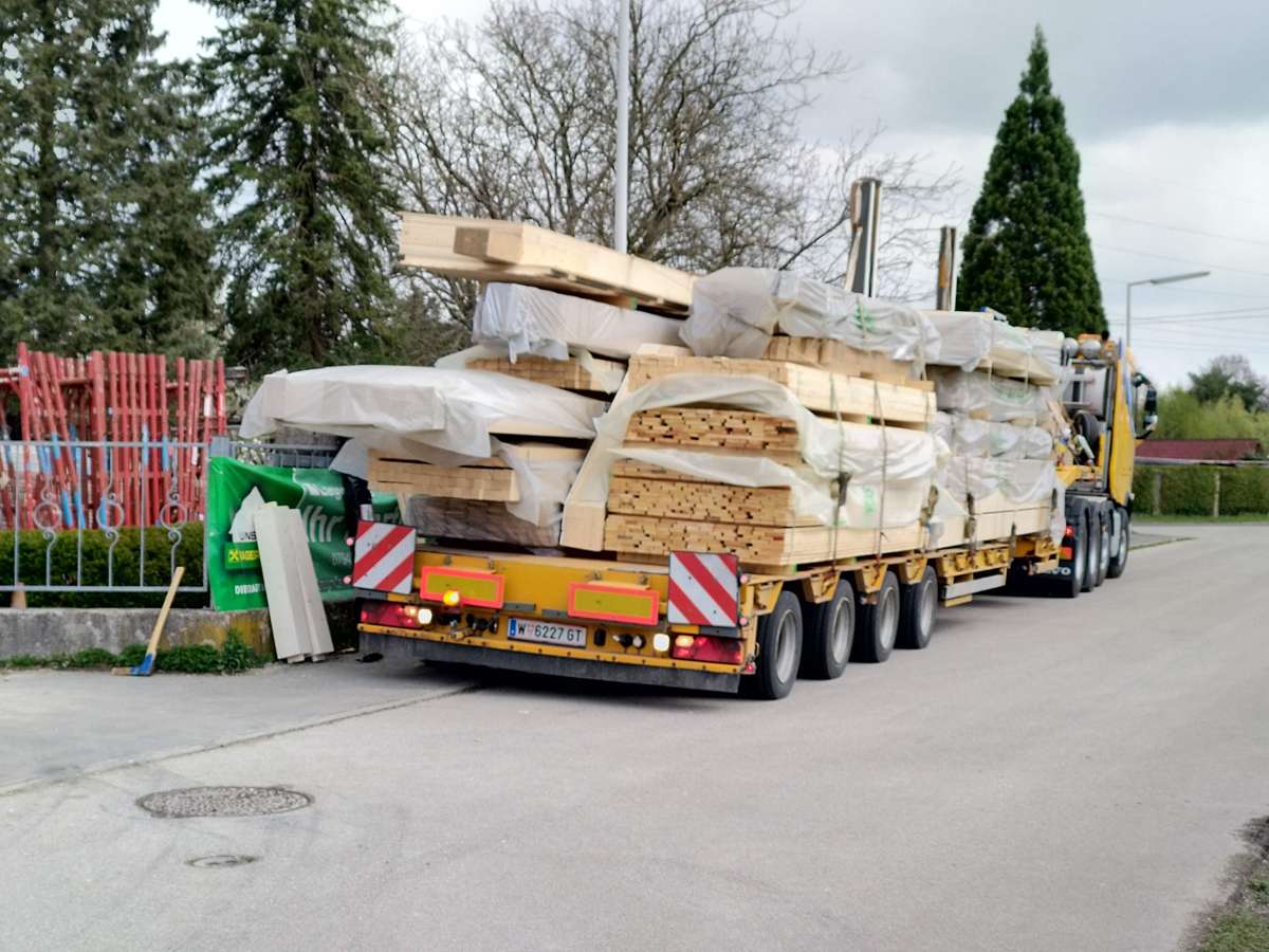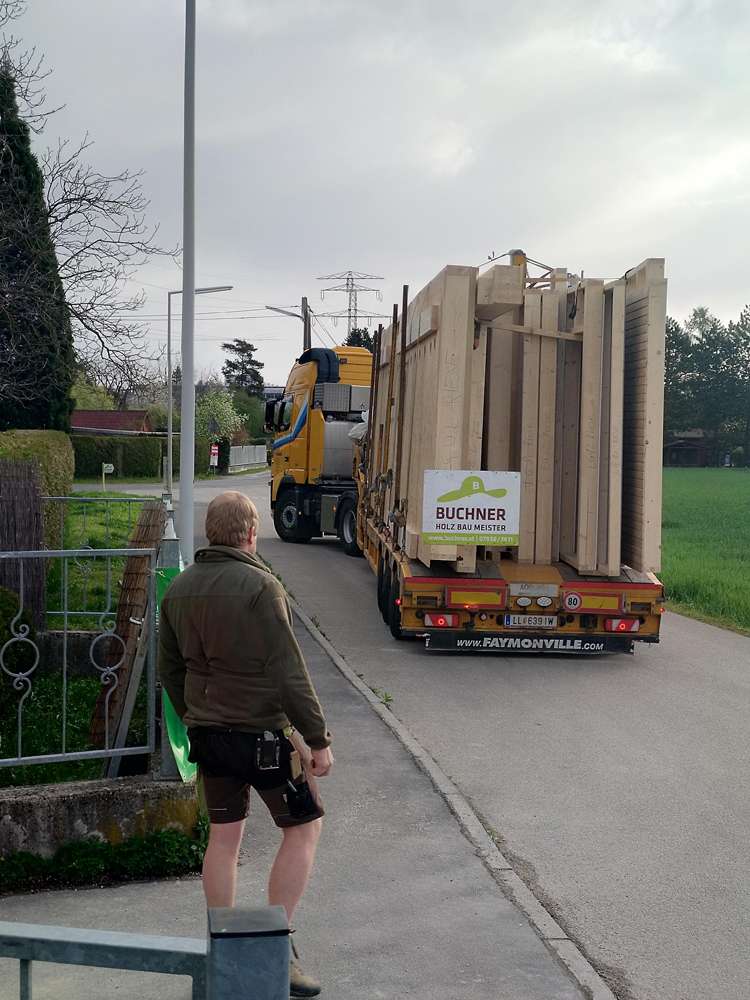 Kurz vor Mittag ist Tieflader Nr. 1 abgeladen, Nr. 2 steht, mit einer Menge Holz beladen, schon in der Warteschlange. Am Nachmittag wird die Tramdecke eingebaut, und am Ende des Tages stehen wir tatsächlich schon fast richtig im Wohnzimmer!