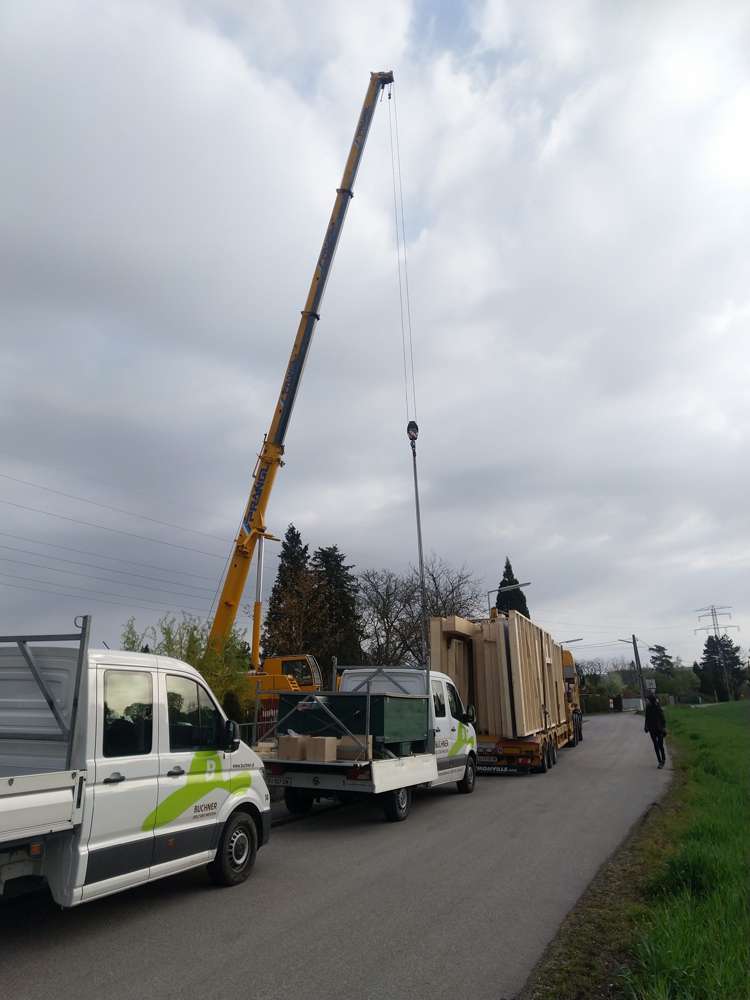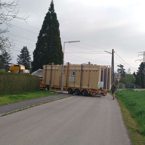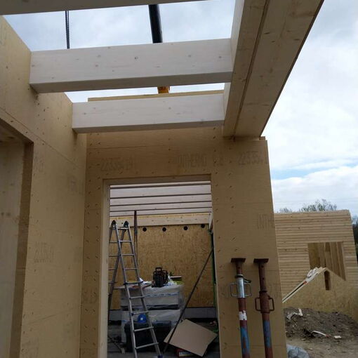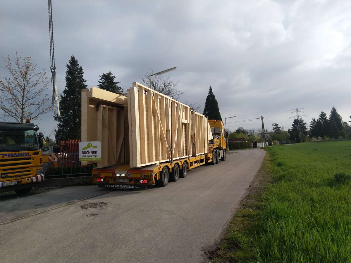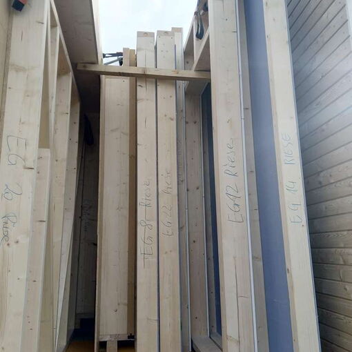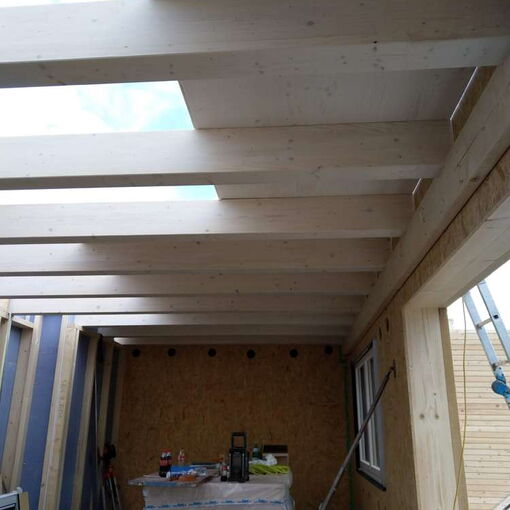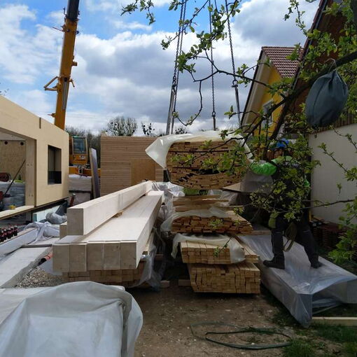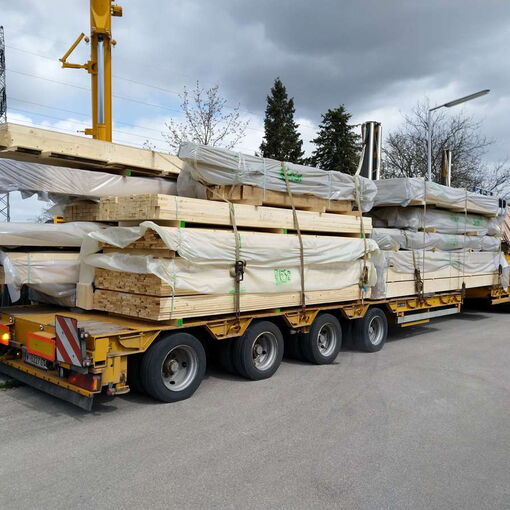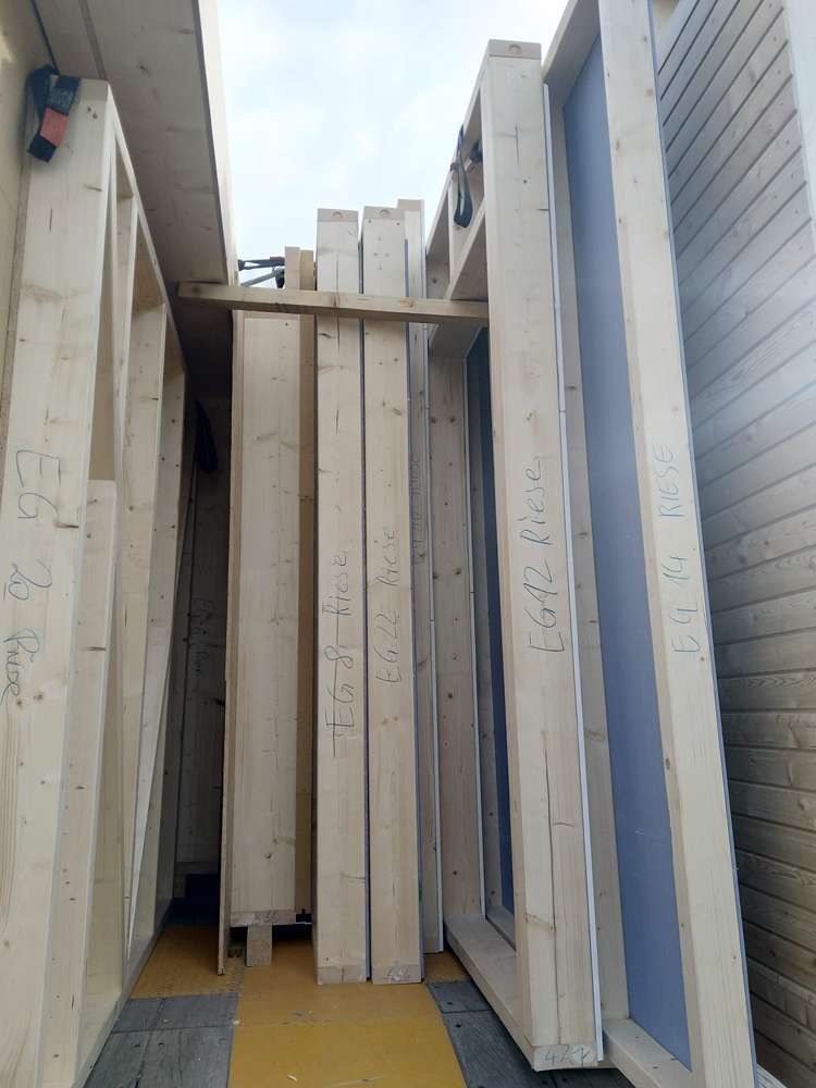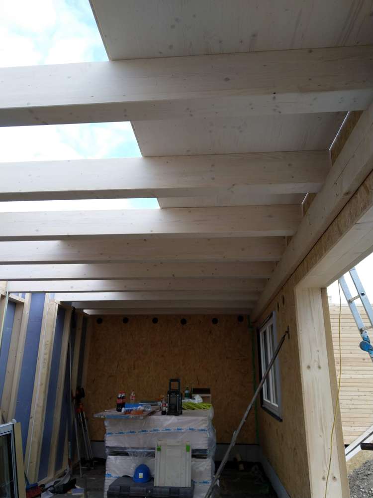 Kurz vor Mittag ist Tieflader Nr. 1 abgeladen, Nr. 2 steht, mit einer Menge Holz beladen, schon in der Warteschlange. Am Nachmittag wird die Tramdecke eingebaut, und am Ende des Tages stehen wir tatsächlich schon fast richtig im Wohnzimmer!