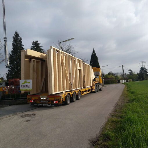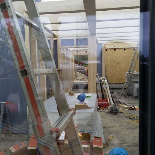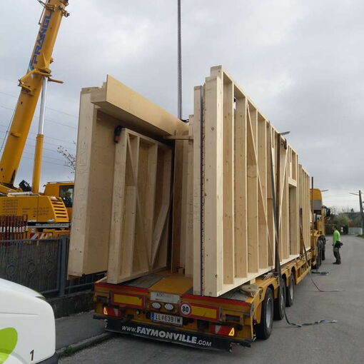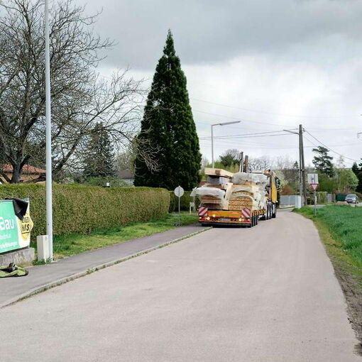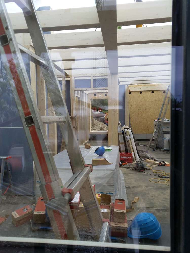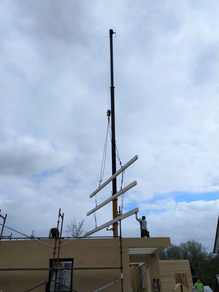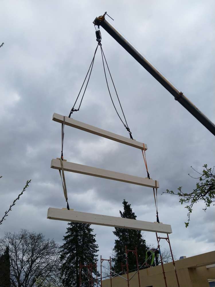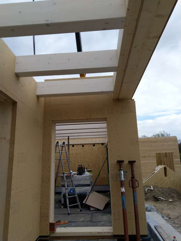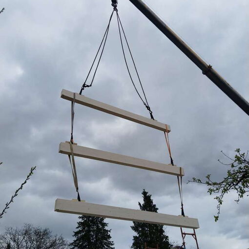 Kurz vor Mittag ist Tieflader Nr. 1 abgeladen, Nr. 2 steht, mit einer Menge Holz beladen, schon in der Warteschlange. Am Nachmittag wird die Tramdecke eingebaut, und am Ende des Tages stehen wir tatsächlich schon fast richtig im Wohnzimmer!
