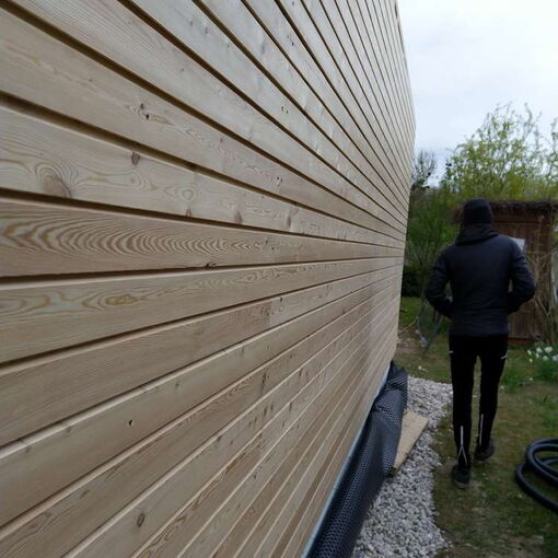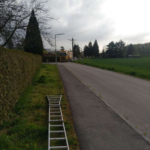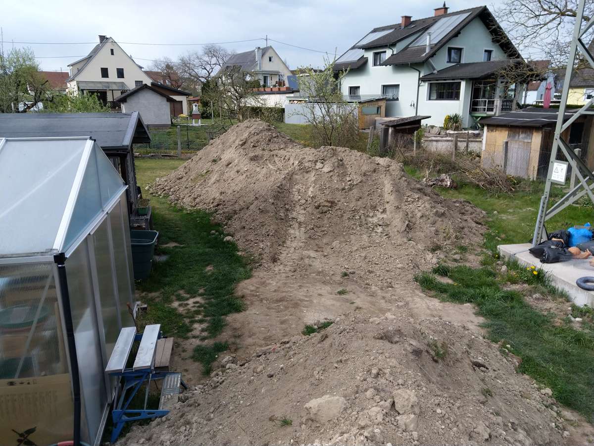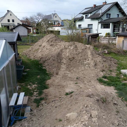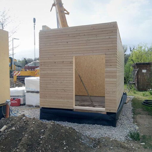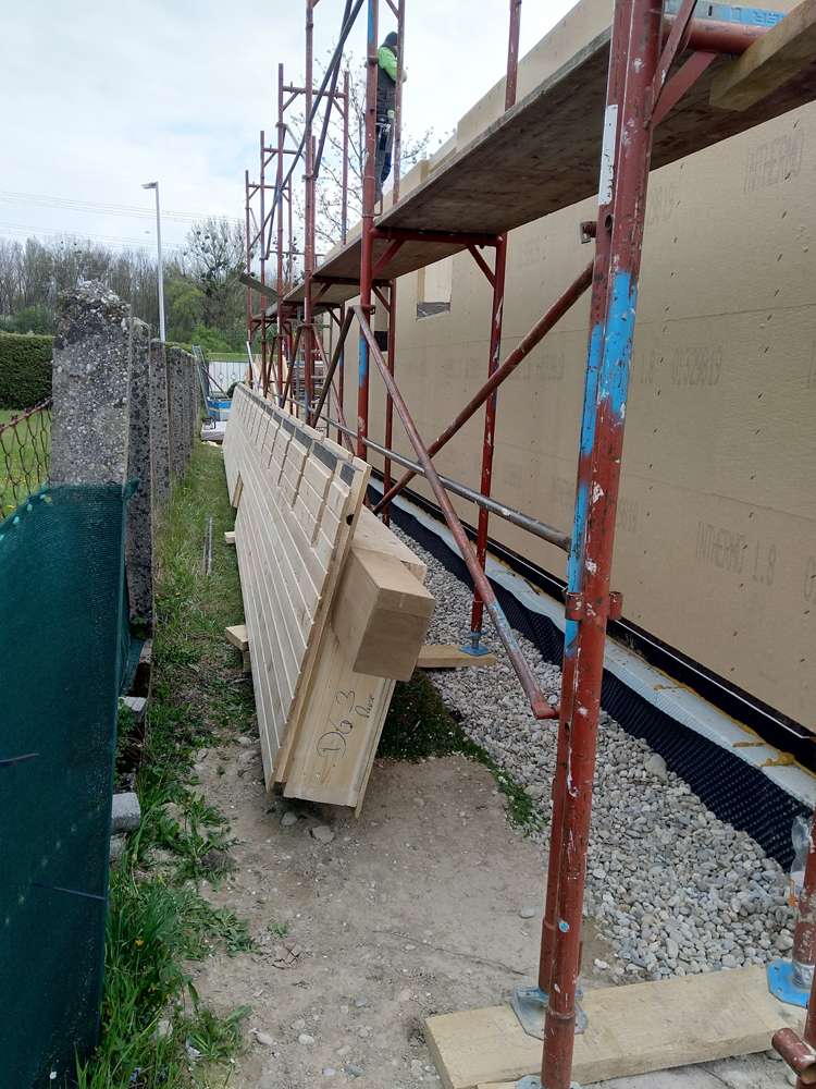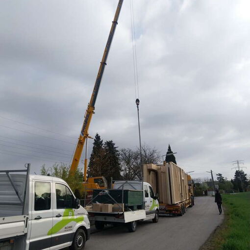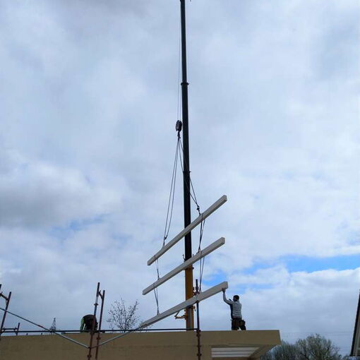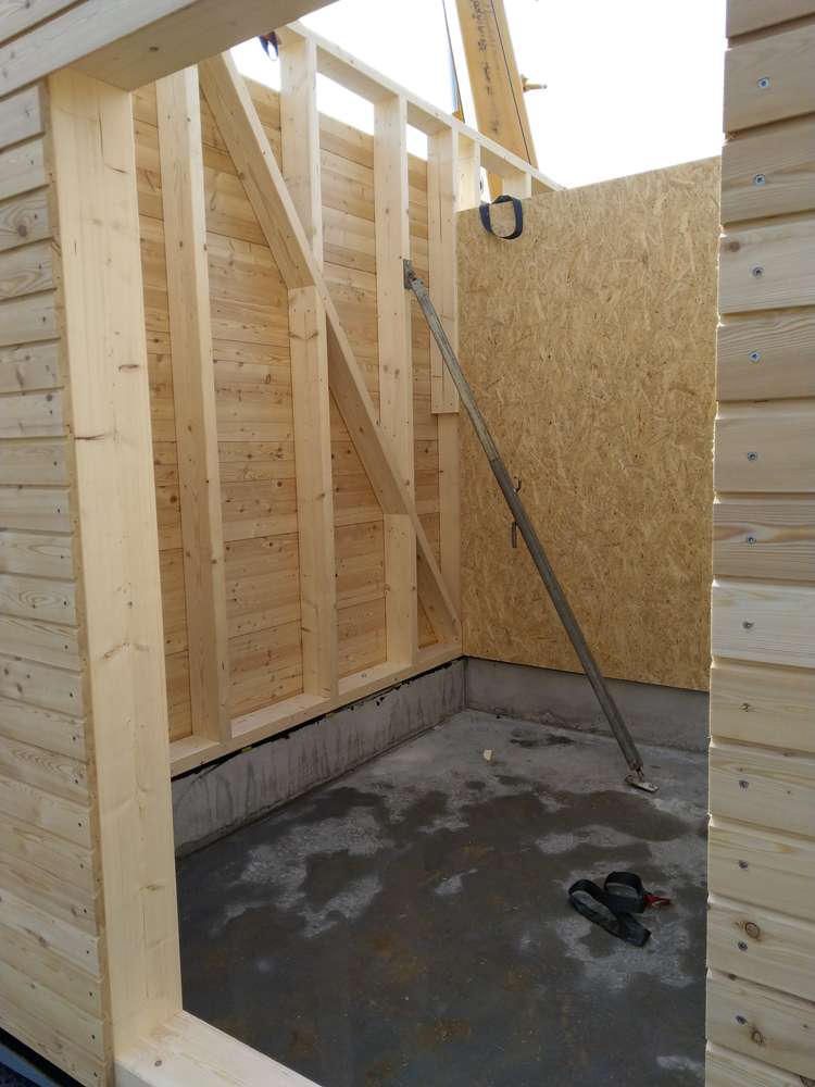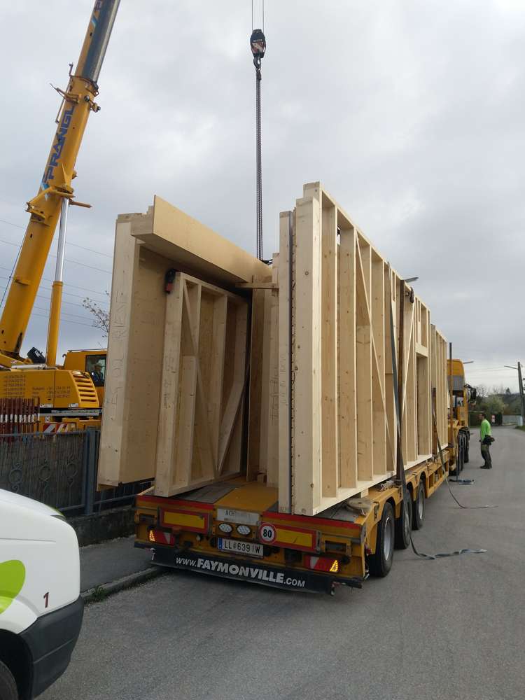 Kurz vor Mittag ist Tieflader Nr. 1 abgeladen, Nr. 2 steht, mit einer Menge Holz beladen, schon in der Warteschlange. Am Nachmittag wird die Tramdecke eingebaut, und am Ende des Tages stehen wir tatsächlich schon fast richtig im Wohnzimmer!
