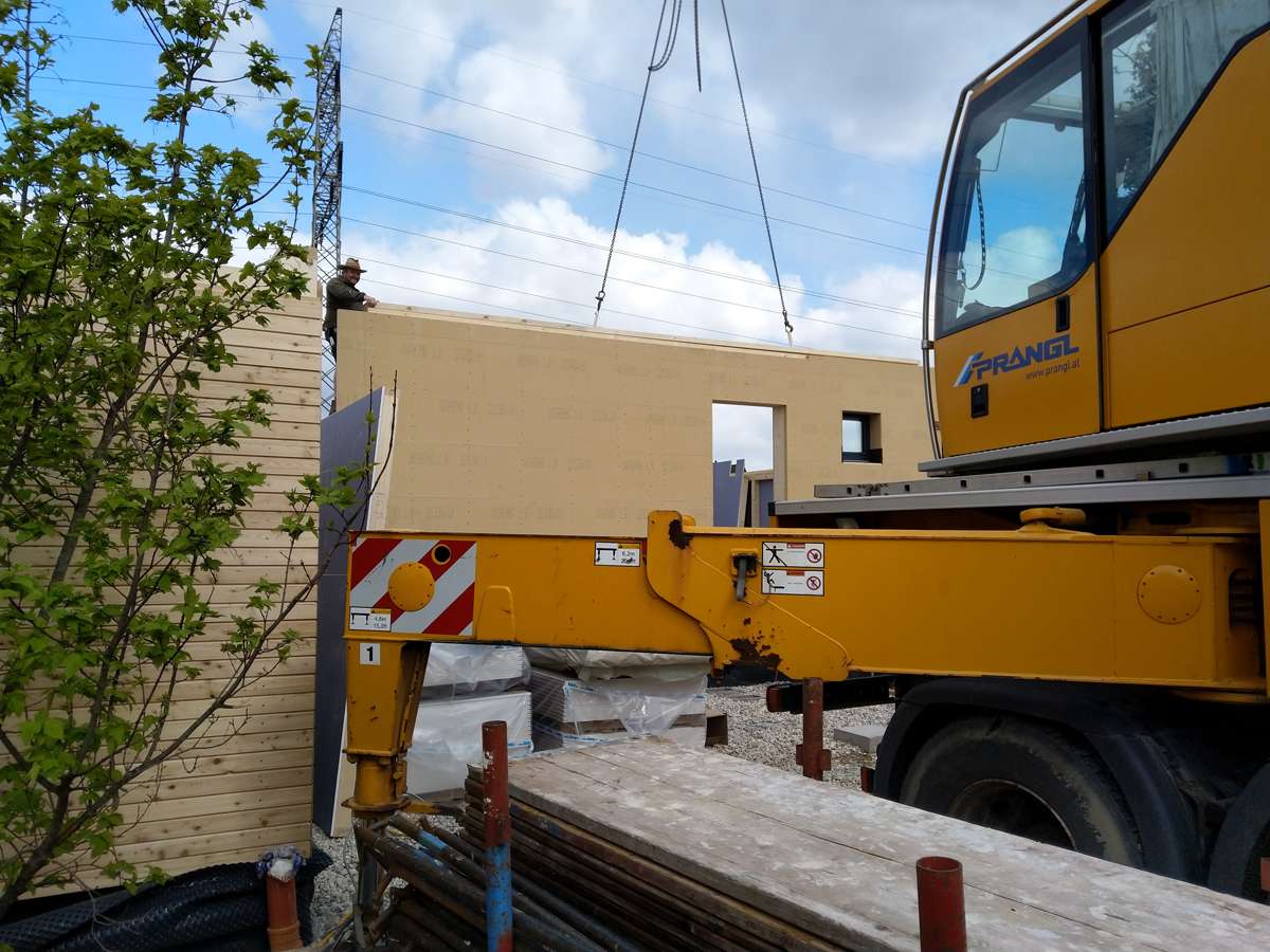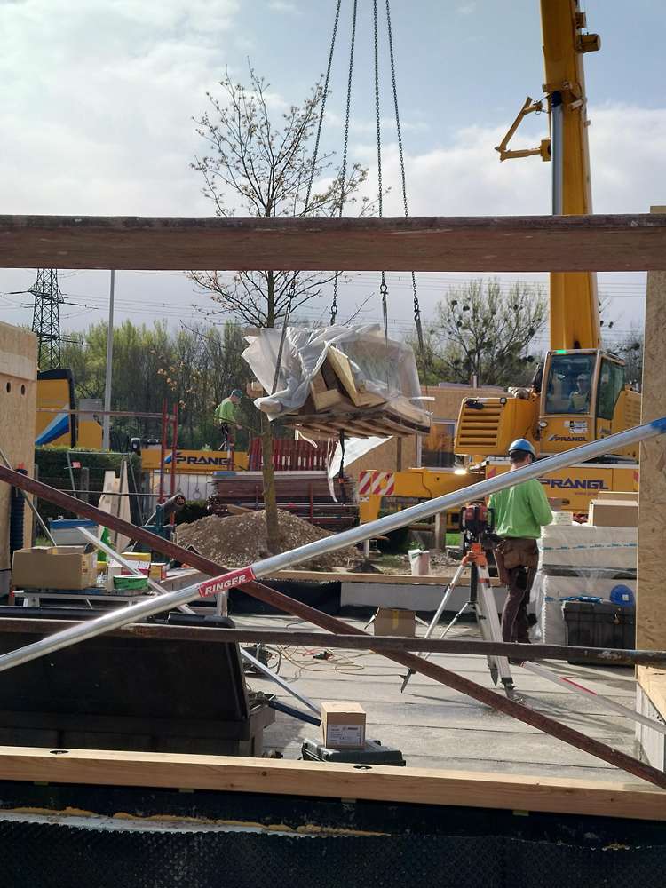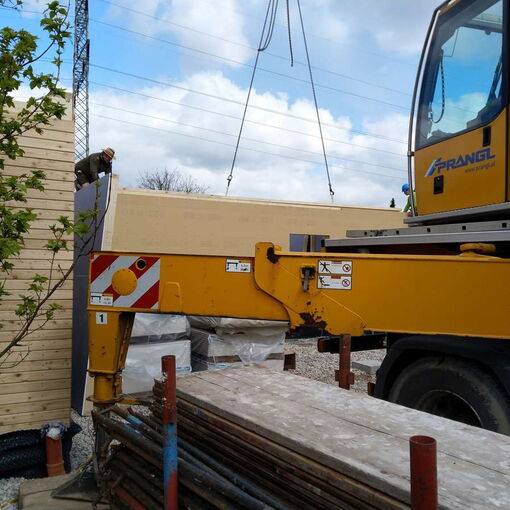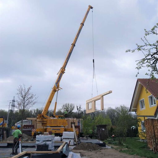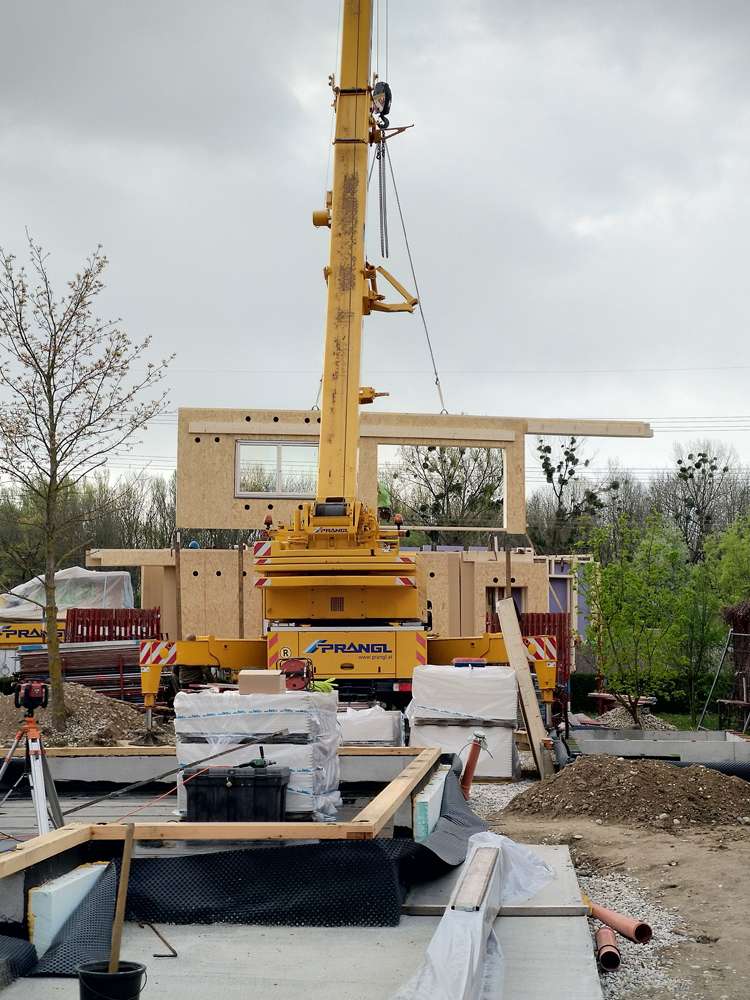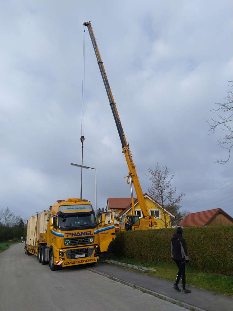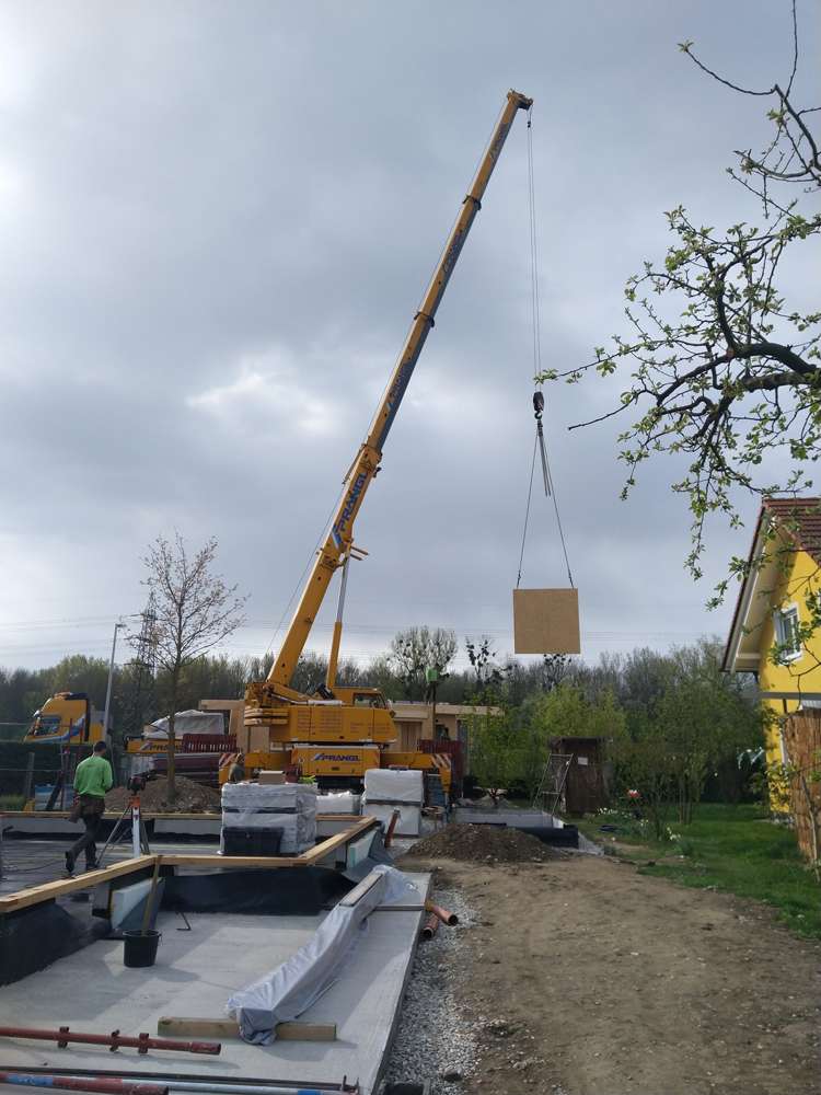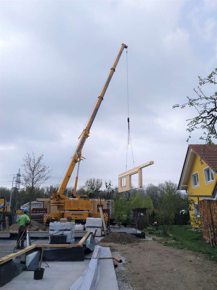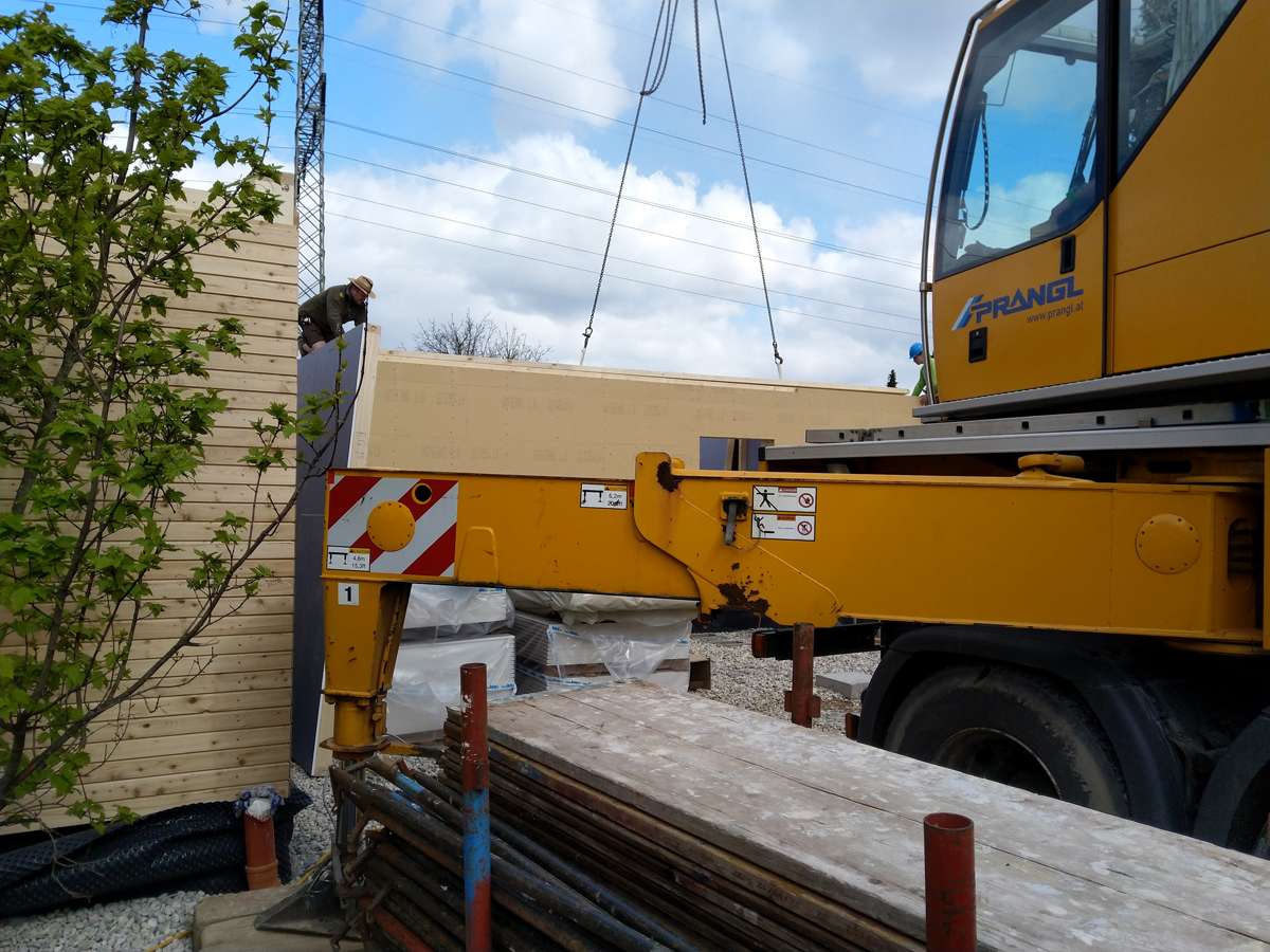 Der Teleskopkran ist schon startbereit, und bald kommt schon der erste Tieflader mit den Wänden für das Erdgeschoß. Eine Wand nach der anderen wird an Ort und Stelle gehoben und festgezurrt. Wir schauen gebannt zu und hoffen, dass uns kein Trum auf den Kopf fällt. Ein wirklich spannender Tag, nur das Wetter lässt zu wünschen übrig. Es ist saukalt und wir müssen uns immer wieder im Glashaus aufwärmen. Unser Polier trotzt den arktischen Temperaturen in der kurzen Lederhose ...