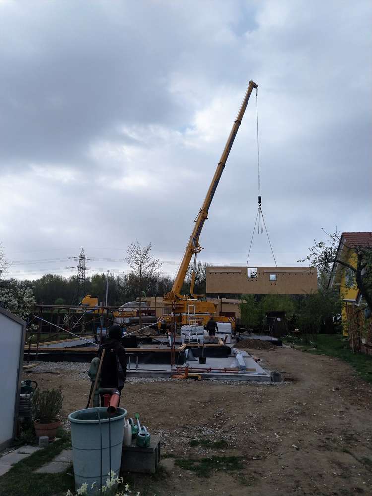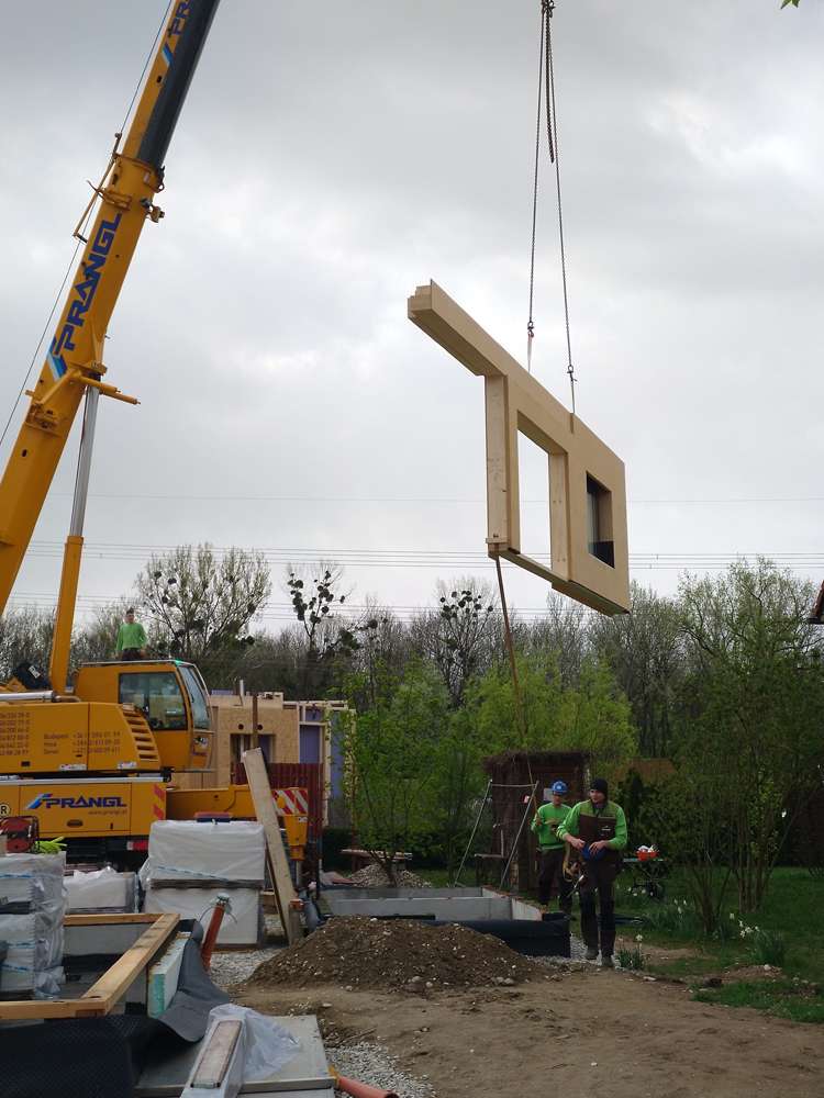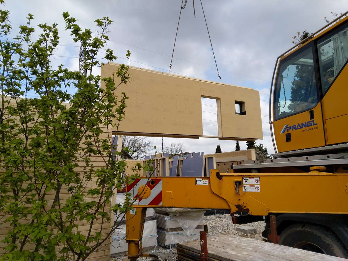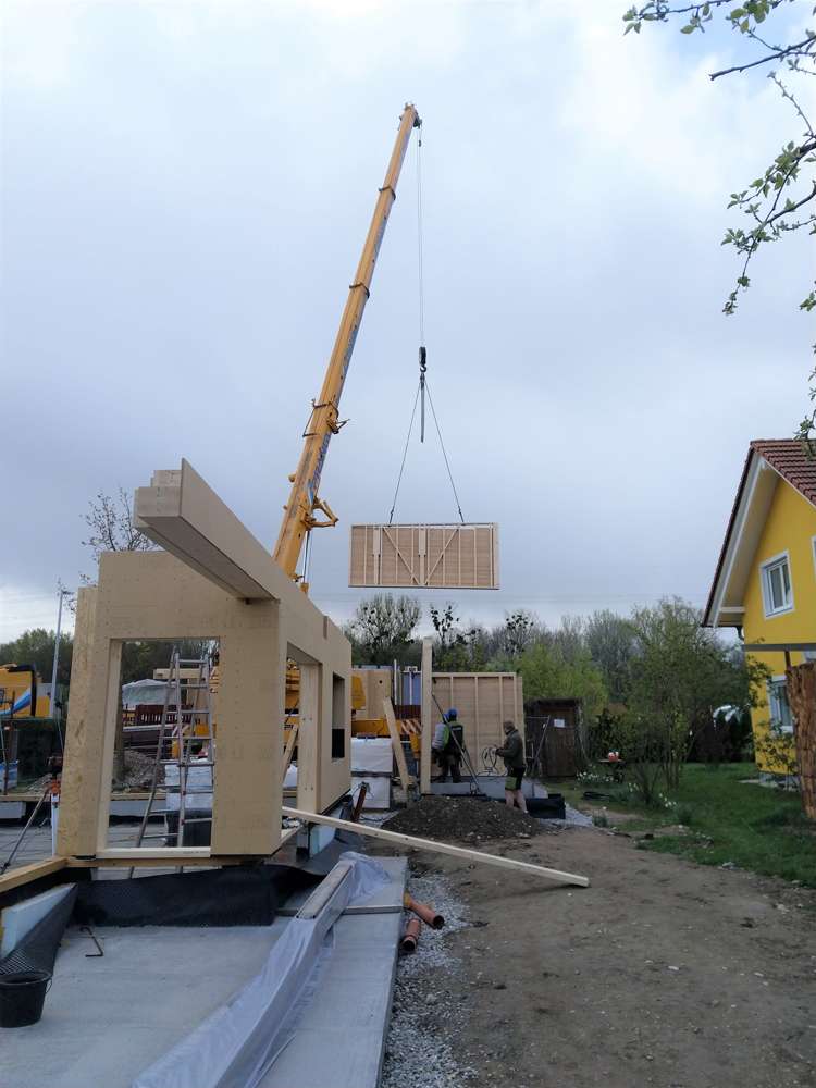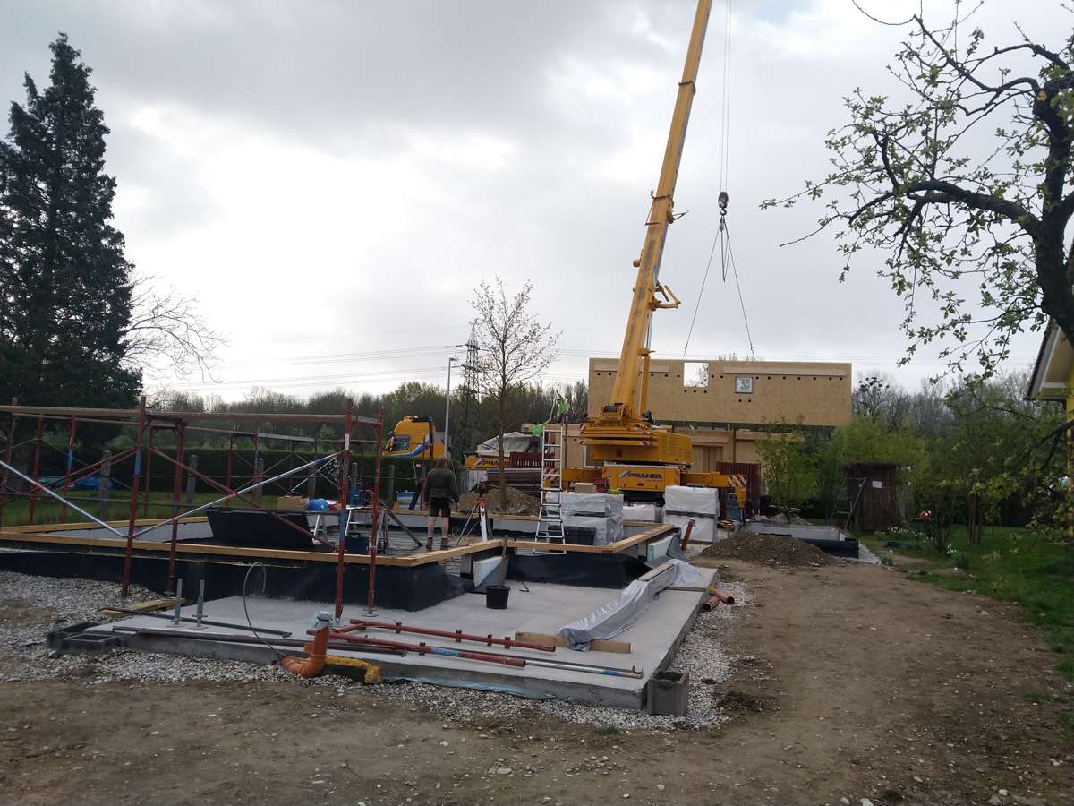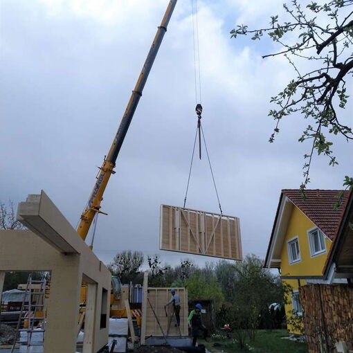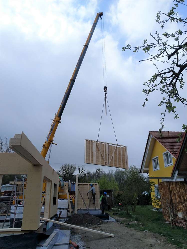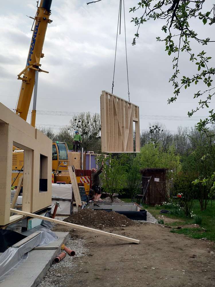 Der Teleskopkran ist schon startbereit, und bald kommt schon der erste Tieflader mit den Wänden für das Erdgeschoß. Eine Wand nach der anderen wird an Ort und Stelle gehoben und festgezurrt. Wir schauen gebannt zu und hoffen, dass uns kein Trum auf den Kopf fällt. Ein wirklich spannender Tag, nur das Wetter lässt zu wünschen übrig. Es ist saukalt und wir müssen uns immer wieder im Glashaus aufwärmen. Unser Polier trotzt den arktischen Temperaturen in der kurzen Lederhose ...