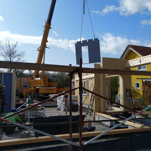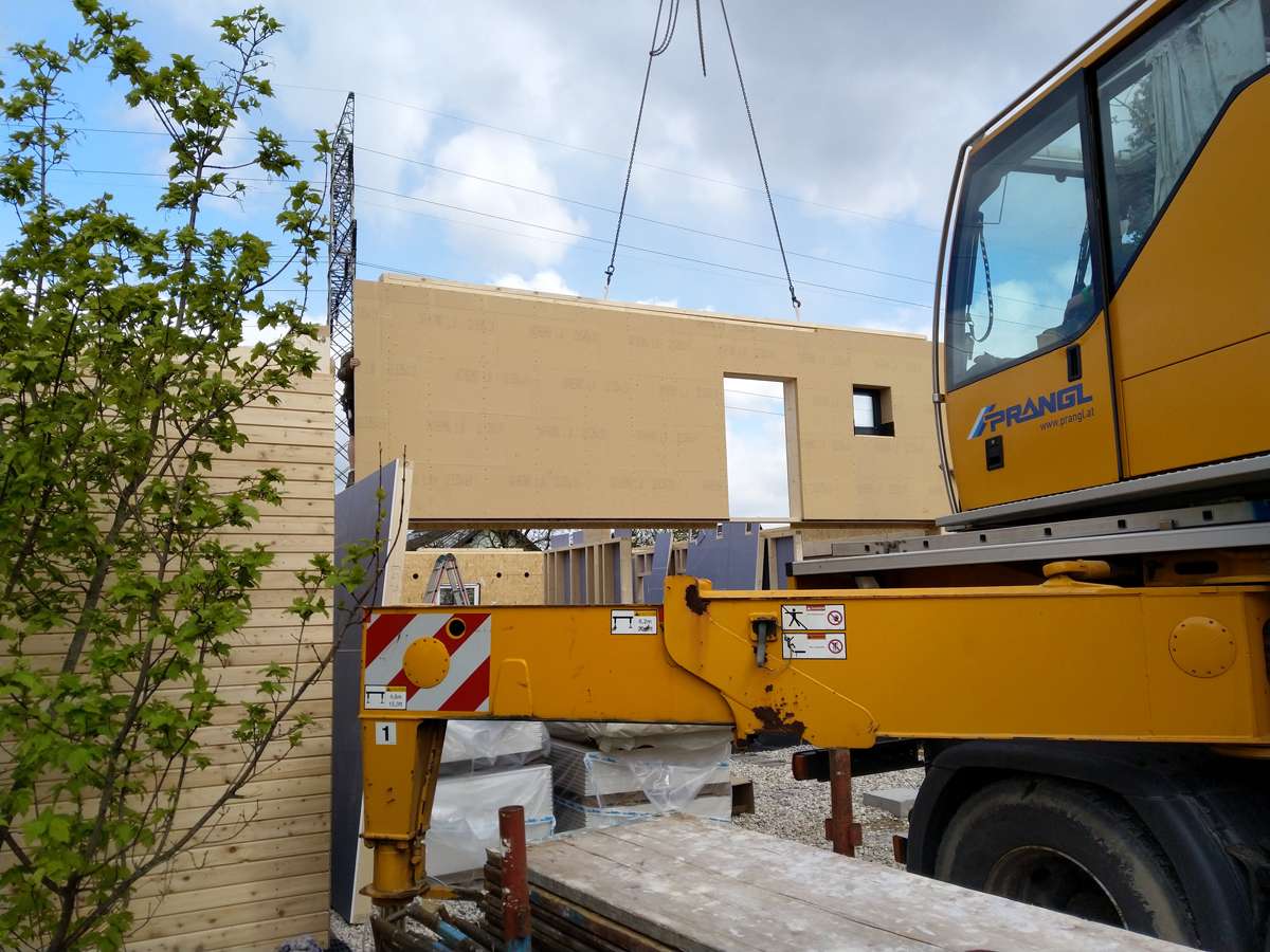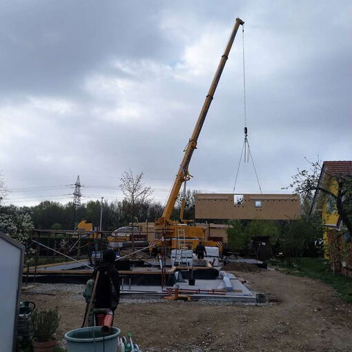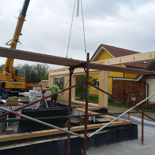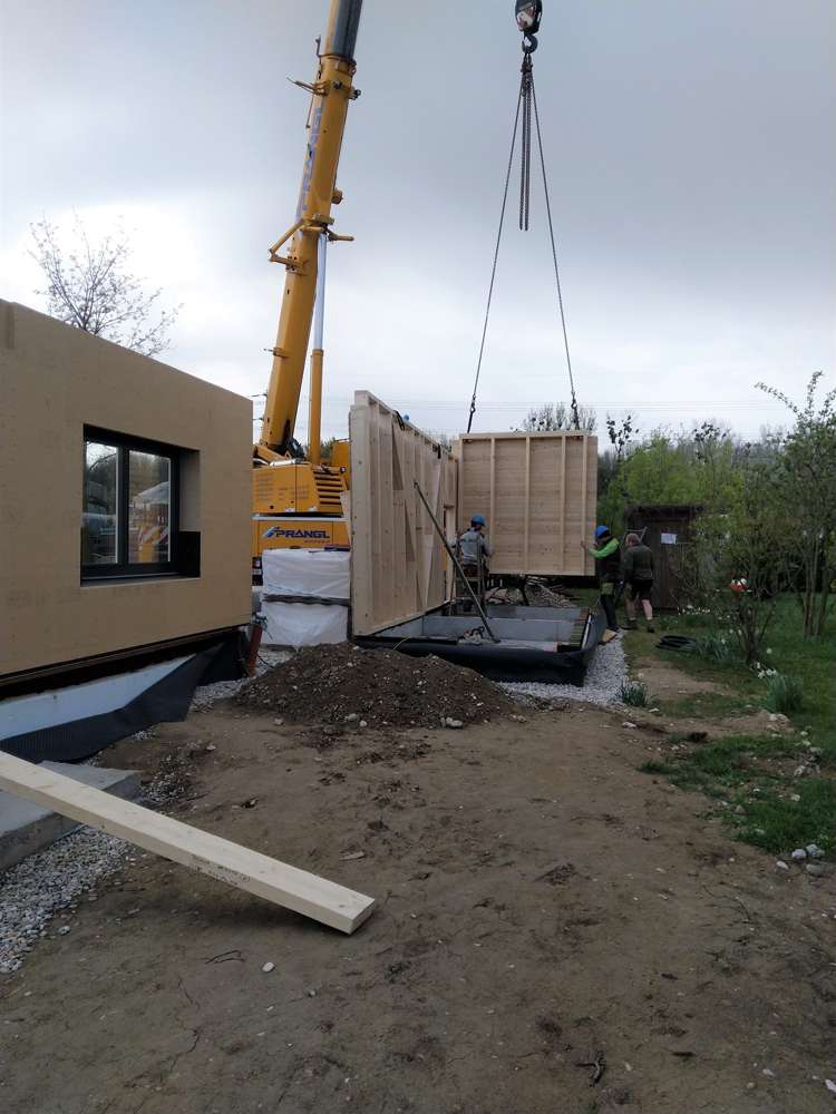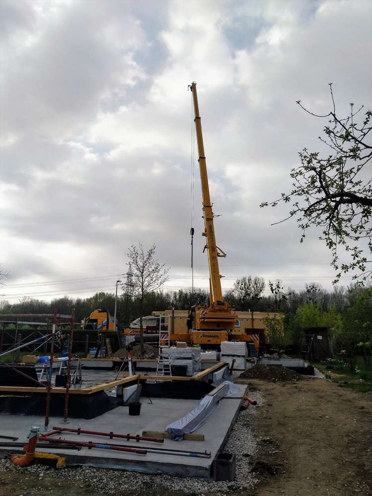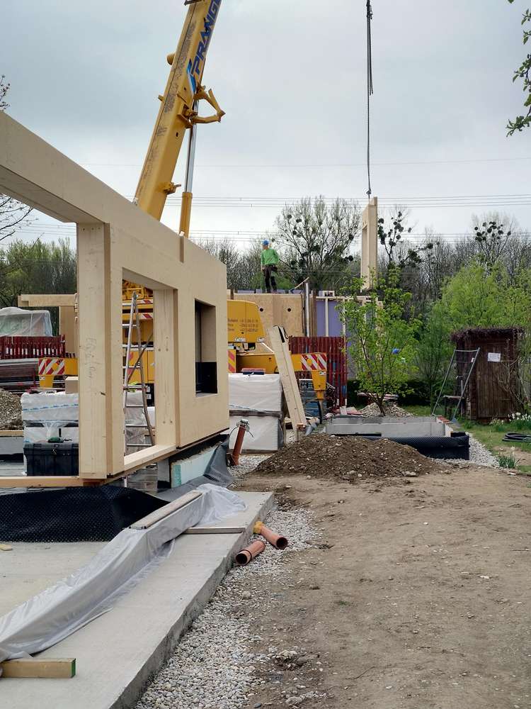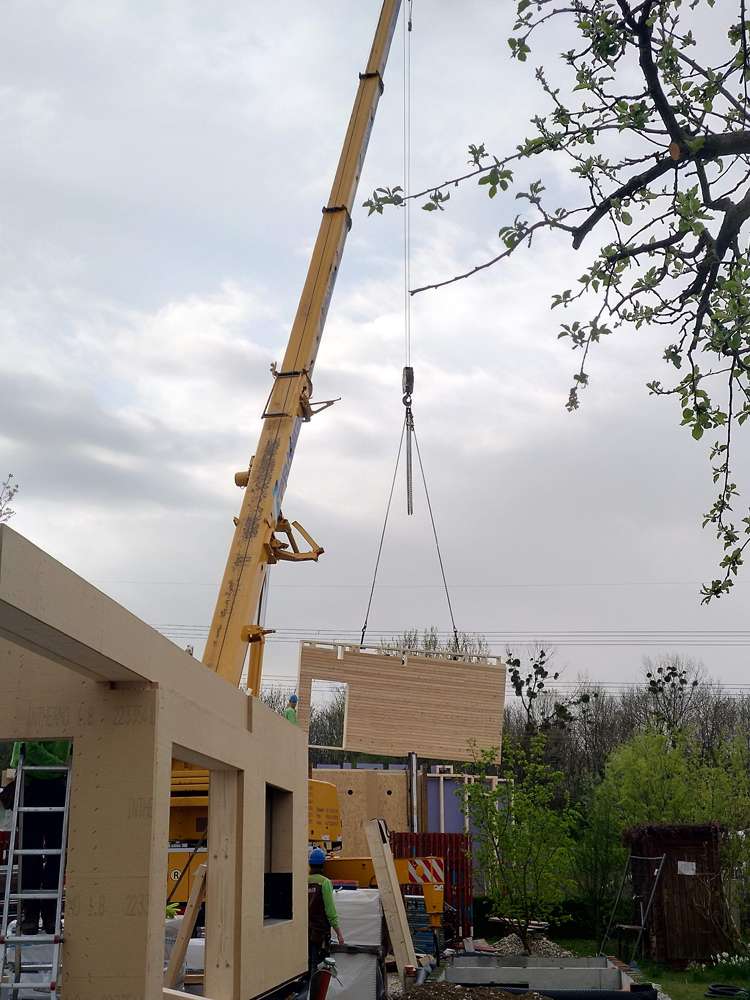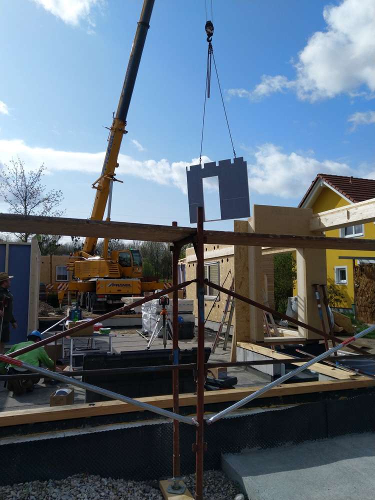 Der Teleskopkran ist schon startbereit, und bald kommt schon der erste Tieflader mit den Wänden für das Erdgeschoß. Eine Wand nach der anderen wird an Ort und Stelle gehoben und festgezurrt. Wir schauen gebannt zu und hoffen, dass uns kein Trum auf den Kopf fällt. Ein wirklich spannender Tag, nur das Wetter lässt zu wünschen übrig. Es ist saukalt und wir müssen uns immer wieder im Glashaus aufwärmen. Unser Polier trotzt den arktischen Temperaturen in der kurzen Lederhose ...