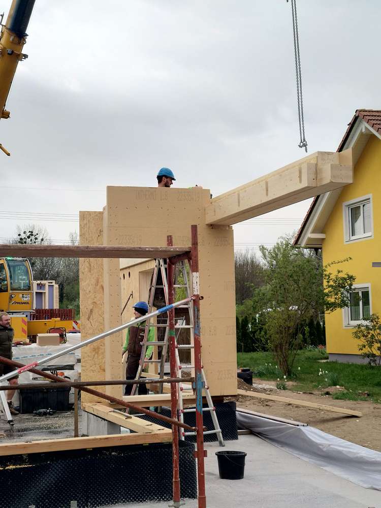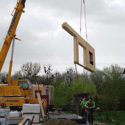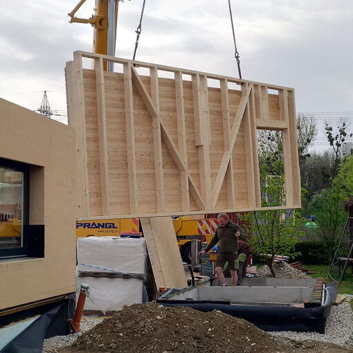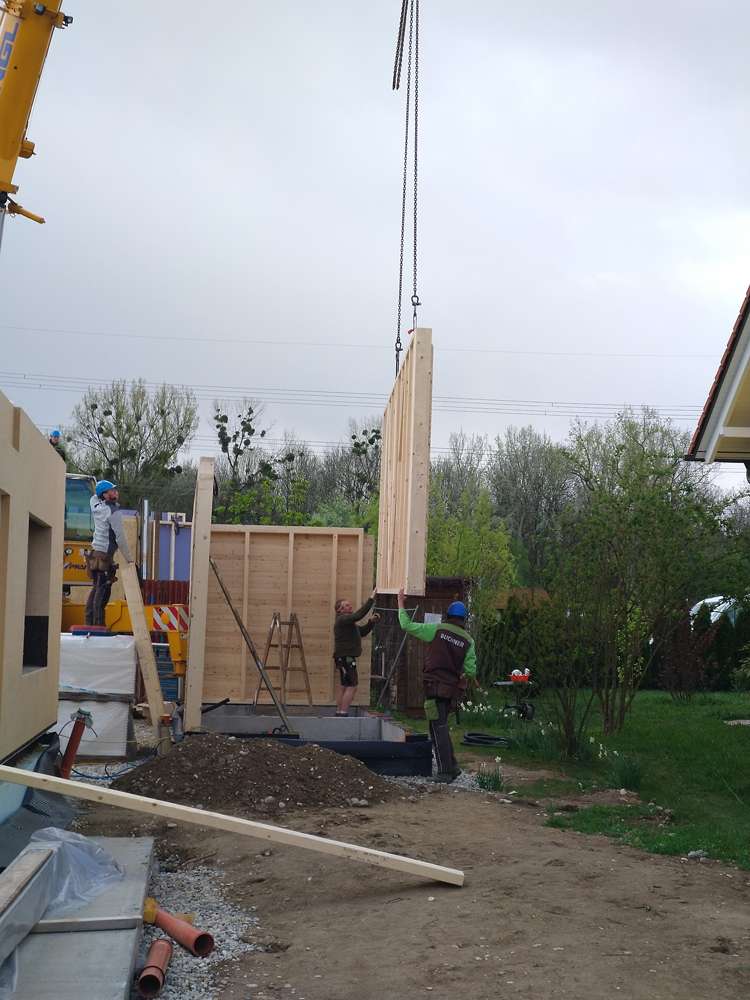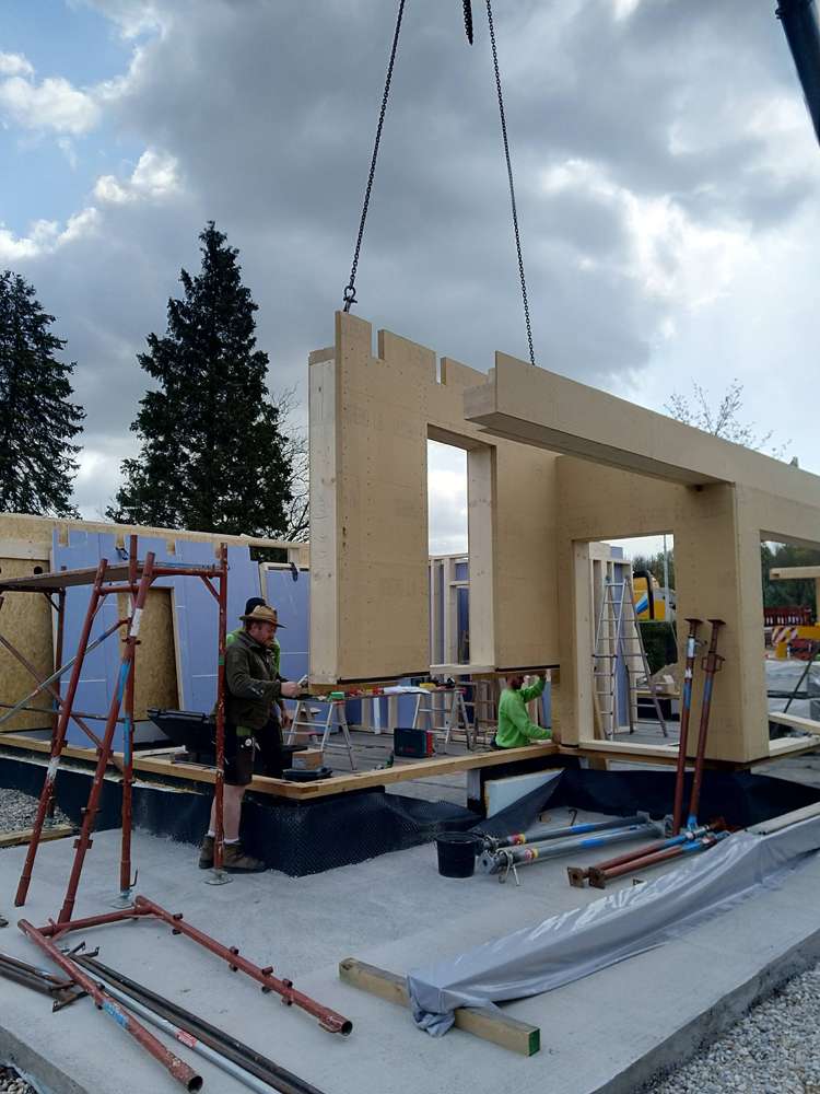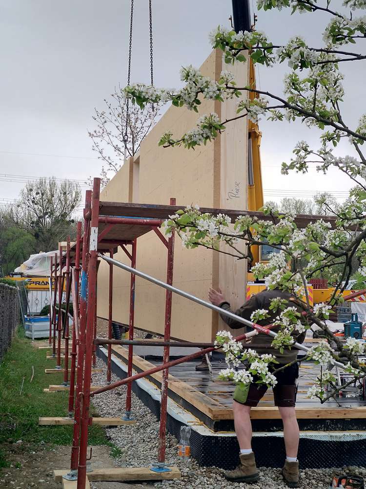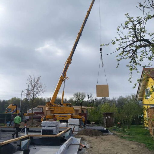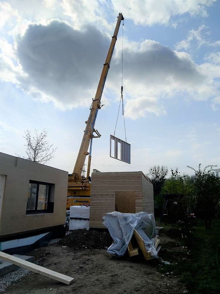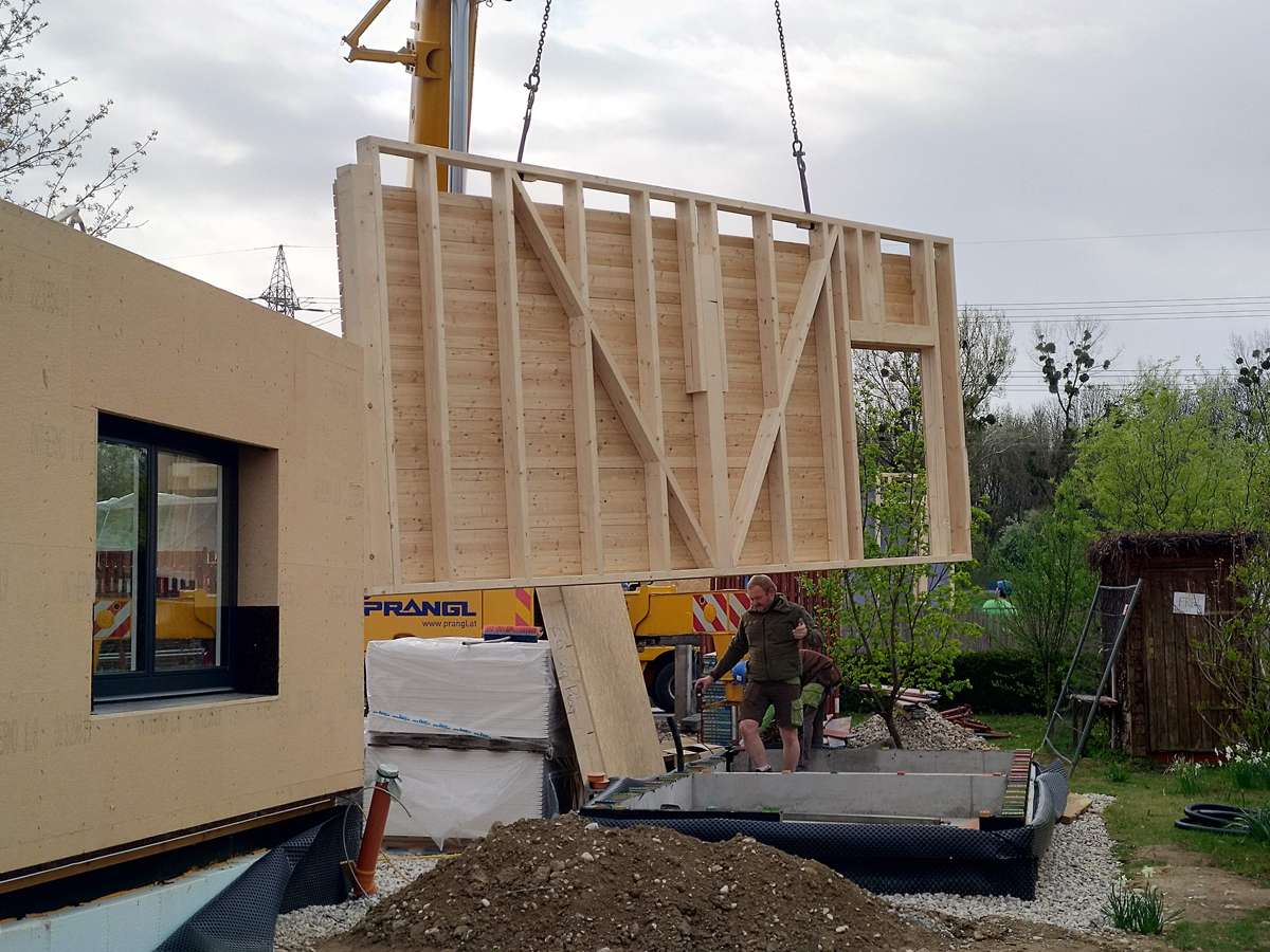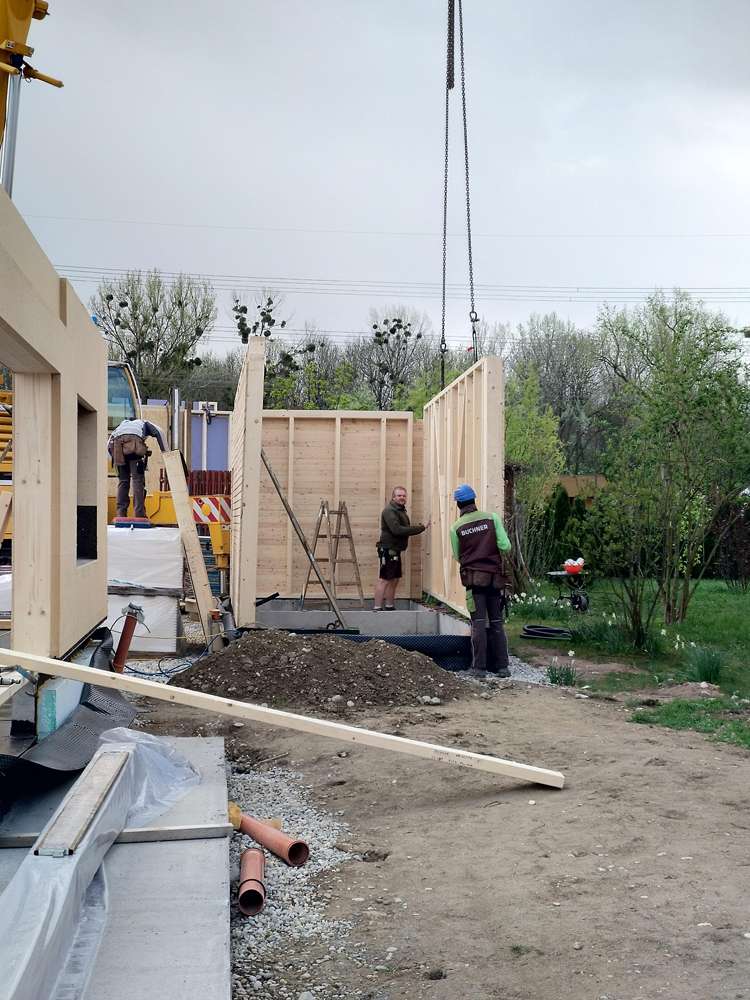 Der Teleskopkran ist schon startbereit, und bald kommt schon der erste Tieflader mit den Wänden für das Erdgeschoß. Eine Wand nach der anderen wird an Ort und Stelle gehoben und festgezurrt. Wir schauen gebannt zu und hoffen, dass uns kein Trum auf den Kopf fällt. Ein wirklich spannender Tag, nur das Wetter lässt zu wünschen übrig. Es ist saukalt und wir müssen uns immer wieder im Glashaus aufwärmen. Unser Polier trotzt den arktischen Temperaturen in der kurzen Lederhose ...