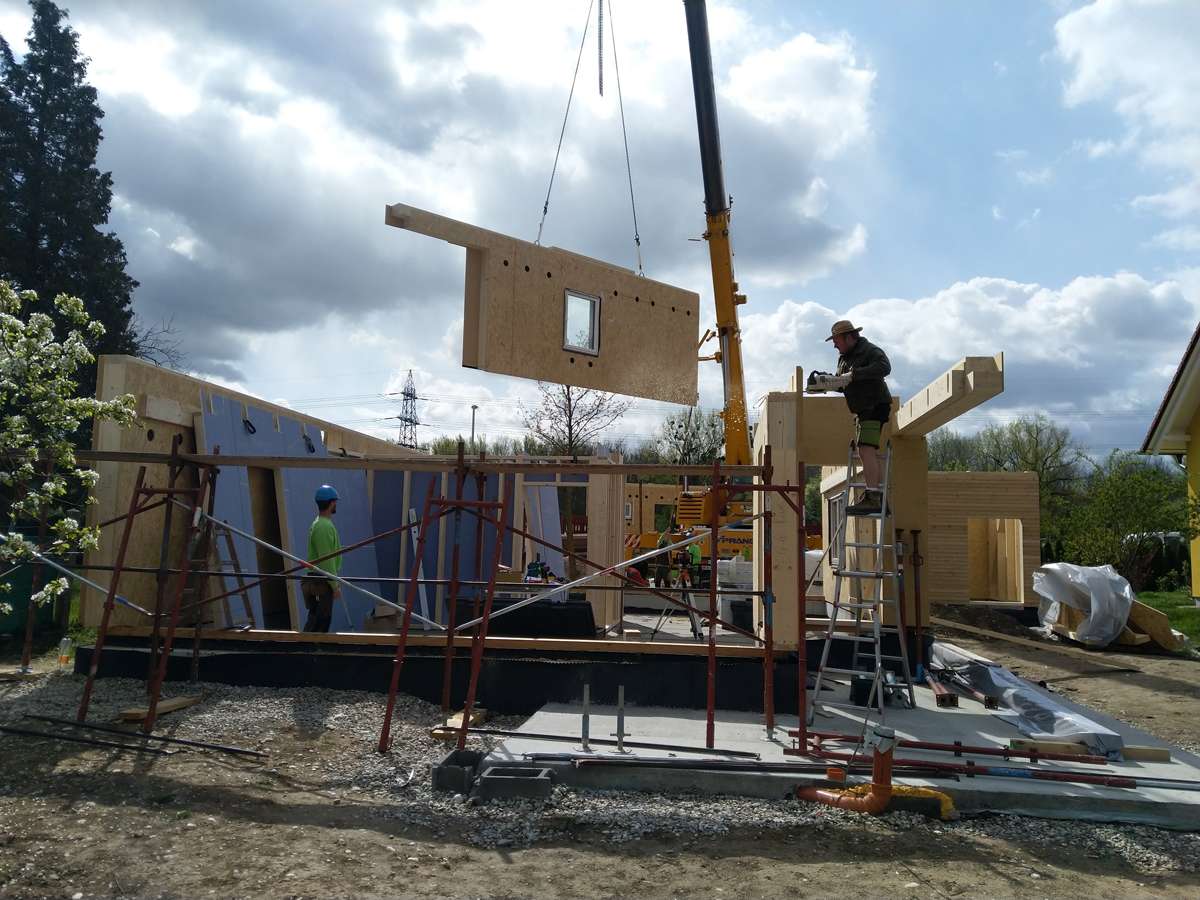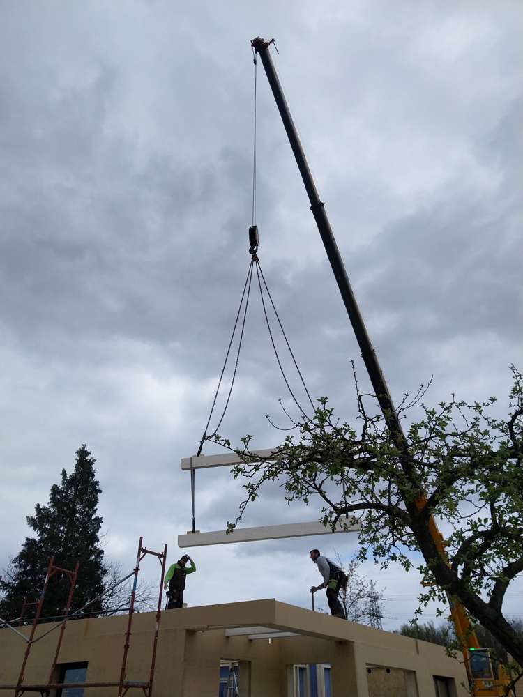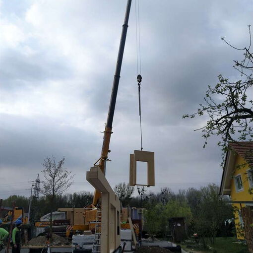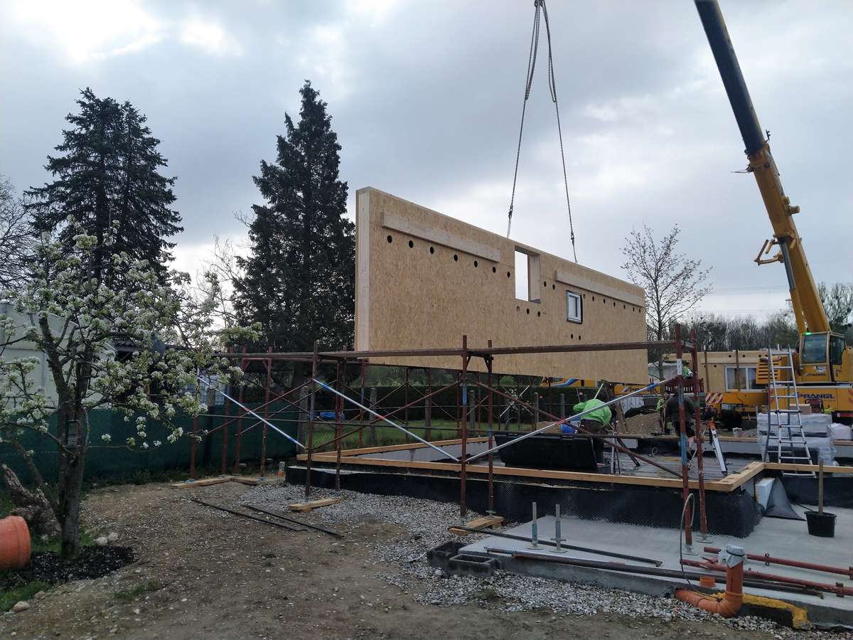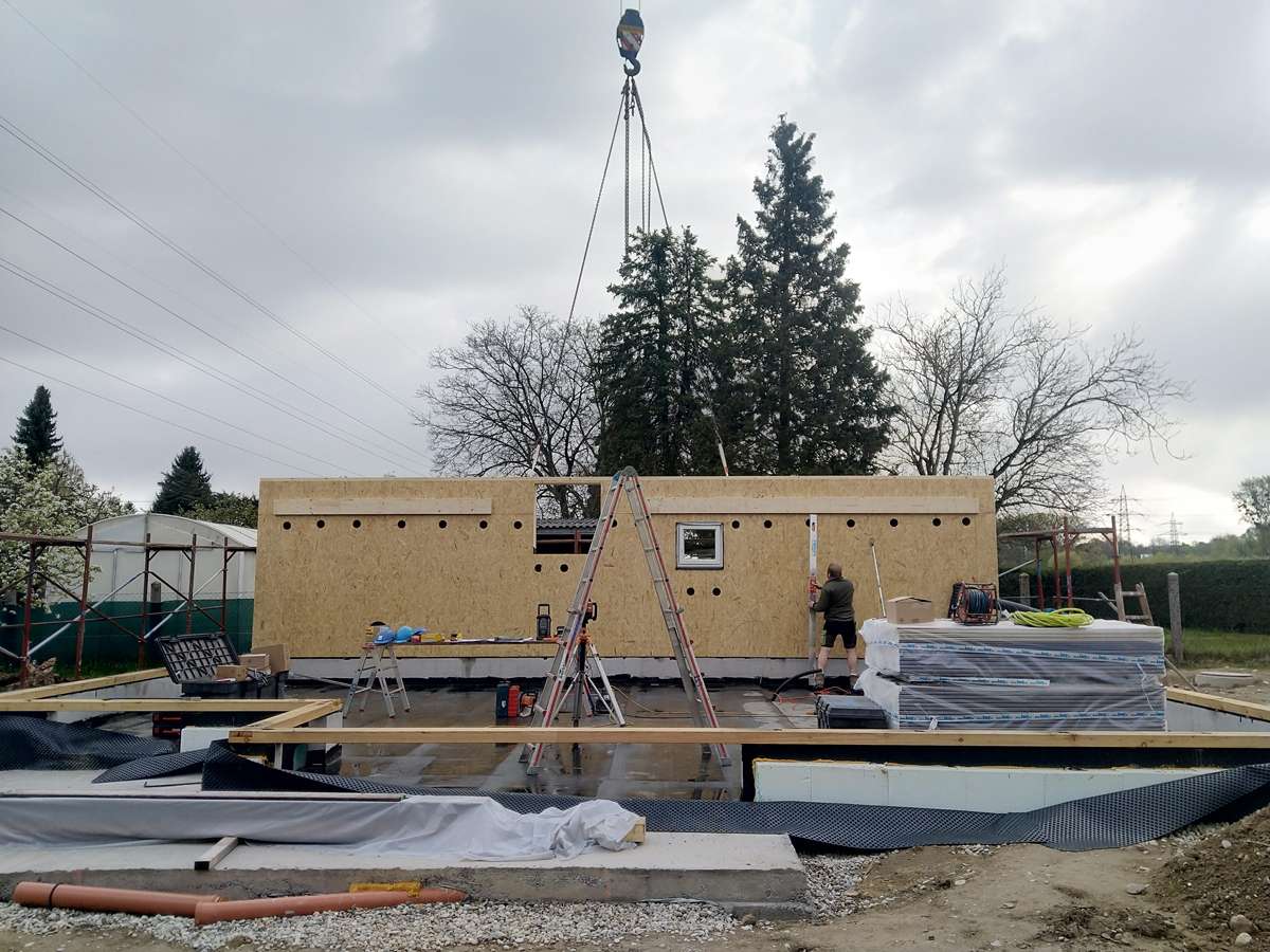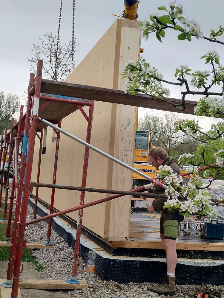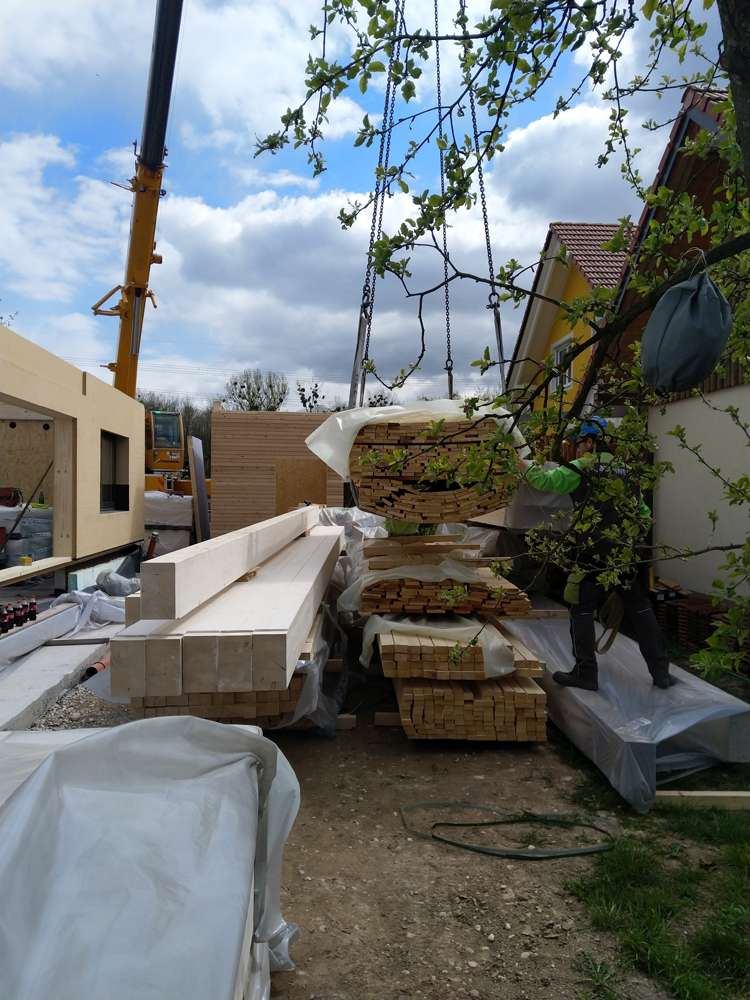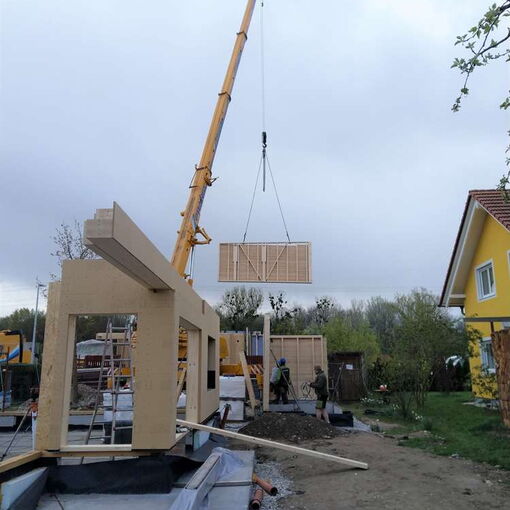 Der Teleskopkran ist schon startbereit, und bald kommt schon der erste Tieflader mit den Wänden für das Erdgeschoß. Eine Wand nach der anderen wird an Ort und Stelle gehoben und festgezurrt. Wir schauen gebannt zu und hoffen, dass uns kein Trum auf den Kopf fällt. Ein wirklich spannender Tag, nur das Wetter lässt zu wünschen übrig. Es ist saukalt und wir müssen uns immer wieder im Glashaus aufwärmen. Unser Polier trotzt den arktischen Temperaturen in der kurzen Lederhose ...