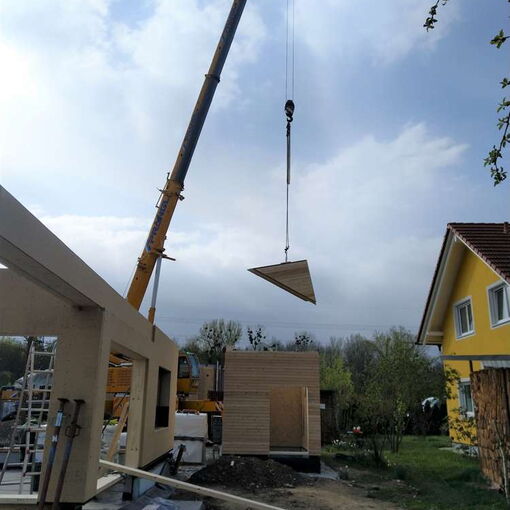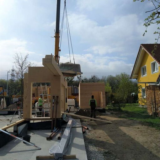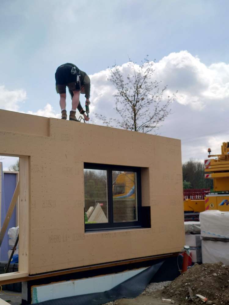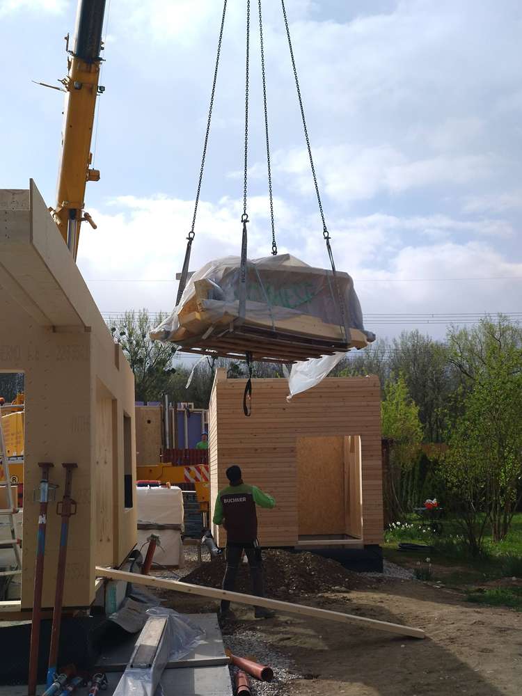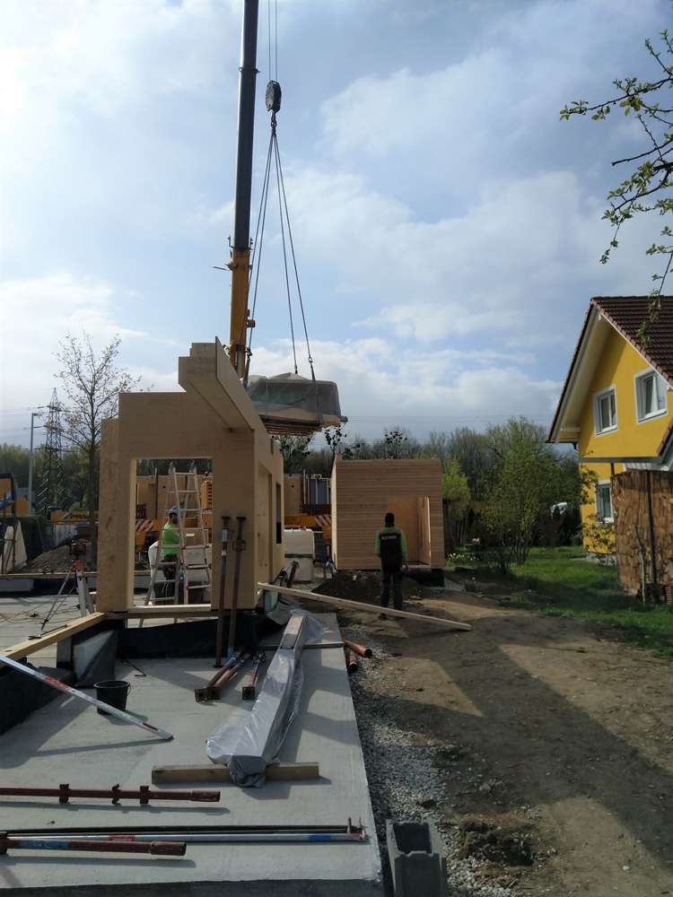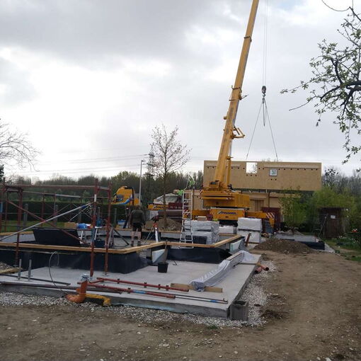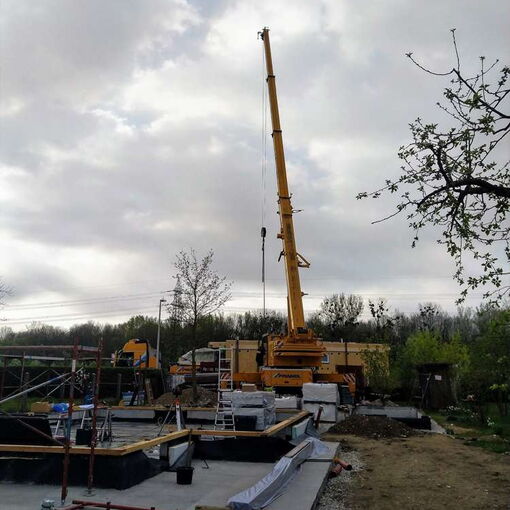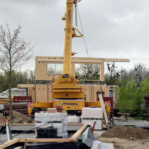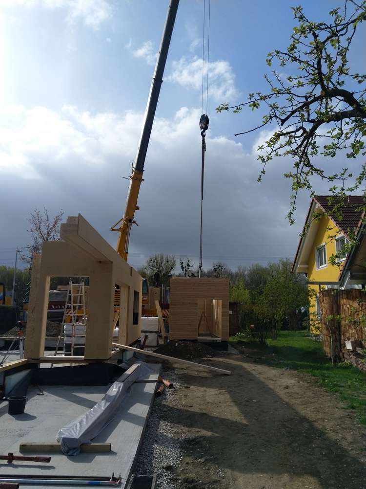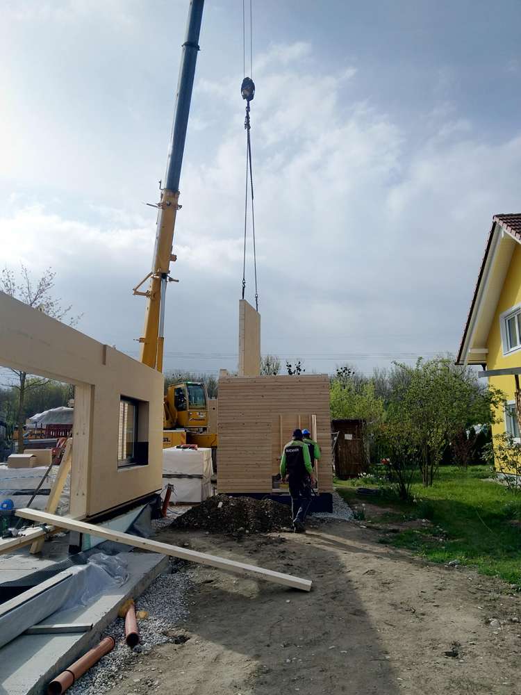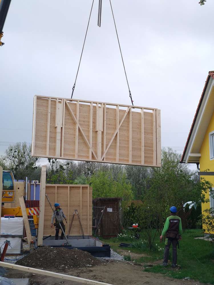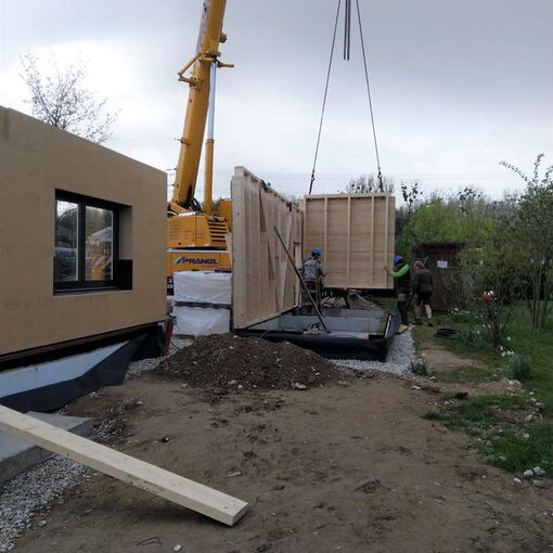 Der Teleskopkran ist schon startbereit, und bald kommt schon der erste Tieflader mit den Wänden für das Erdgeschoß. Eine Wand nach der anderen wird an Ort und Stelle gehoben und festgezurrt. Wir schauen gebannt zu und hoffen, dass uns kein Trum auf den Kopf fällt. Ein wirklich spannender Tag, nur das Wetter lässt zu wünschen übrig. Es ist saukalt und wir müssen uns immer wieder im Glashaus aufwärmen. Unser Polier trotzt den arktischen Temperaturen in der kurzen Lederhose ...