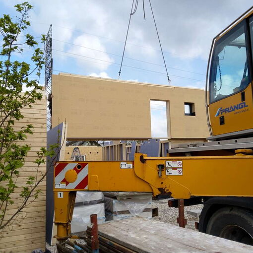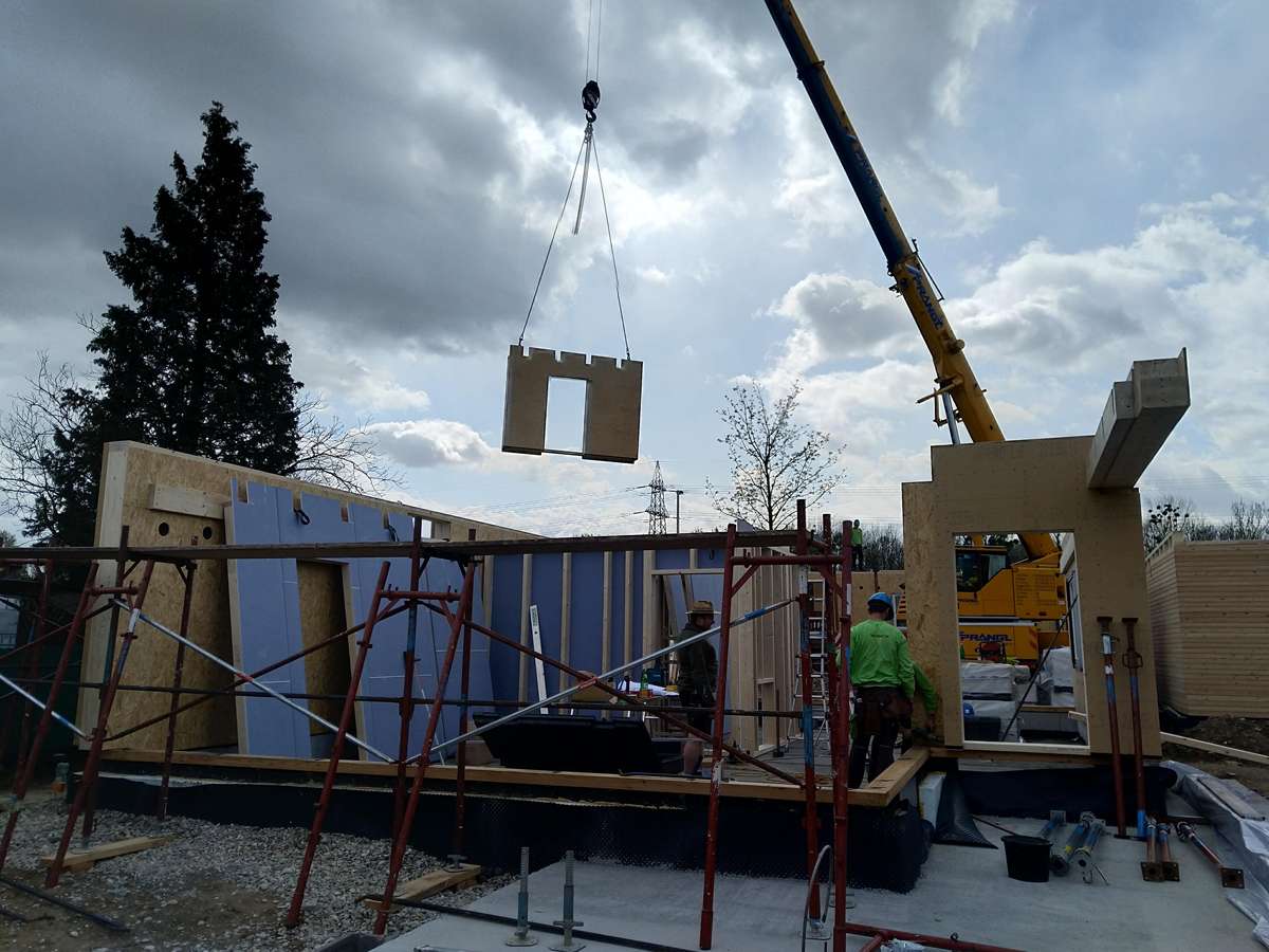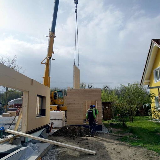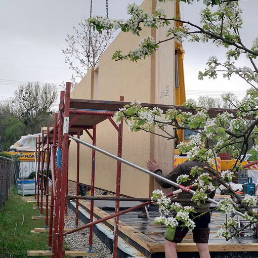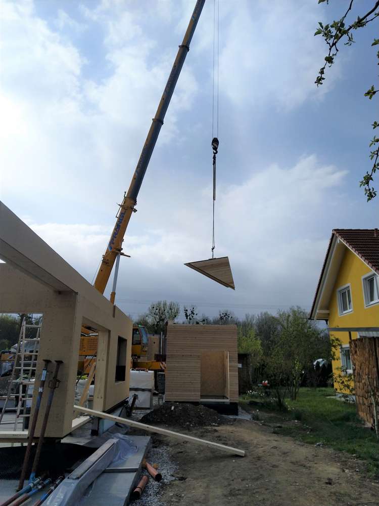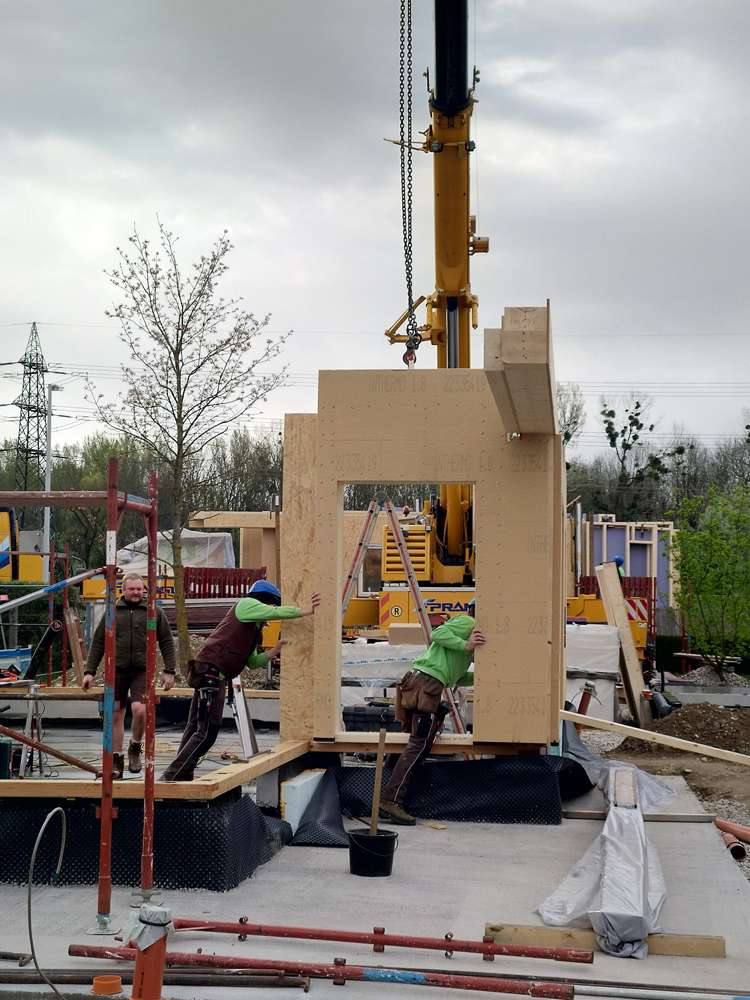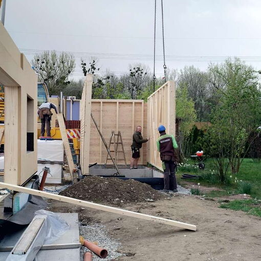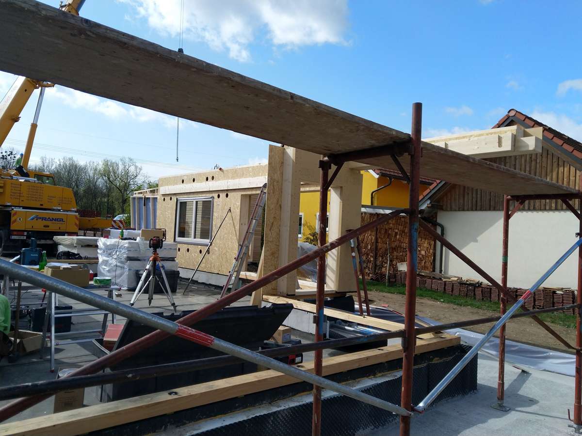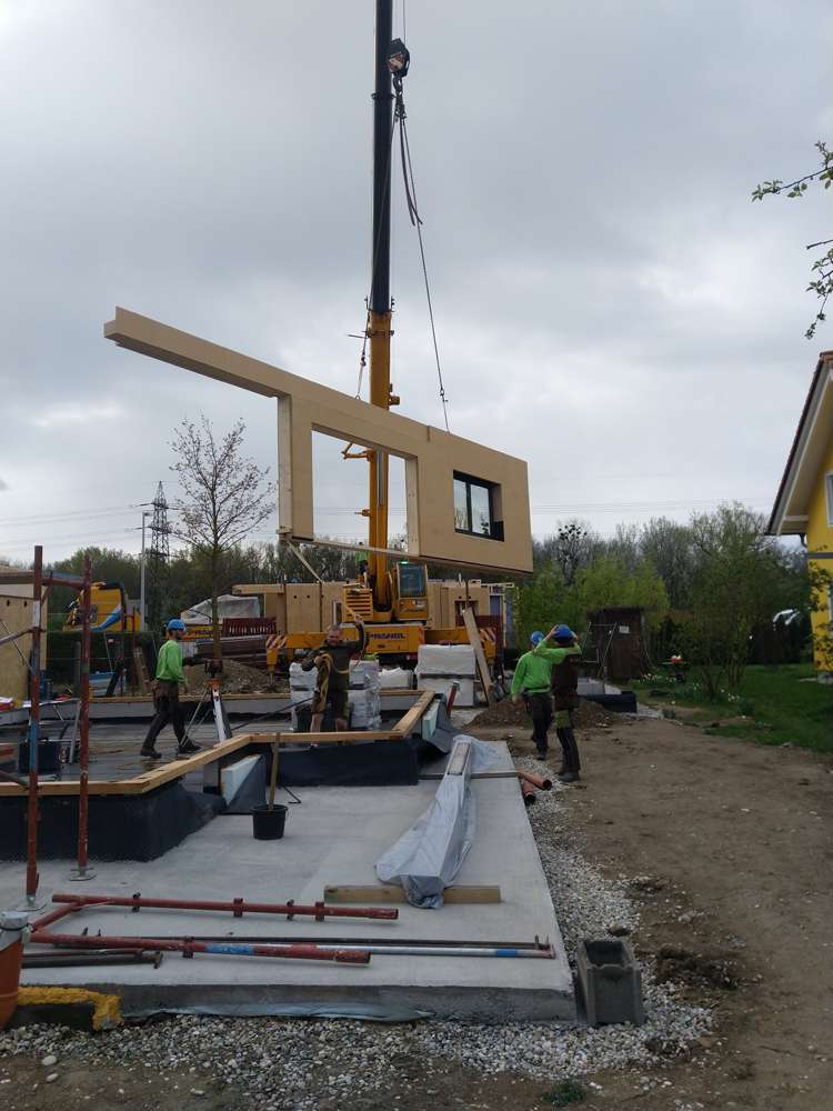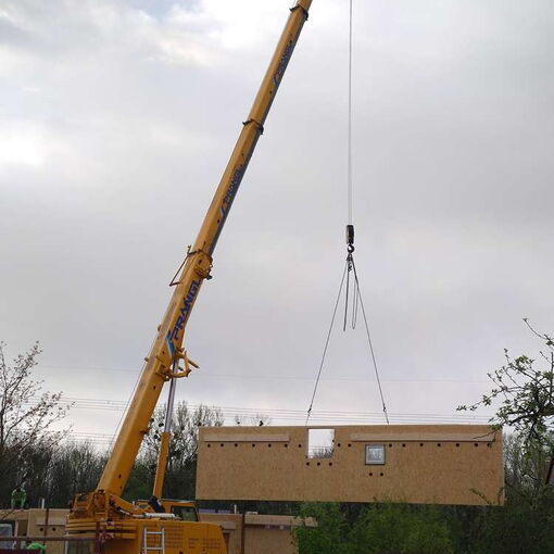 Der Teleskopkran ist schon startbereit, und bald kommt schon der erste Tieflader mit den Wänden für das Erdgeschoß. Eine Wand nach der anderen wird an Ort und Stelle gehoben und festgezurrt. Wir schauen gebannt zu und hoffen, dass uns kein Trum auf den Kopf fällt. Ein wirklich spannender Tag, nur das Wetter lässt zu wünschen übrig. Es ist saukalt und wir müssen uns immer wieder im Glashaus aufwärmen. Unser Polier trotzt den arktischen Temperaturen in der kurzen Lederhose ...