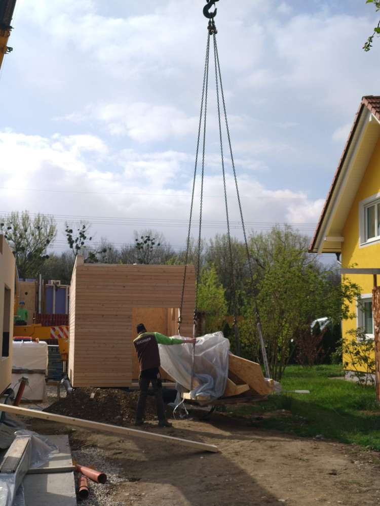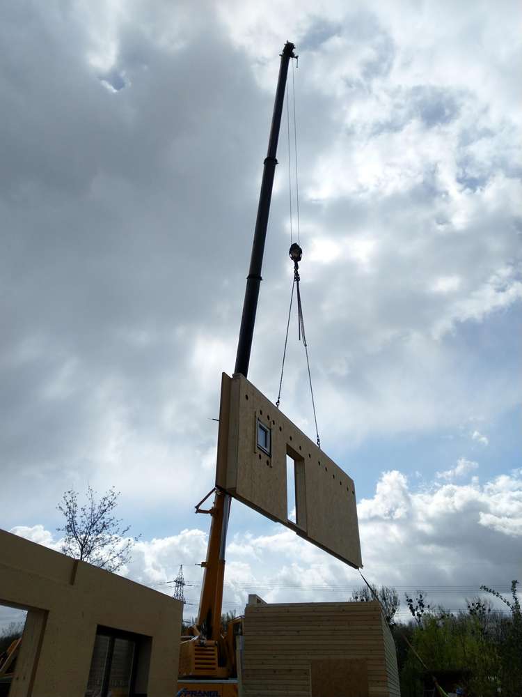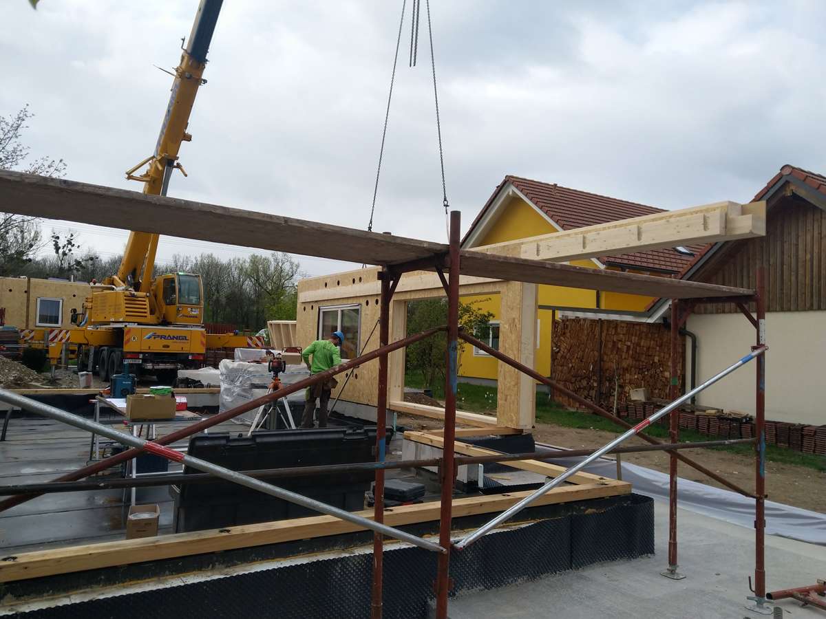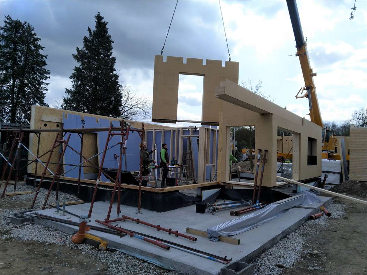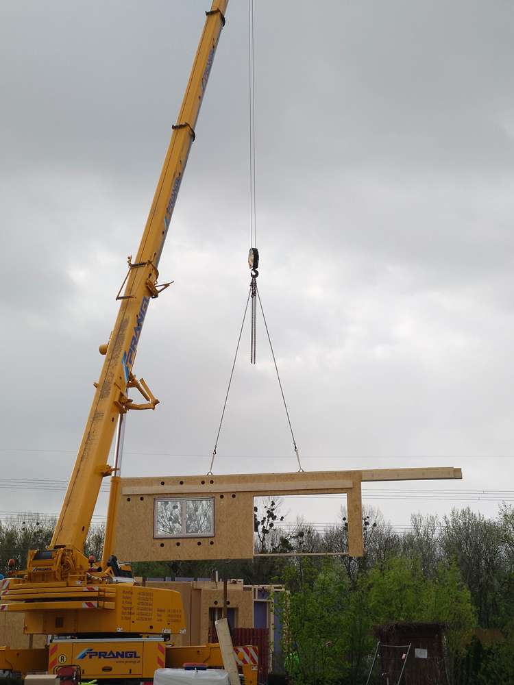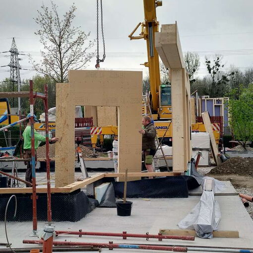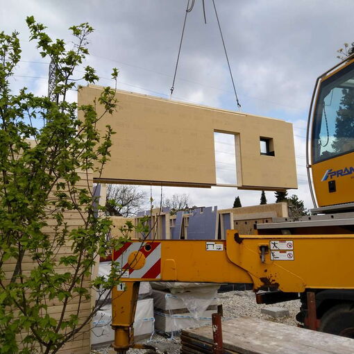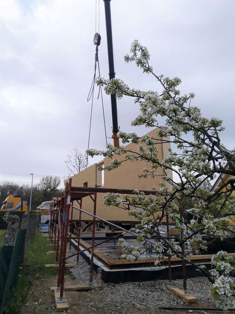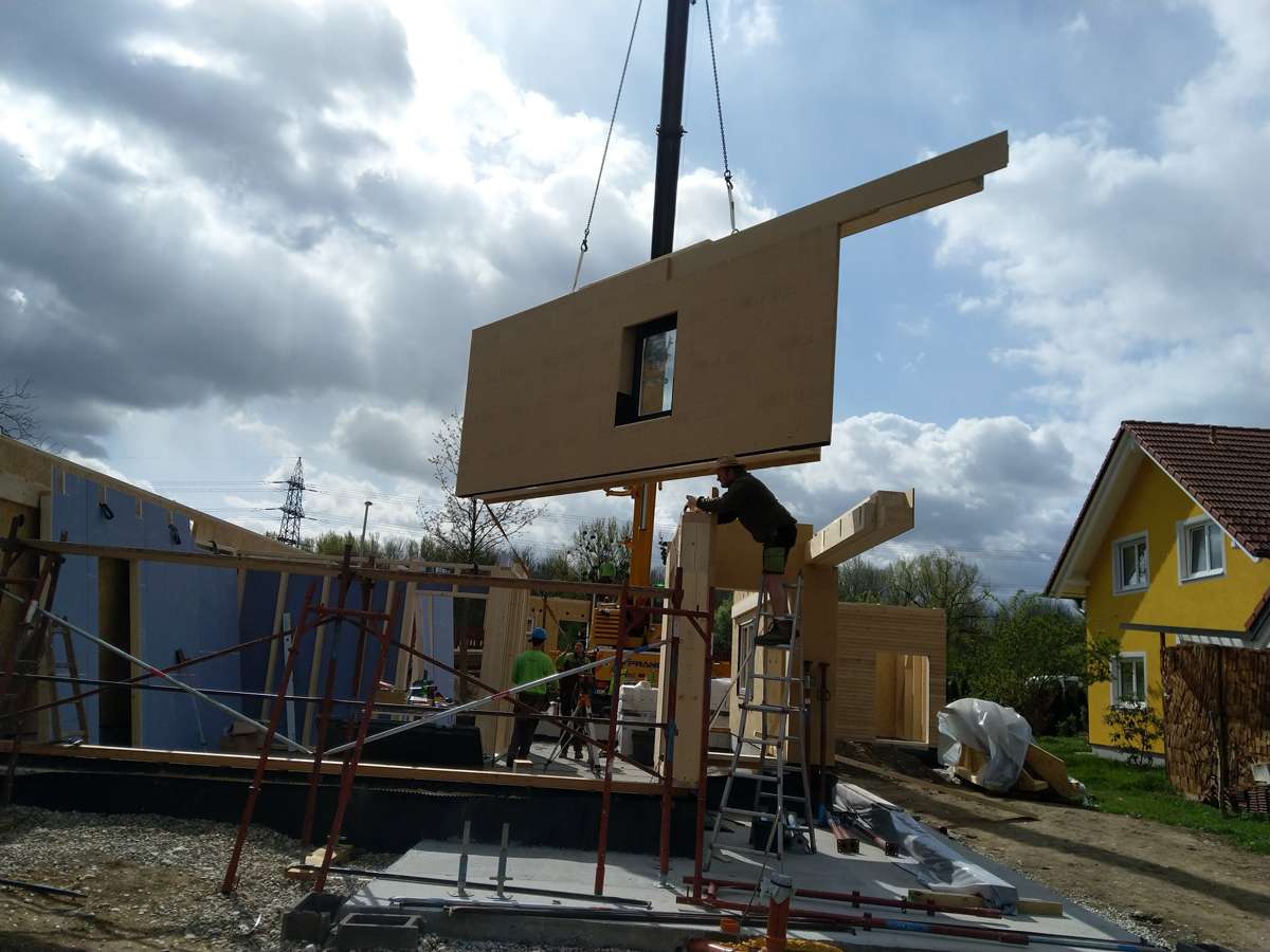 Der Teleskopkran ist schon startbereit, und bald kommt schon der erste Tieflader mit den Wänden für das Erdgeschoß. Eine Wand nach der anderen wird an Ort und Stelle gehoben und festgezurrt. Wir schauen gebannt zu und hoffen, dass uns kein Trum auf den Kopf fällt. Ein wirklich spannender Tag, nur das Wetter lässt zu wünschen übrig. Es ist saukalt und wir müssen uns immer wieder im Glashaus aufwärmen. Unser Polier trotzt den arktischen Temperaturen in der kurzen Lederhose ...