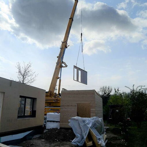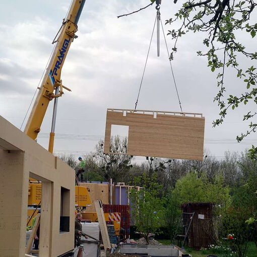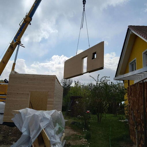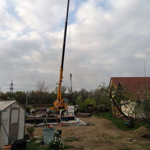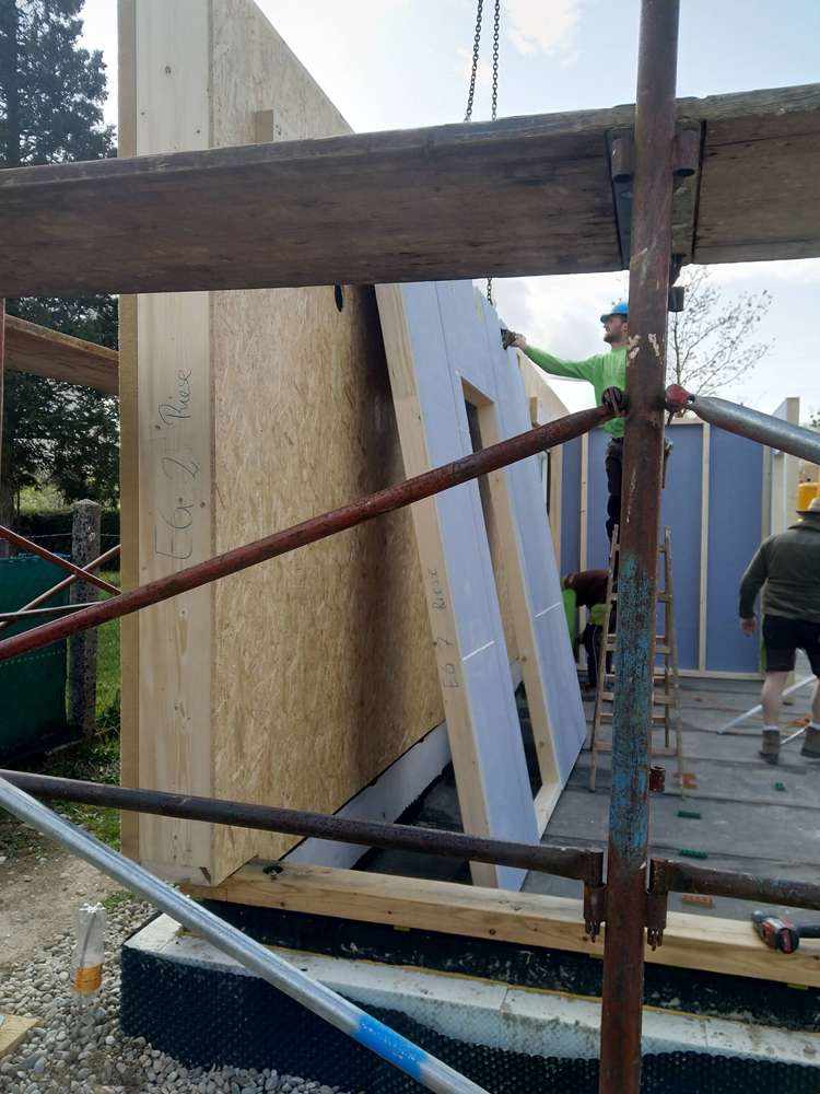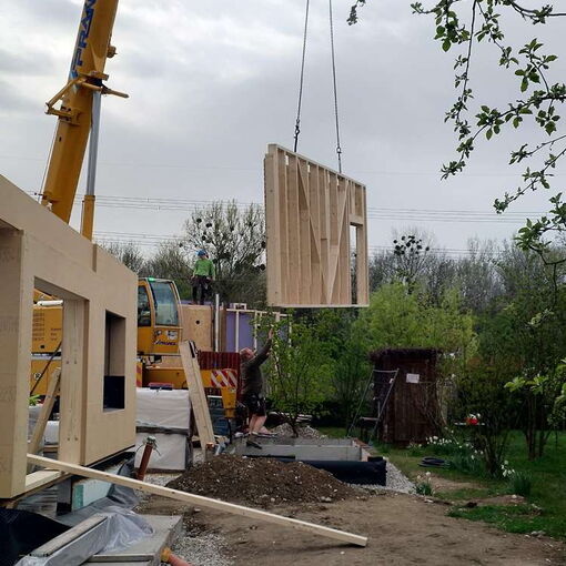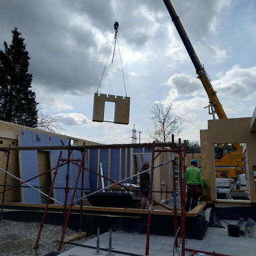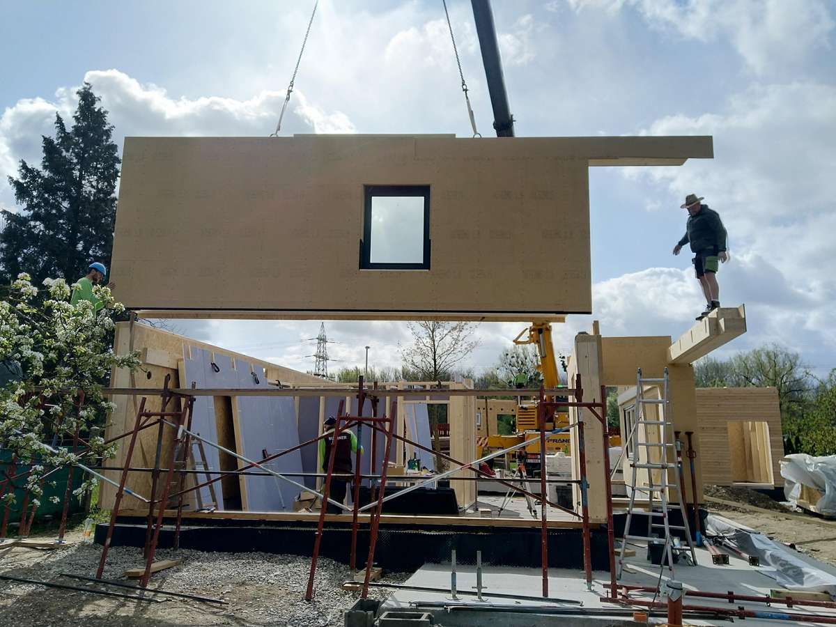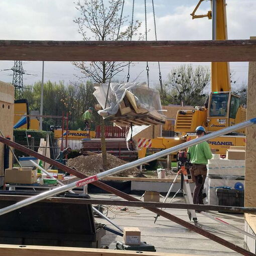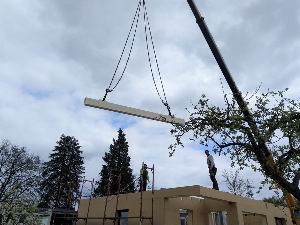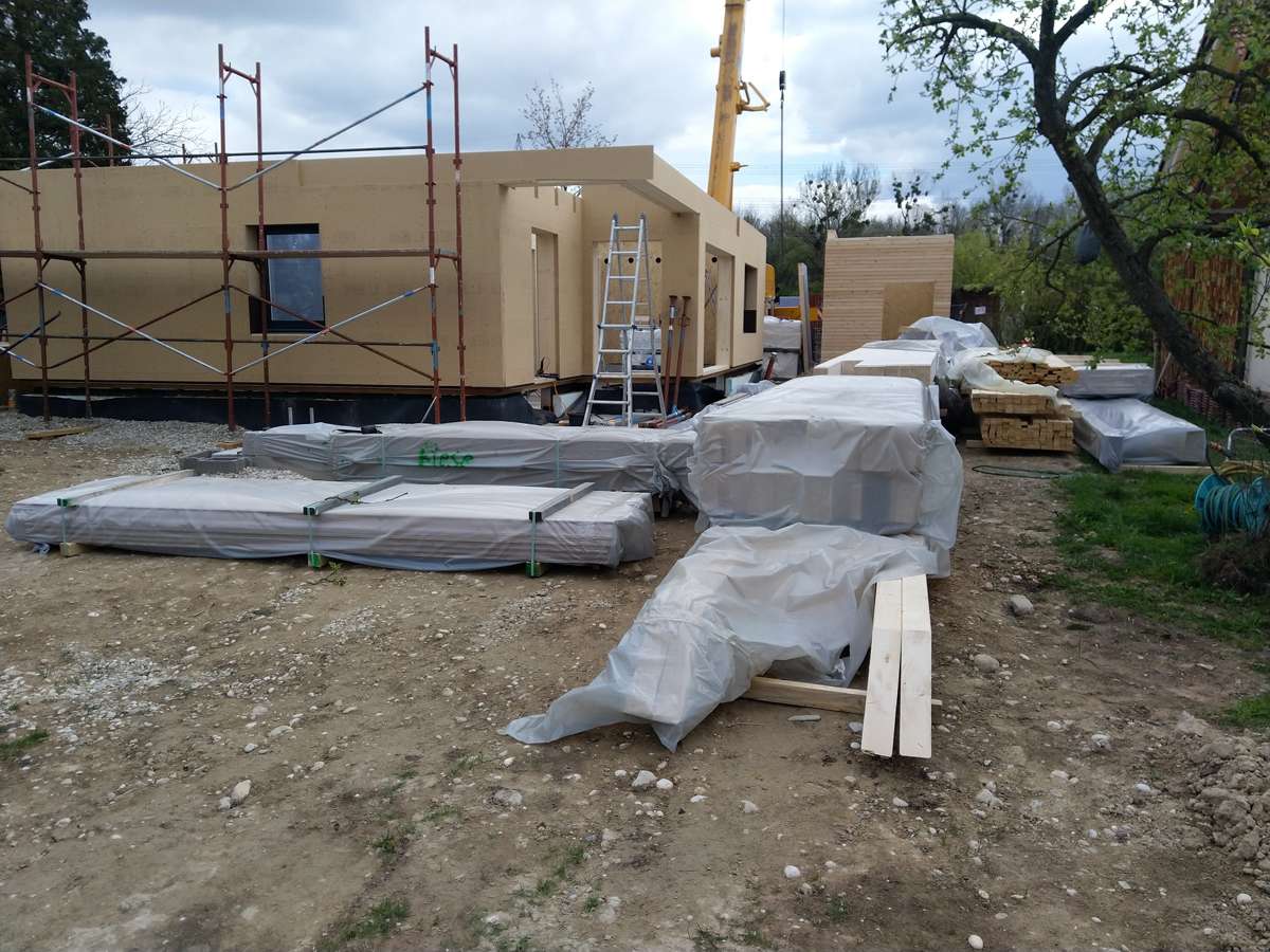 Der Teleskopkran ist schon startbereit, und bald kommt schon der erste Tieflader mit den Wänden für das Erdgeschoß. Eine Wand nach der anderen wird an Ort und Stelle gehoben und festgezurrt. Wir schauen gebannt zu und hoffen, dass uns kein Trum auf den Kopf fällt. Ein wirklich spannender Tag, nur das Wetter lässt zu wünschen übrig. Es ist saukalt und wir müssen uns immer wieder im Glashaus aufwärmen. Unser Polier trotzt den arktischen Temperaturen in der kurzen Lederhose ...