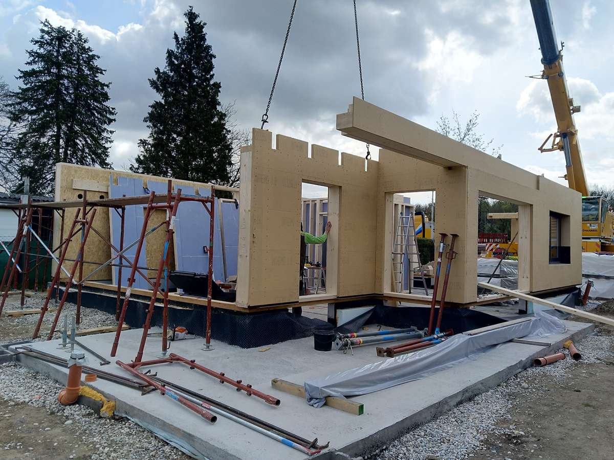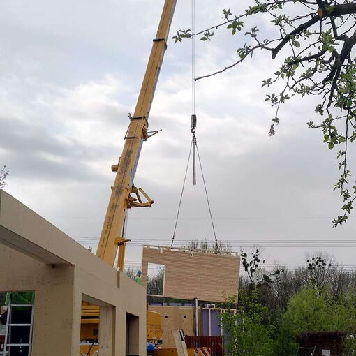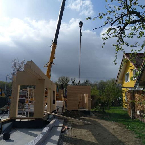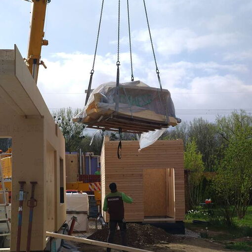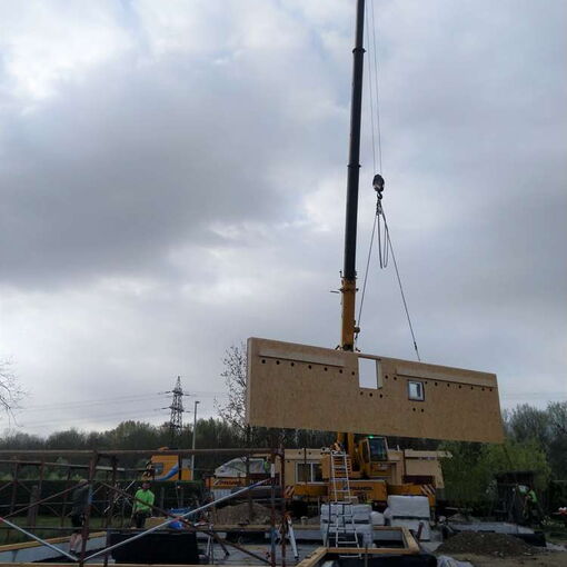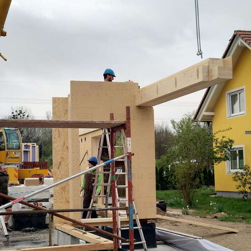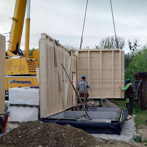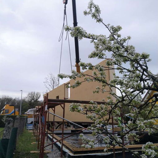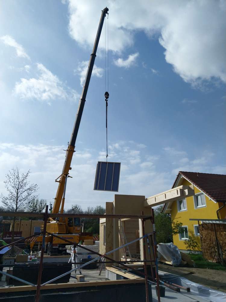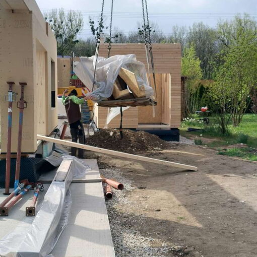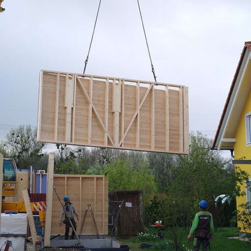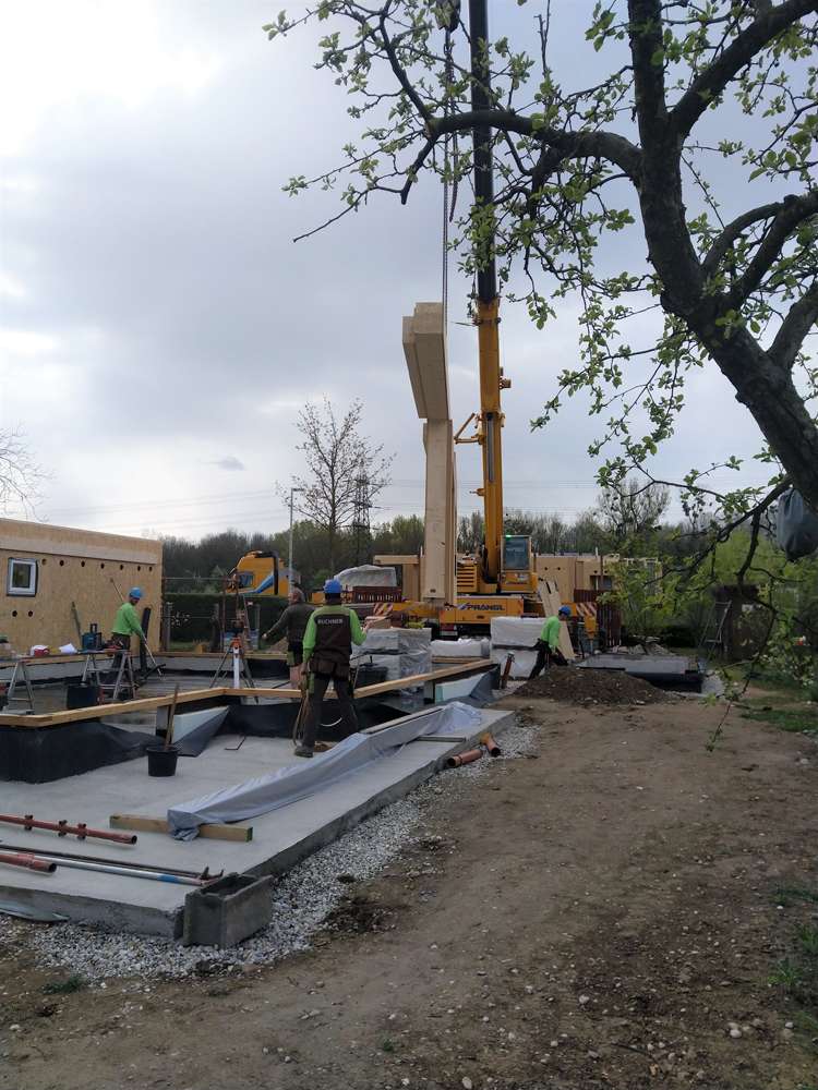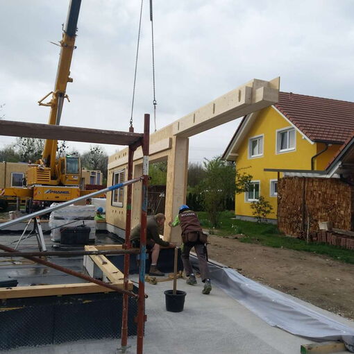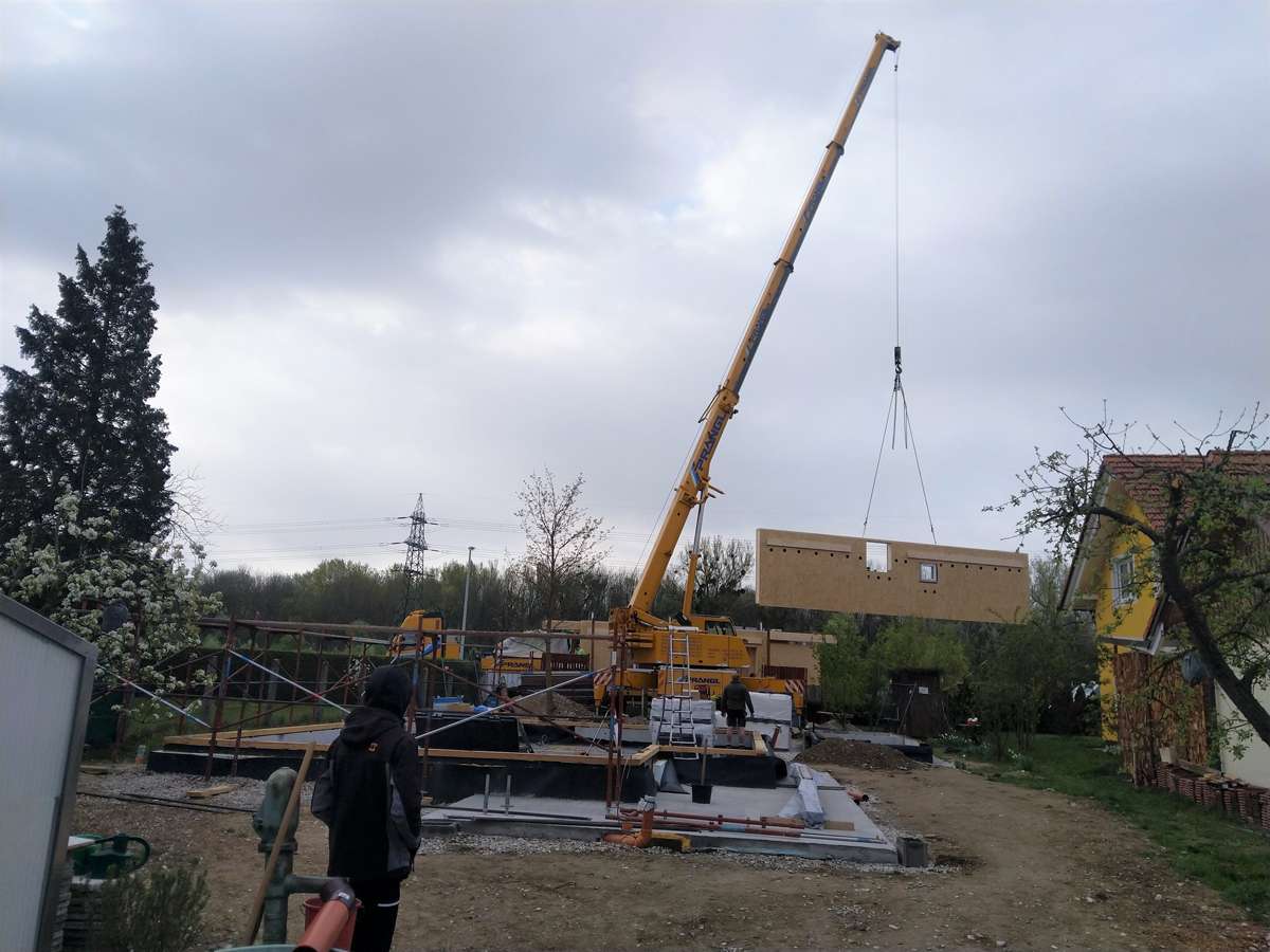 Der Teleskopkran ist schon startbereit, und bald kommt schon der erste Tieflader mit den Wänden für das Erdgeschoß. Eine Wand nach der anderen wird an Ort und Stelle gehoben und festgezurrt. Wir schauen gebannt zu und hoffen, dass uns kein Trum auf den Kopf fällt. Ein wirklich spannender Tag, nur das Wetter lässt zu wünschen übrig. Es ist saukalt und wir müssen uns immer wieder im Glashaus aufwärmen. Unser Polier trotzt den arktischen Temperaturen in der kurzen Lederhose ...