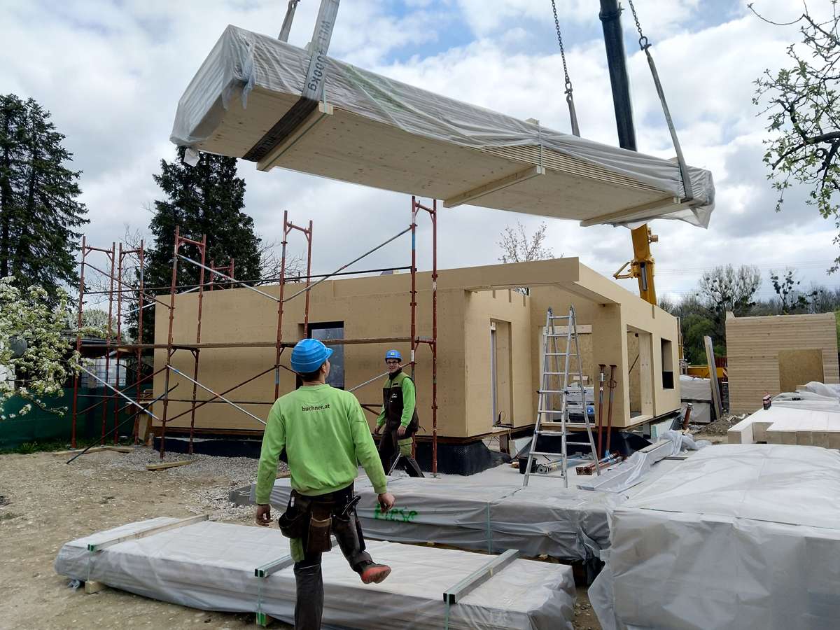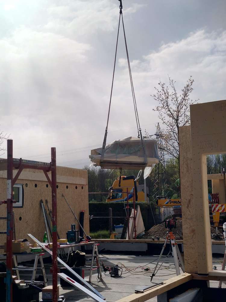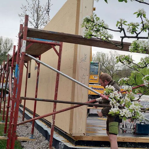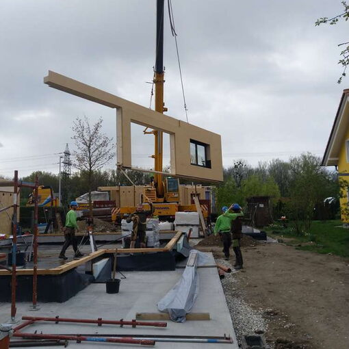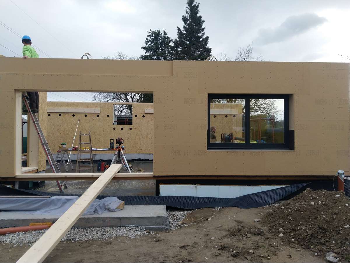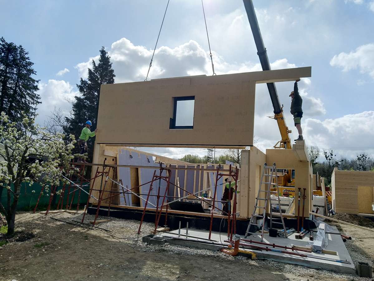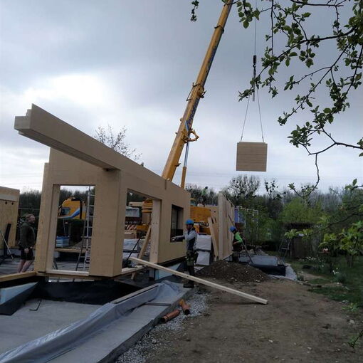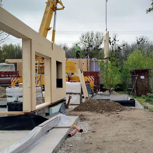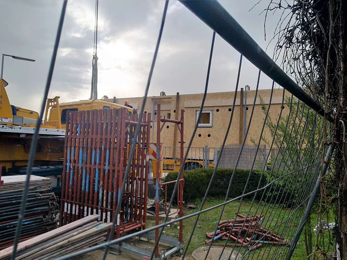 Der Teleskopkran ist schon startbereit, und bald kommt schon der erste Tieflader mit den Wänden für das Erdgeschoß. Eine Wand nach der anderen wird an Ort und Stelle gehoben und festgezurrt. Wir schauen gebannt zu und hoffen, dass uns kein Trum auf den Kopf fällt. Ein wirklich spannender Tag, nur das Wetter lässt zu wünschen übrig. Es ist saukalt und wir müssen uns immer wieder im Glashaus aufwärmen. Unser Polier trotzt den arktischen Temperaturen in der kurzen Lederhose ...