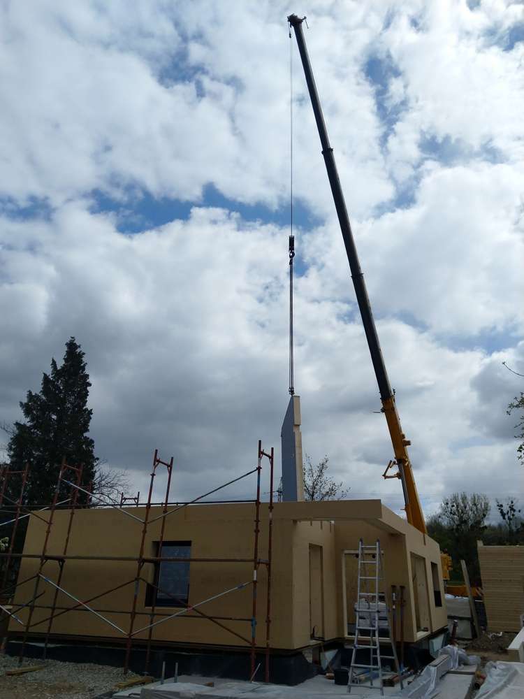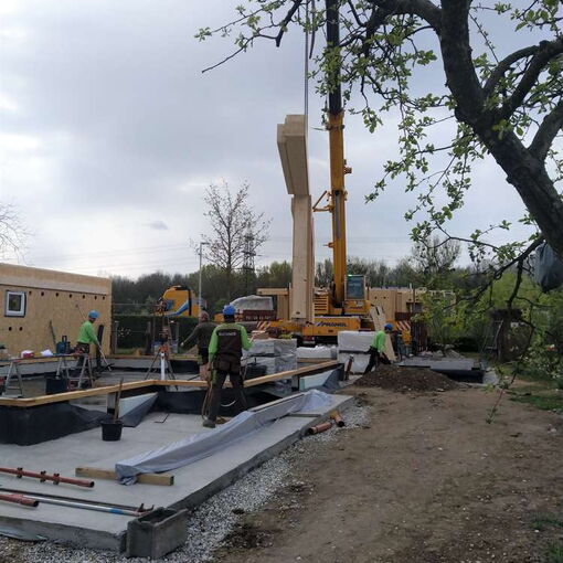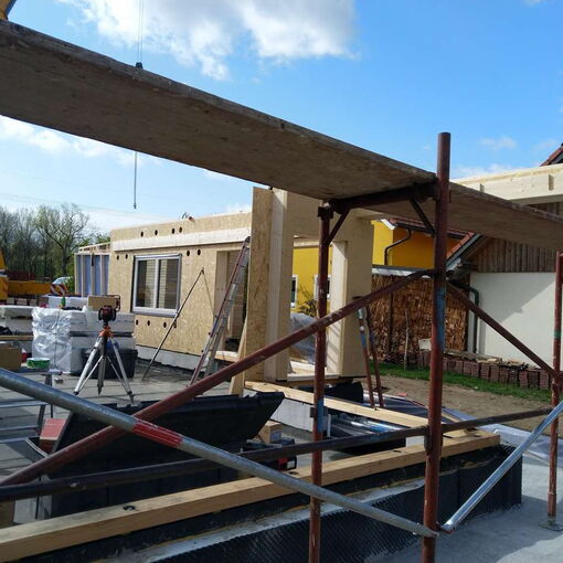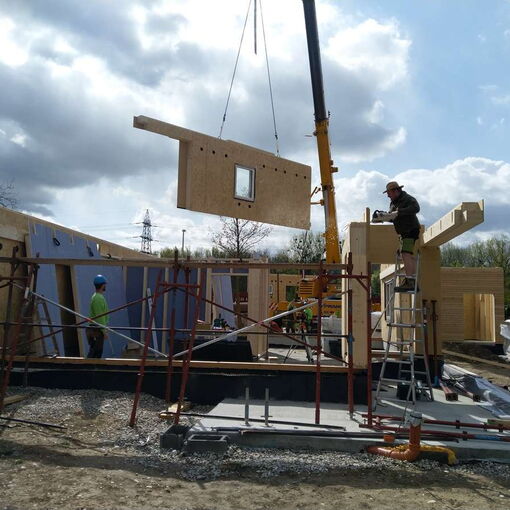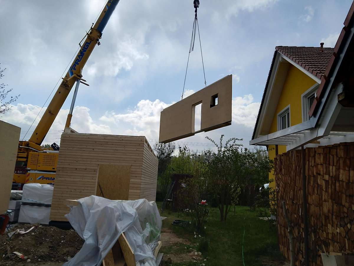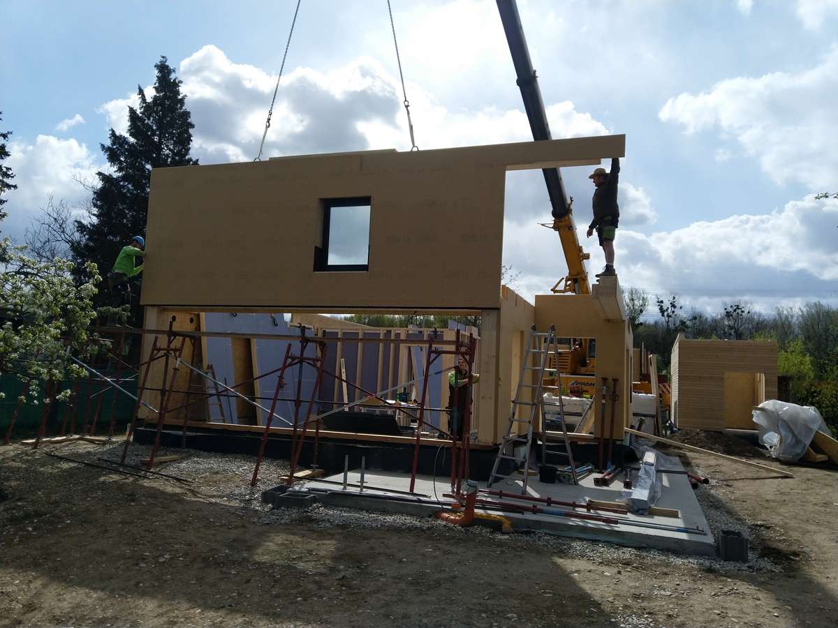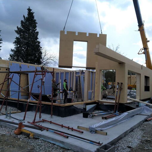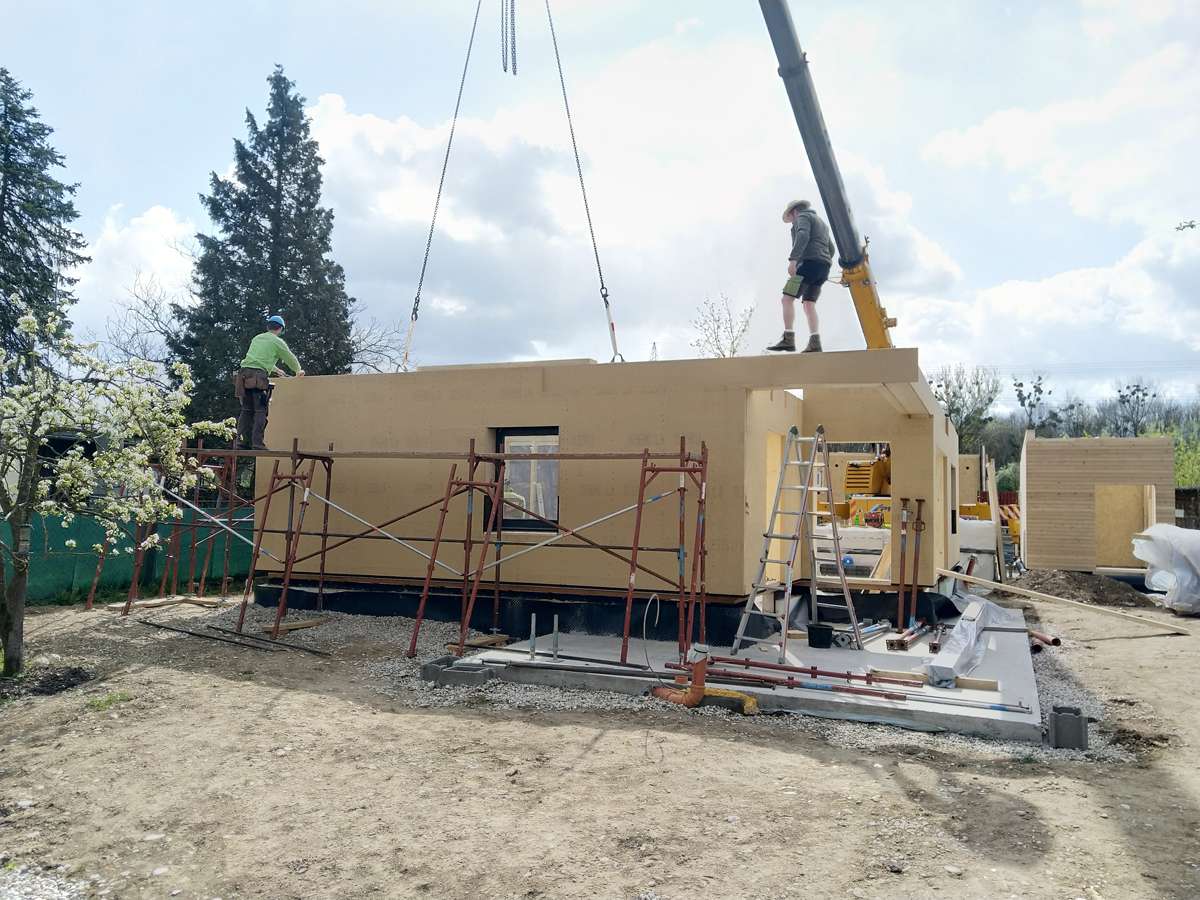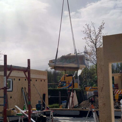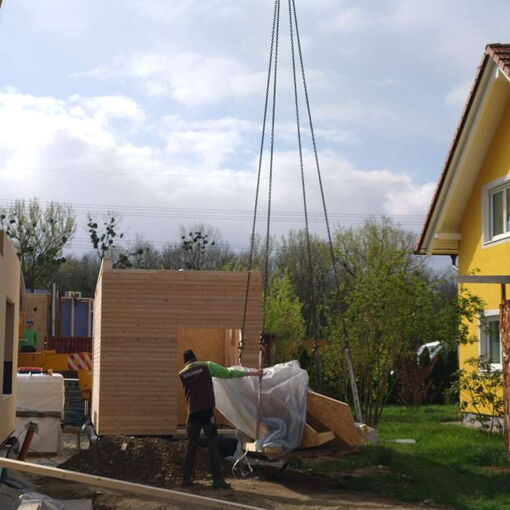 Der Teleskopkran ist schon startbereit, und bald kommt schon der erste Tieflader mit den Wänden für das Erdgeschoß. Eine Wand nach der anderen wird an Ort und Stelle gehoben und festgezurrt. Wir schauen gebannt zu und hoffen, dass uns kein Trum auf den Kopf fällt. Ein wirklich spannender Tag, nur das Wetter lässt zu wünschen übrig. Es ist saukalt und wir müssen uns immer wieder im Glashaus aufwärmen. Unser Polier trotzt den arktischen Temperaturen in der kurzen Lederhose ...
