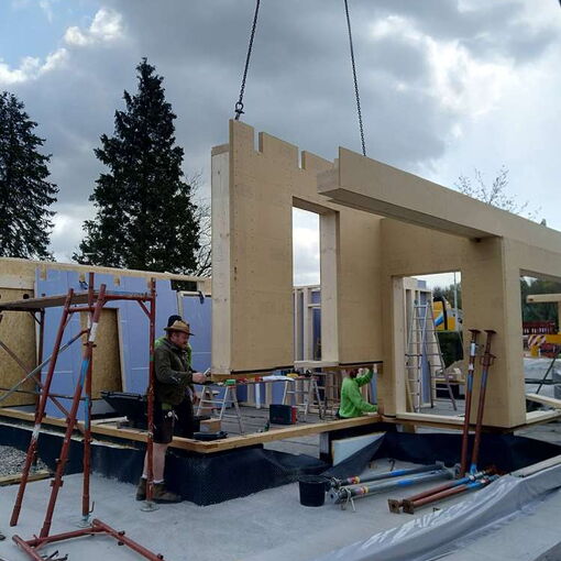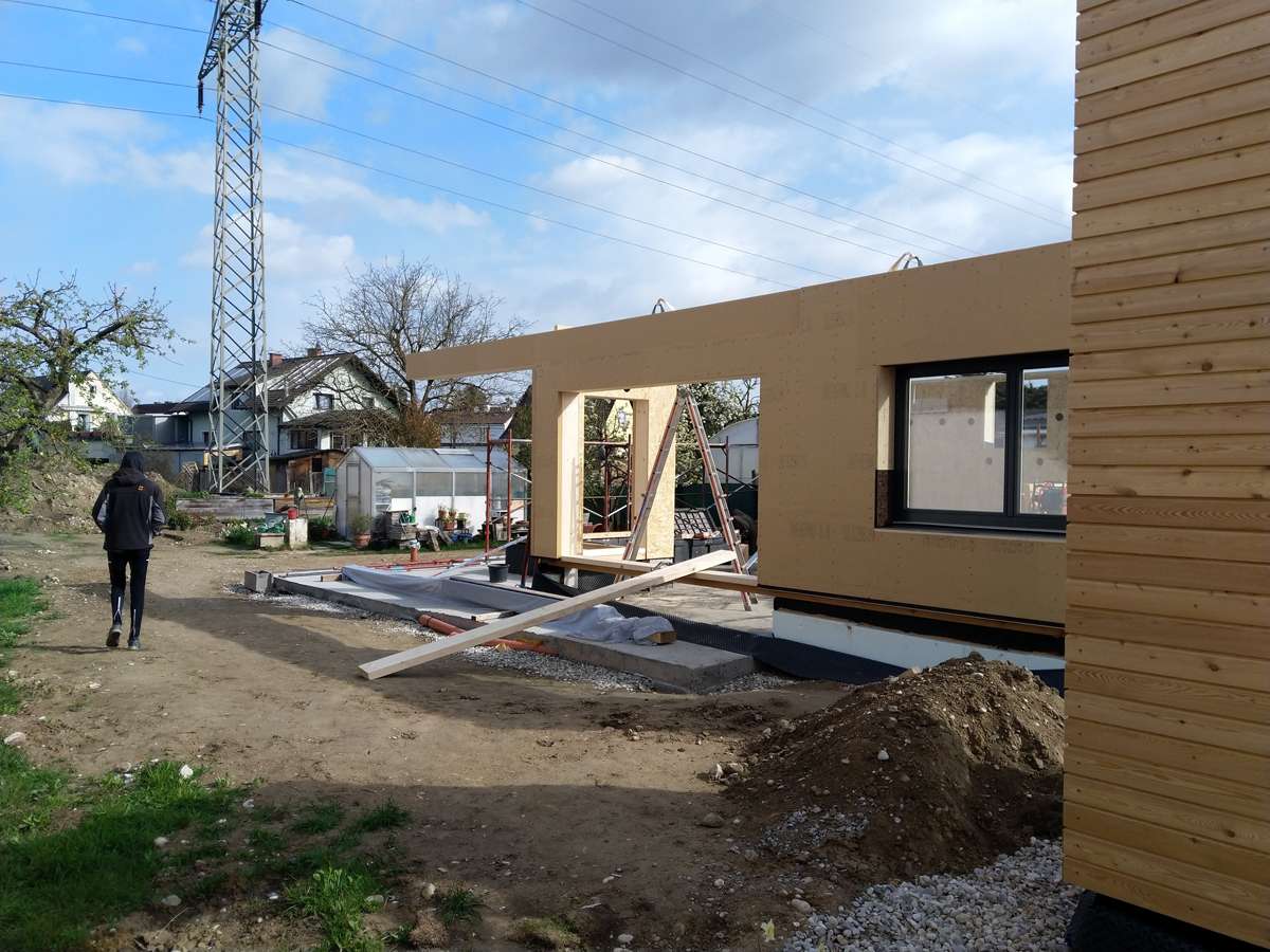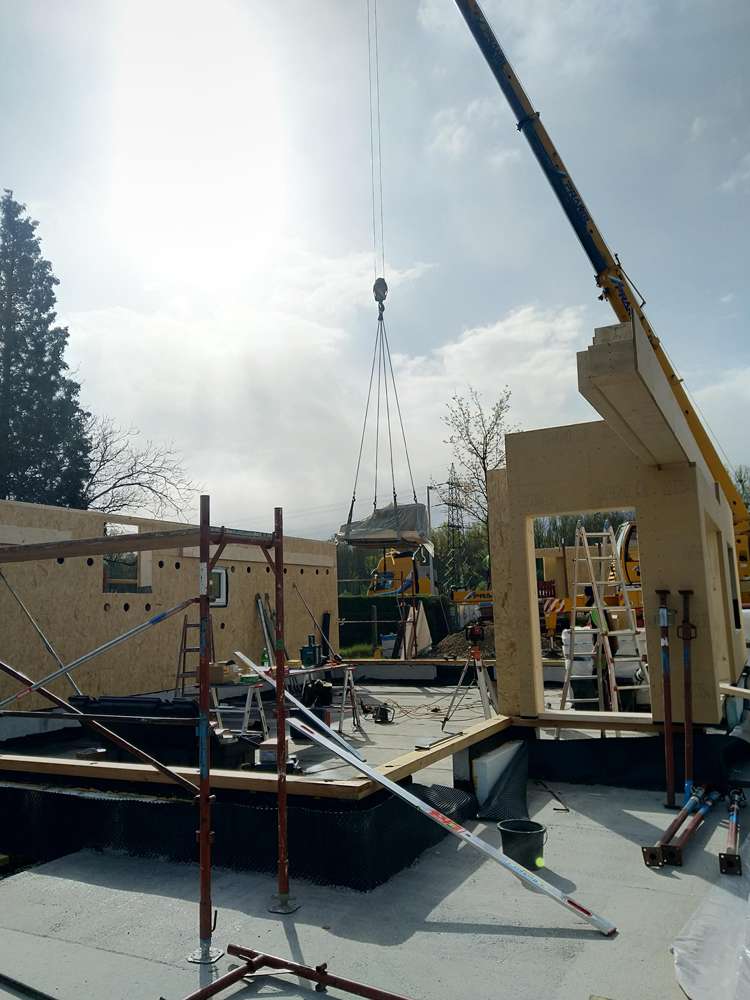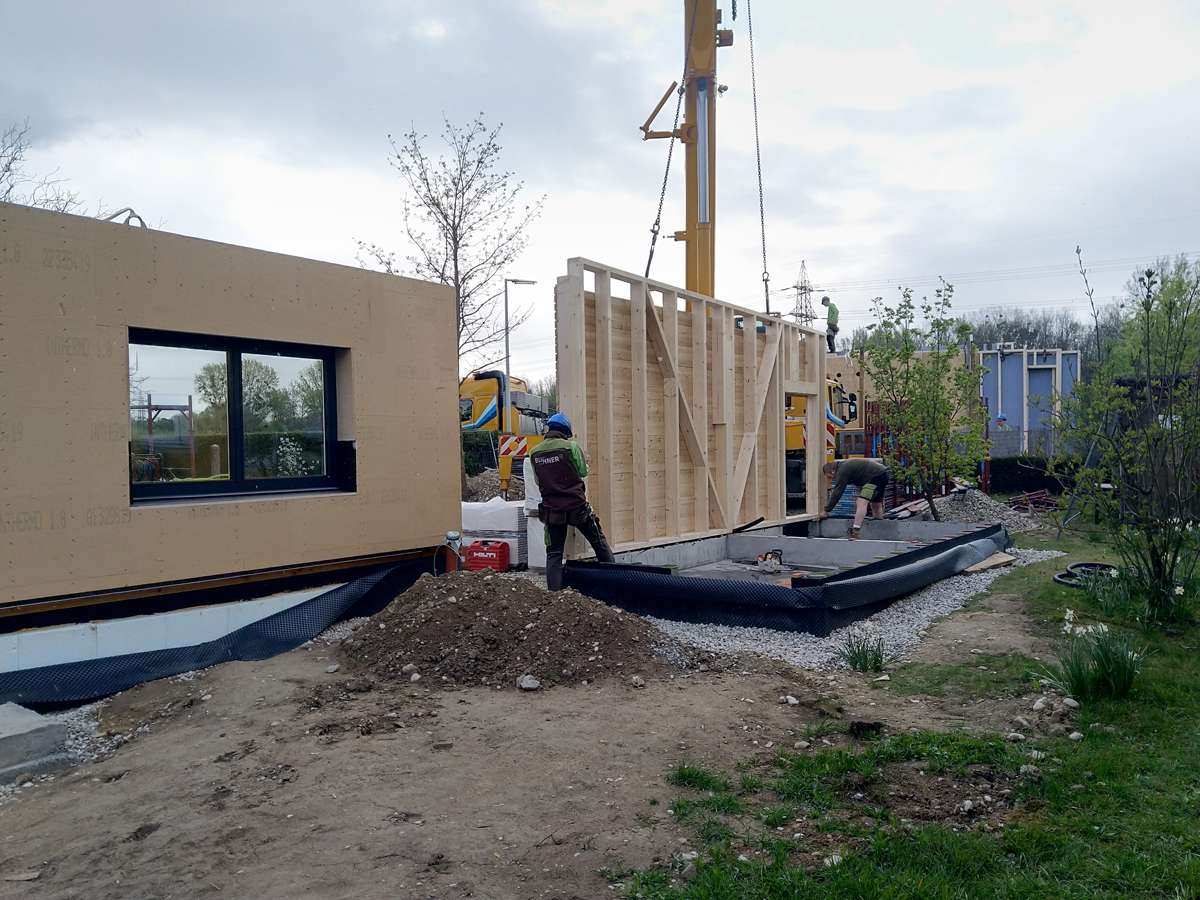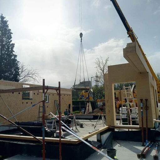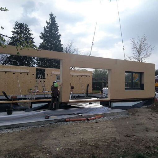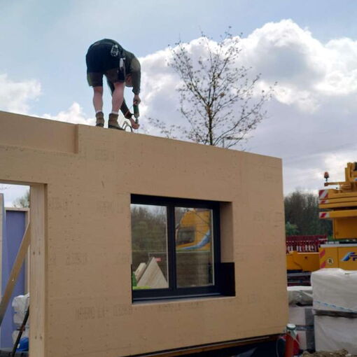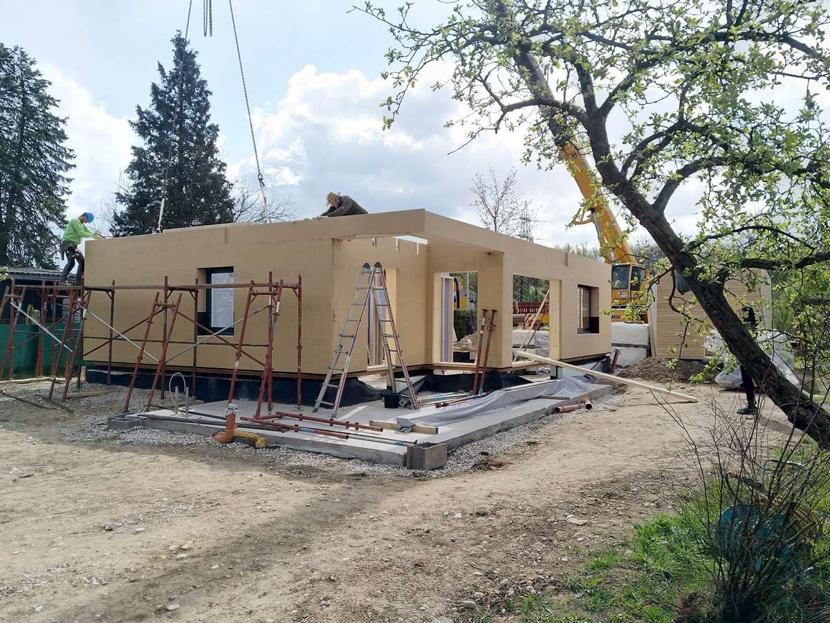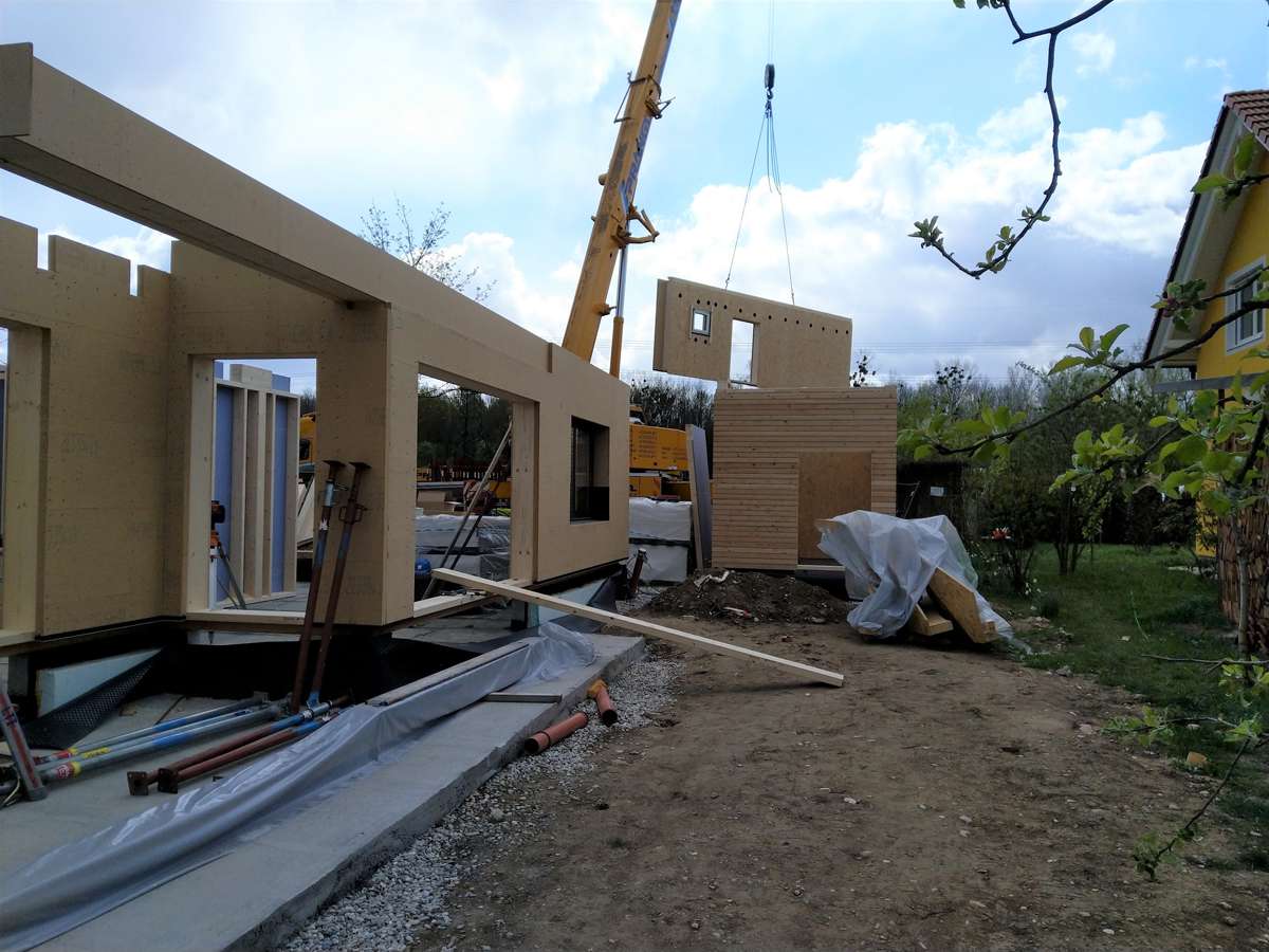 Der Teleskopkran ist schon startbereit, und bald kommt schon der erste Tieflader mit den Wänden für das Erdgeschoß. Eine Wand nach der anderen wird an Ort und Stelle gehoben und festgezurrt. Wir schauen gebannt zu und hoffen, dass uns kein Trum auf den Kopf fällt. Ein wirklich spannender Tag, nur das Wetter lässt zu wünschen übrig. Es ist saukalt und wir müssen uns immer wieder im Glashaus aufwärmen. Unser Polier trotzt den arktischen Temperaturen in der kurzen Lederhose ...