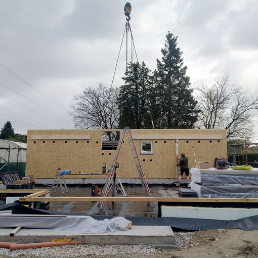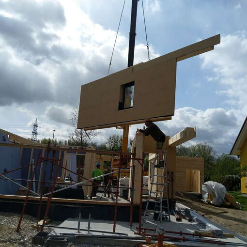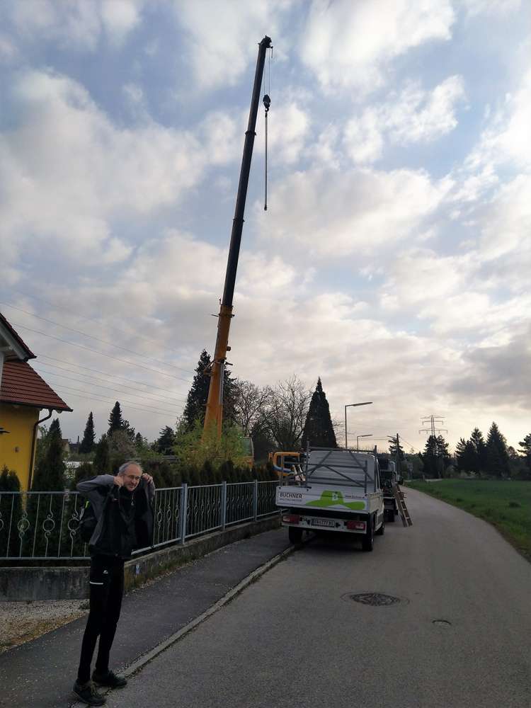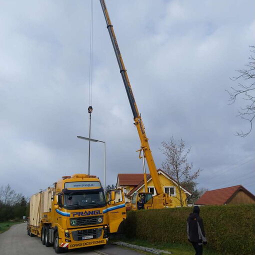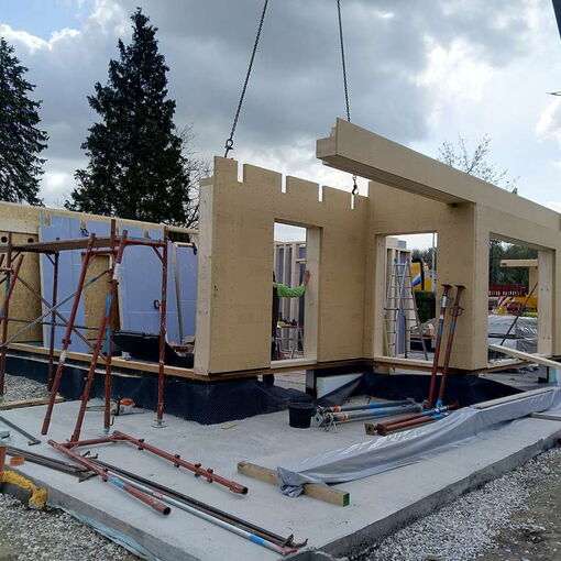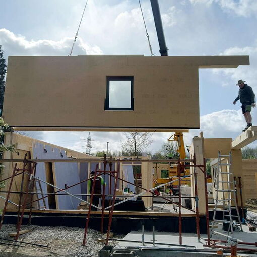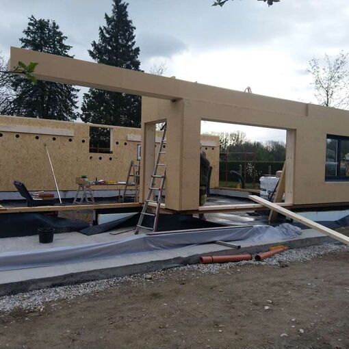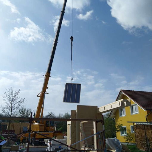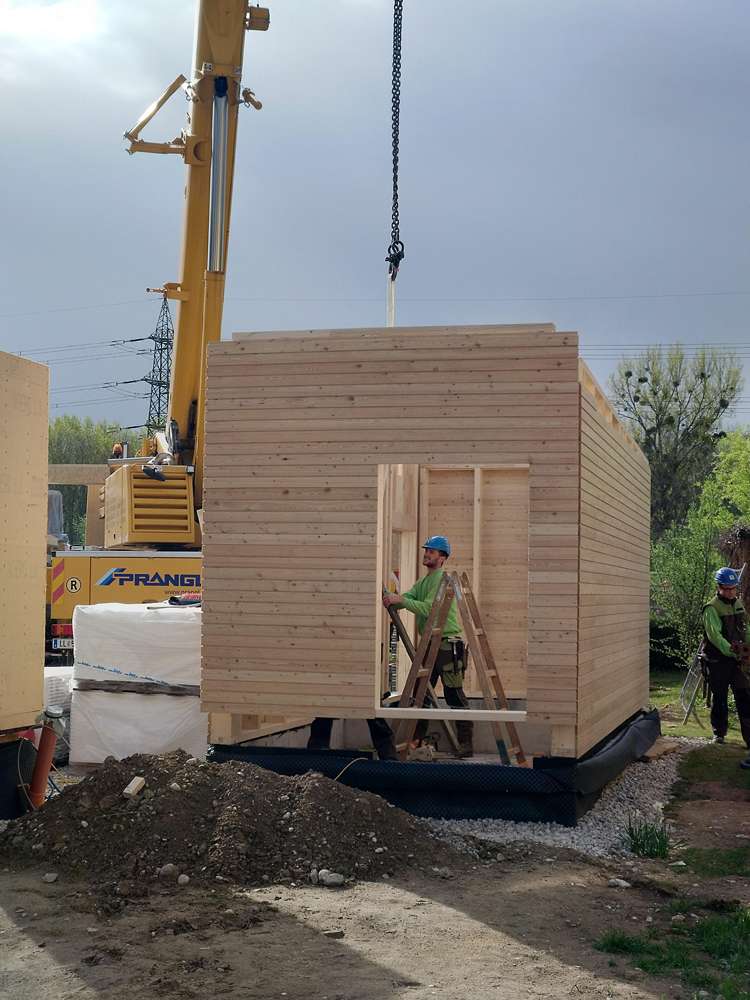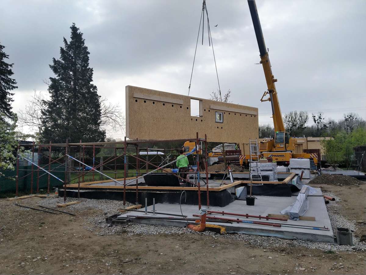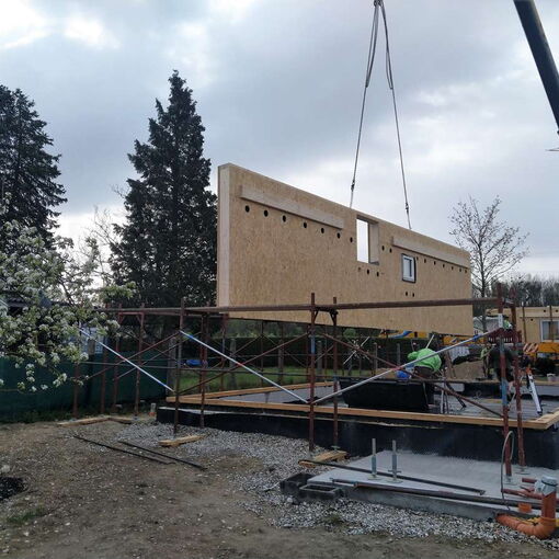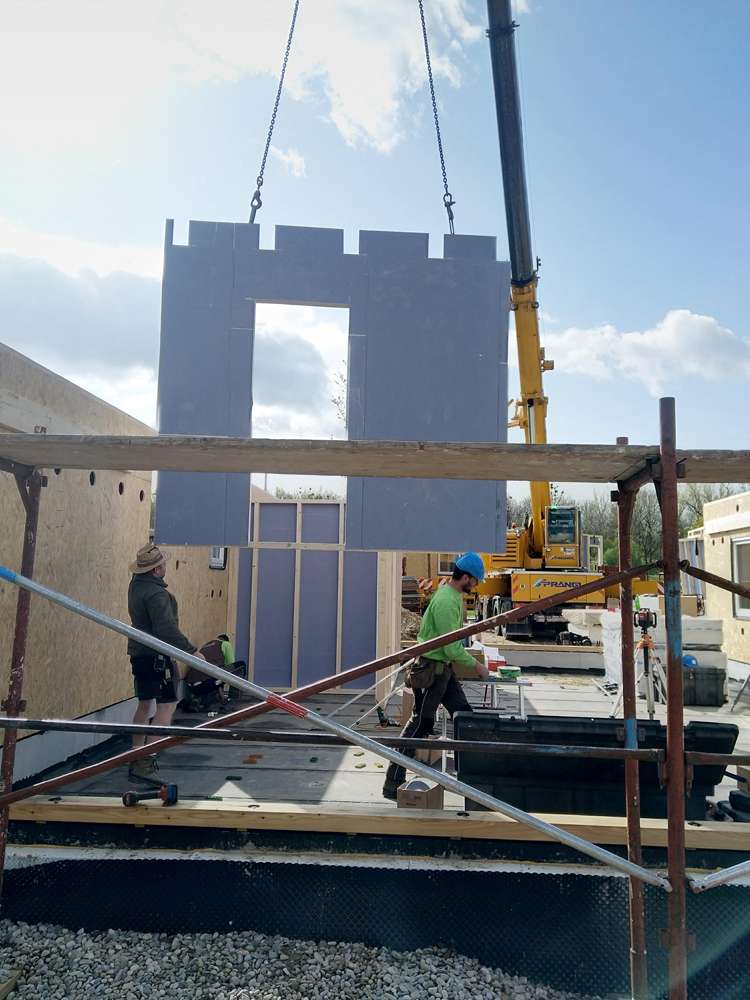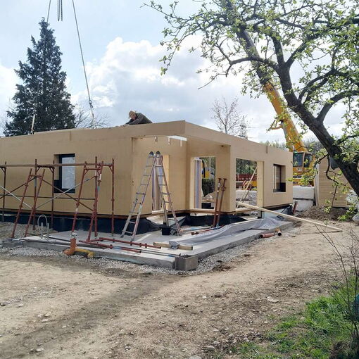 Der Teleskopkran ist schon startbereit, und bald kommt schon der erste Tieflader mit den Wänden für das Erdgeschoß. Eine Wand nach der anderen wird an Ort und Stelle gehoben und festgezurrt. Wir schauen gebannt zu und hoffen, dass uns kein Trum auf den Kopf fällt. Ein wirklich spannender Tag, nur das Wetter lässt zu wünschen übrig. Es ist saukalt und wir müssen uns immer wieder im Glashaus aufwärmen. Unser Polier trotzt den arktischen Temperaturen in der kurzen Lederhose ...