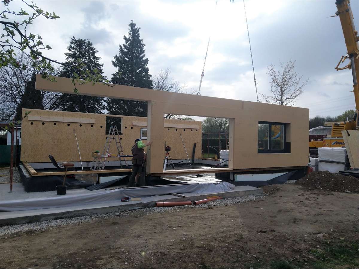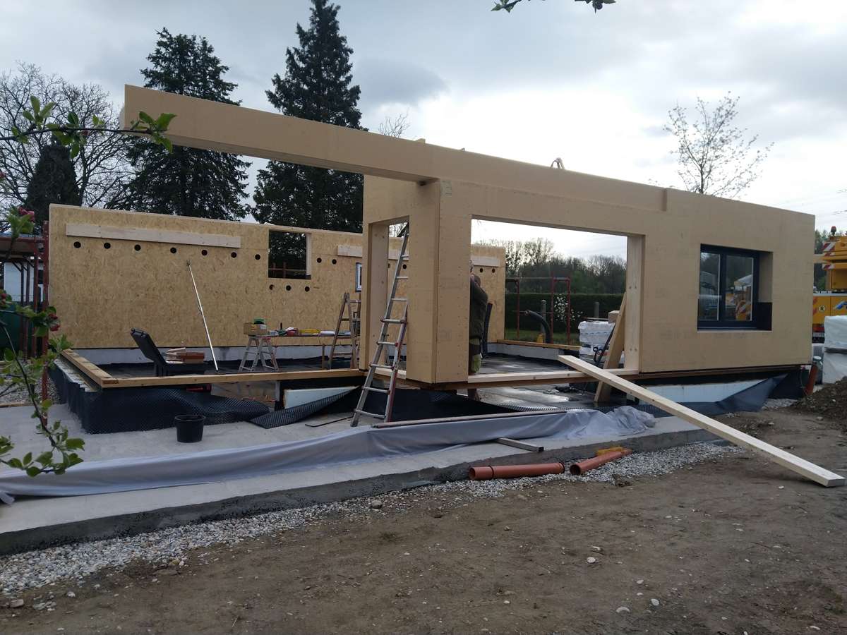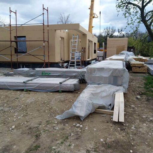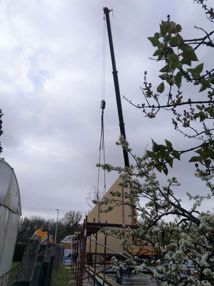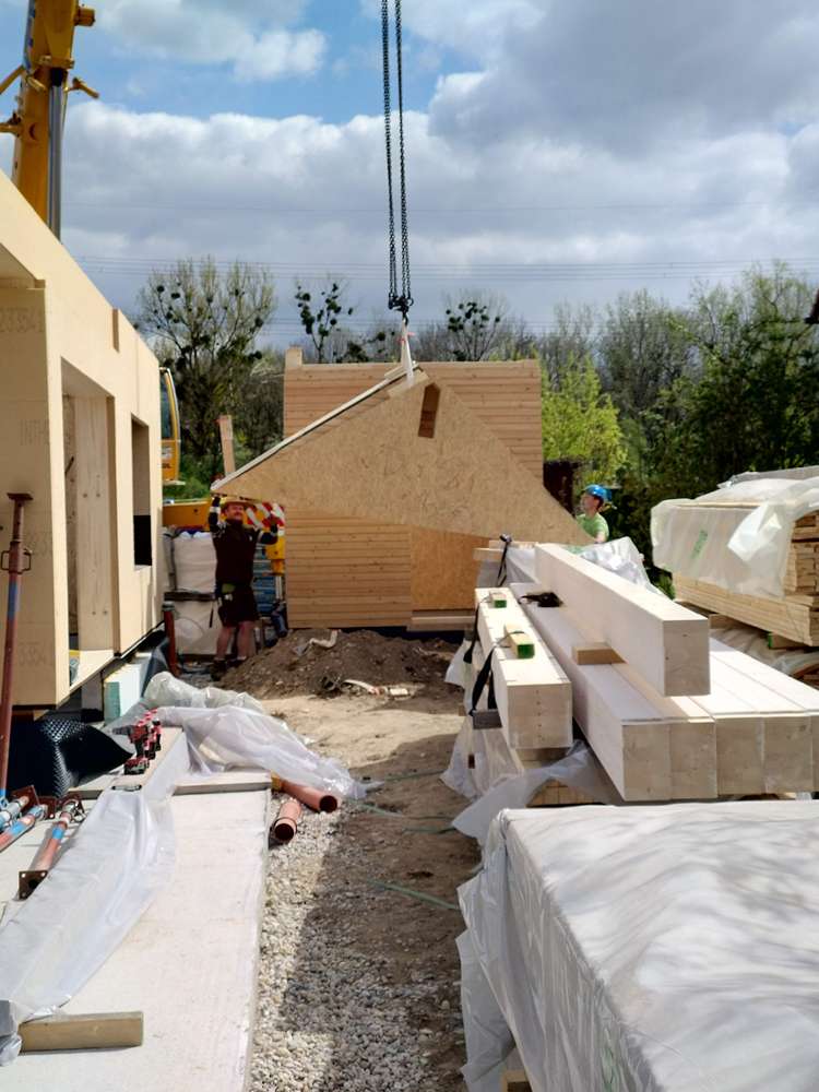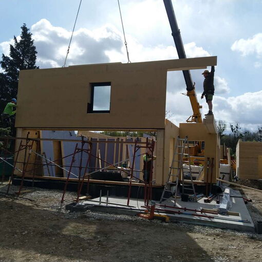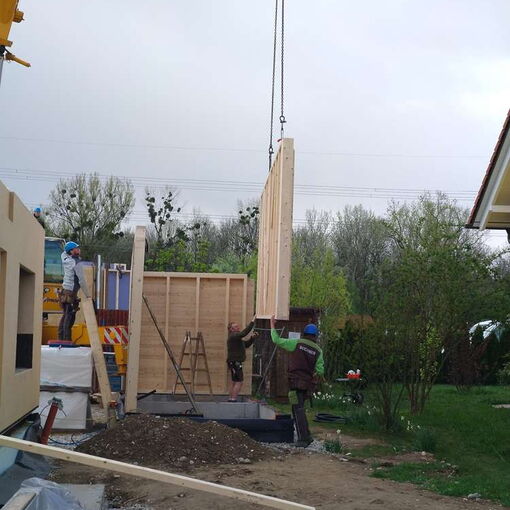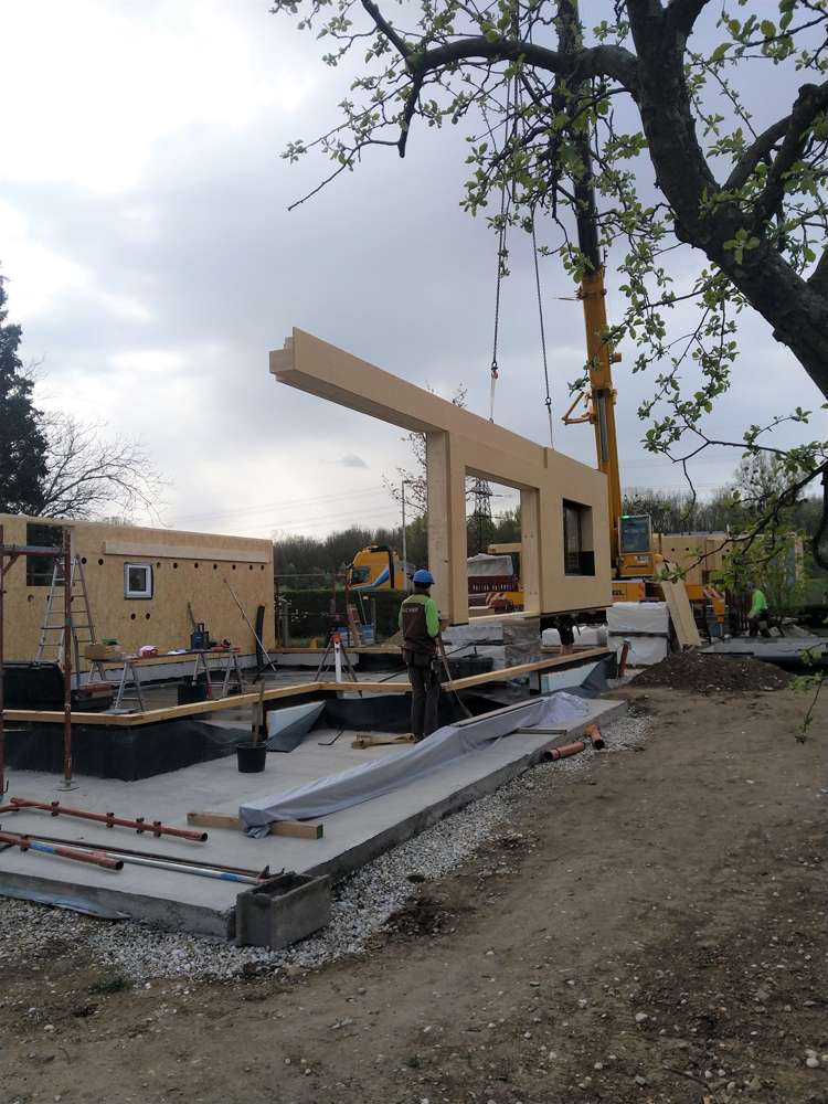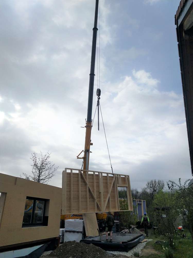 Der Teleskopkran ist schon startbereit, und bald kommt schon der erste Tieflader mit den Wänden für das Erdgeschoß. Eine Wand nach der anderen wird an Ort und Stelle gehoben und festgezurrt. Wir schauen gebannt zu und hoffen, dass uns kein Trum auf den Kopf fällt. Ein wirklich spannender Tag, nur das Wetter lässt zu wünschen übrig. Es ist saukalt und wir müssen uns immer wieder im Glashaus aufwärmen. Unser Polier trotzt den arktischen Temperaturen in der kurzen Lederhose ...