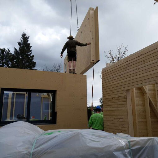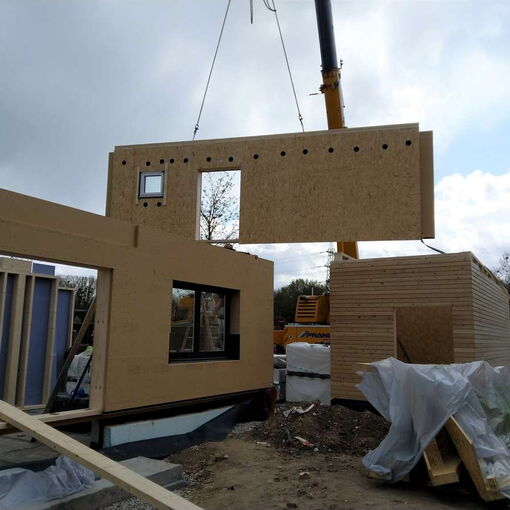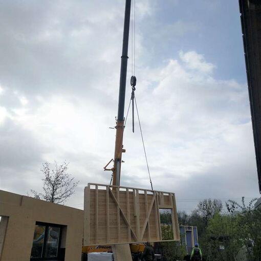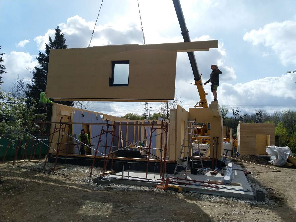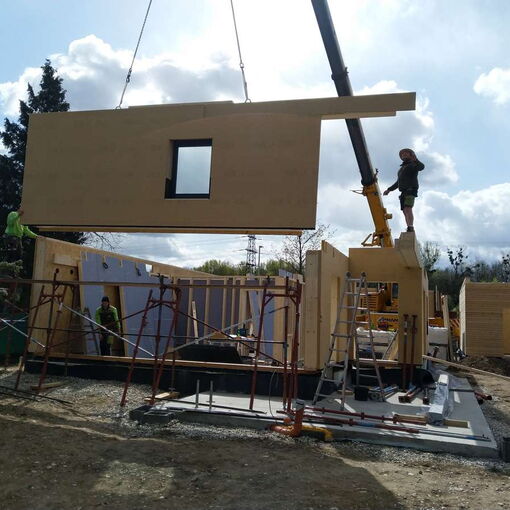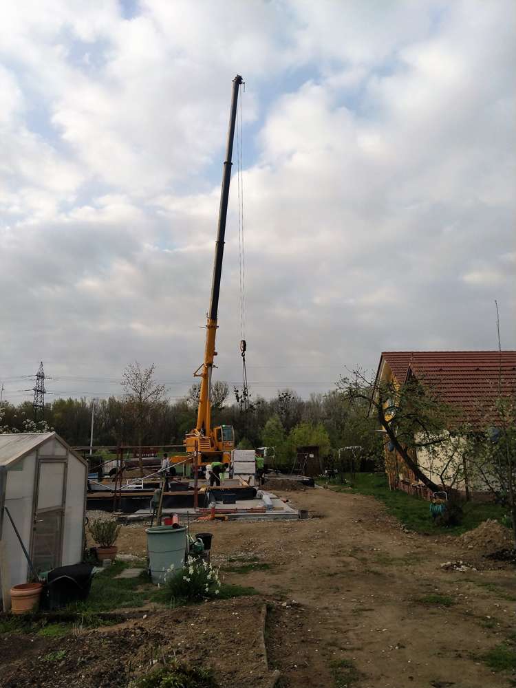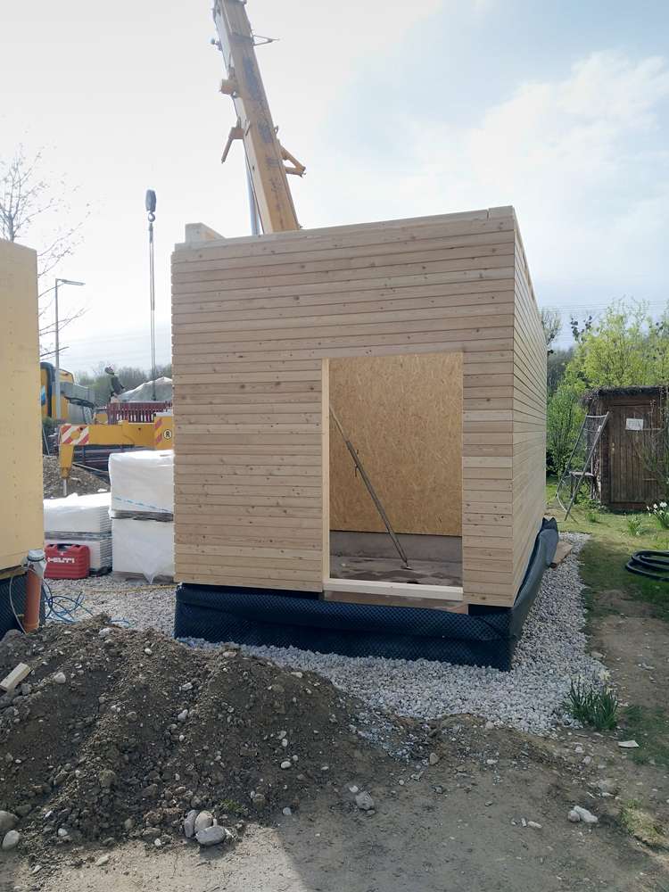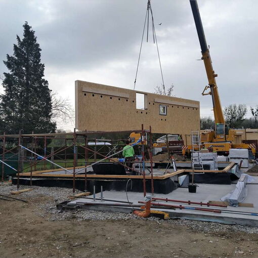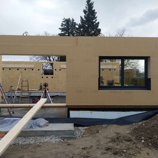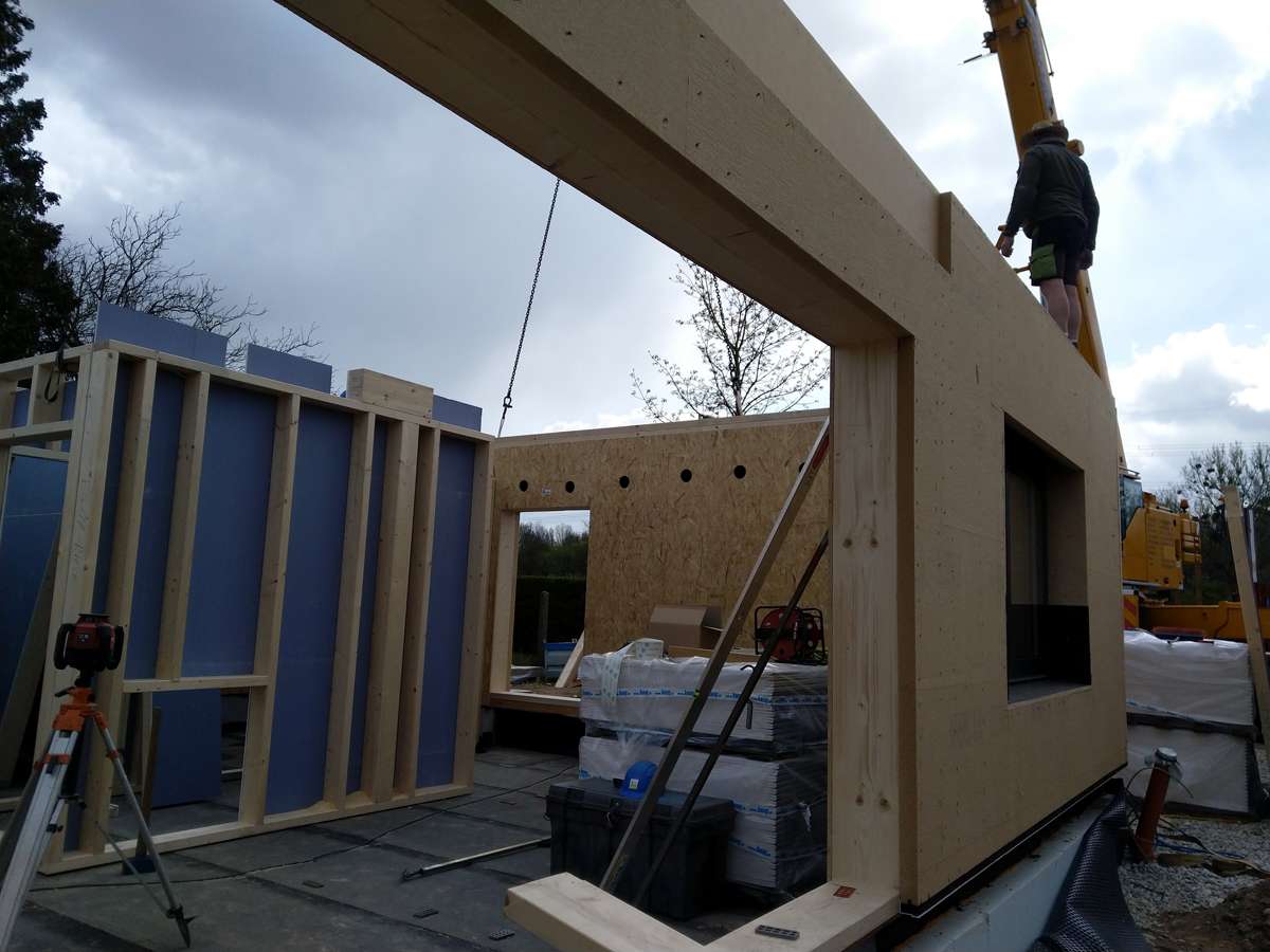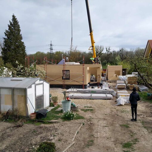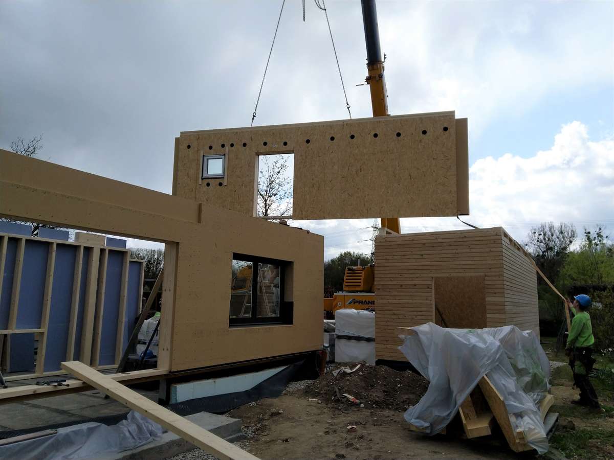 Der Teleskopkran ist schon startbereit, und bald kommt schon der erste Tieflader mit den Wänden für das Erdgeschoß. Eine Wand nach der anderen wird an Ort und Stelle gehoben und festgezurrt. Wir schauen gebannt zu und hoffen, dass uns kein Trum auf den Kopf fällt. Ein wirklich spannender Tag, nur das Wetter lässt zu wünschen übrig. Es ist saukalt und wir müssen uns immer wieder im Glashaus aufwärmen. Unser Polier trotzt den arktischen Temperaturen in der kurzen Lederhose ...