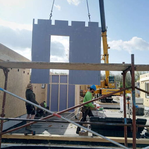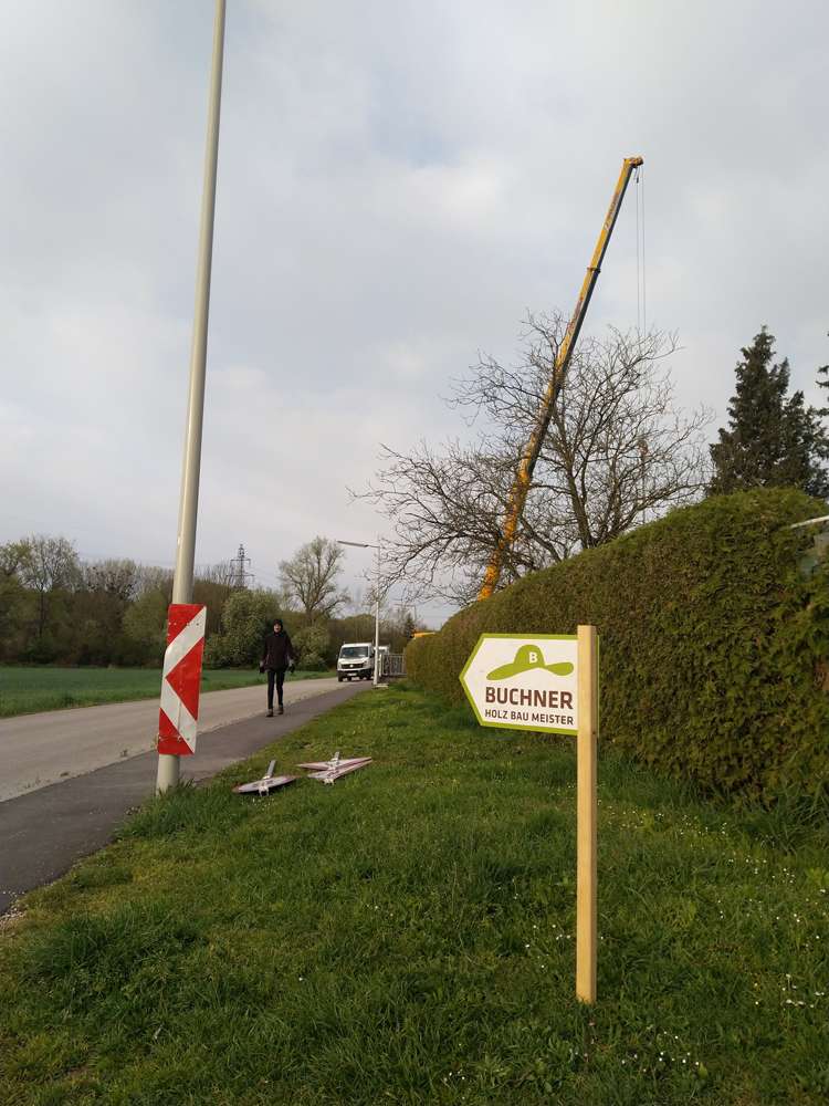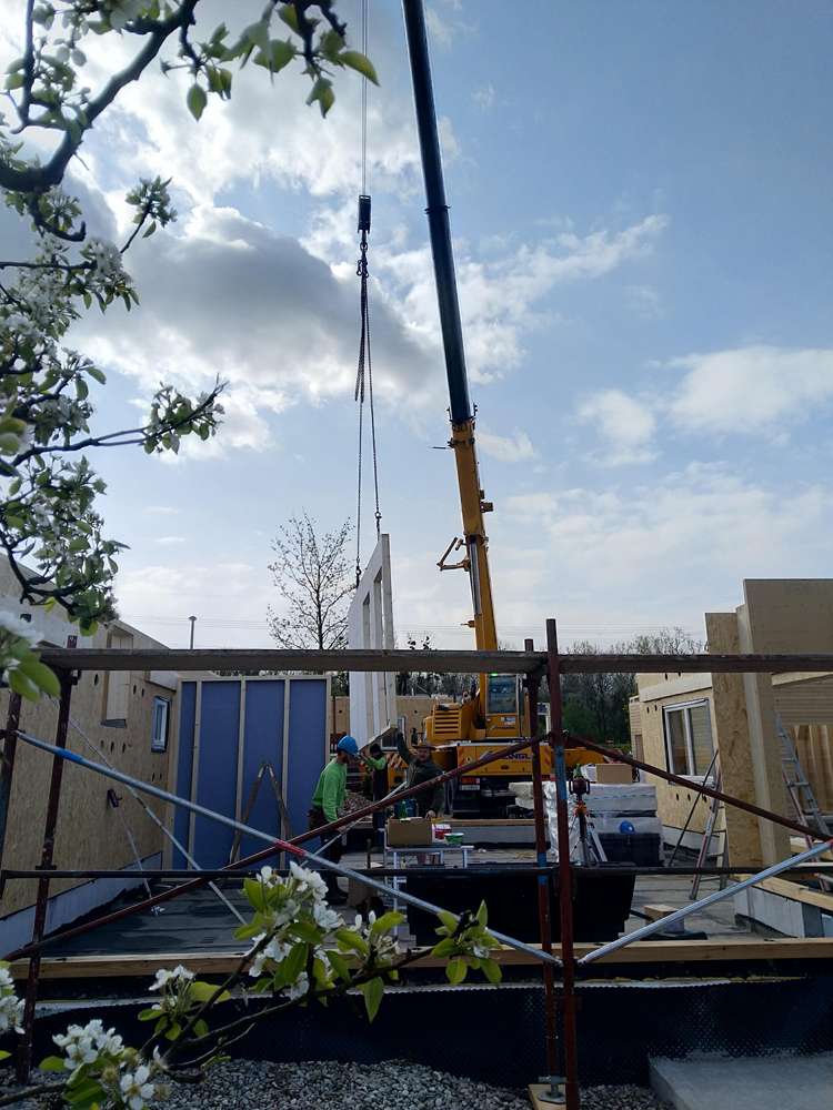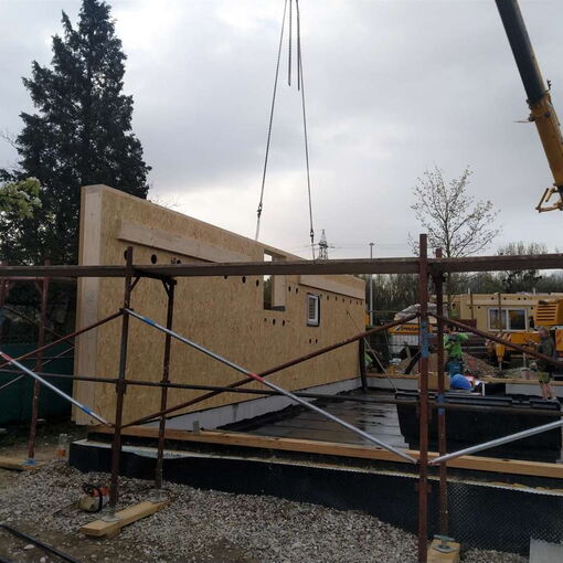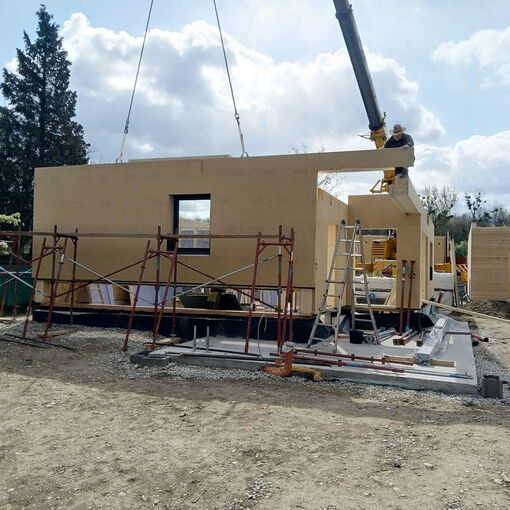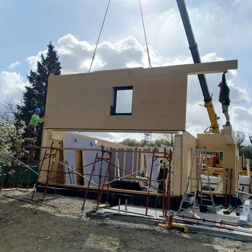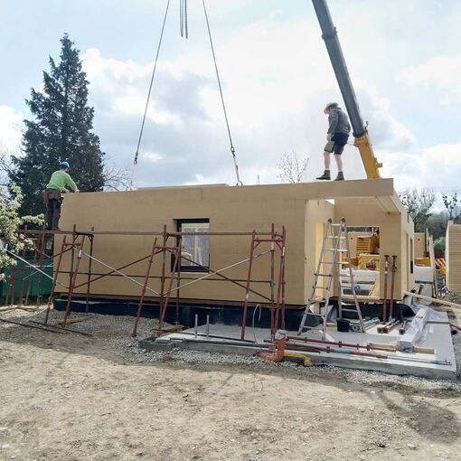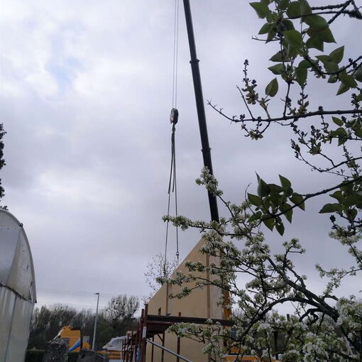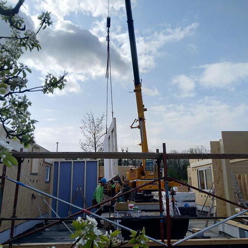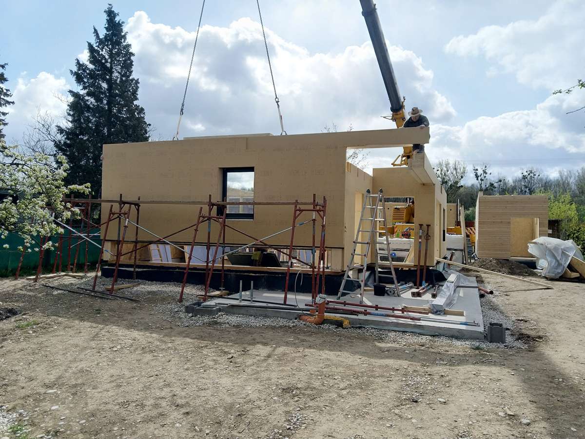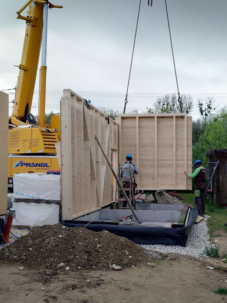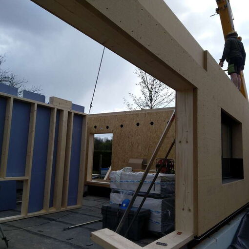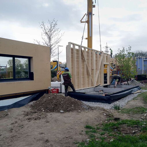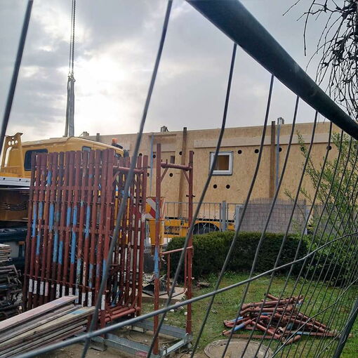 Der Teleskopkran ist schon startbereit, und bald kommt schon der erste Tieflader mit den Wänden für das Erdgeschoß. Eine Wand nach der anderen wird an Ort und Stelle gehoben und festgezurrt. Wir schauen gebannt zu und hoffen, dass uns kein Trum auf den Kopf fällt. Ein wirklich spannender Tag, nur das Wetter lässt zu wünschen übrig. Es ist saukalt und wir müssen uns immer wieder im Glashaus aufwärmen. Unser Polier trotzt den arktischen Temperaturen in der kurzen Lederhose ...