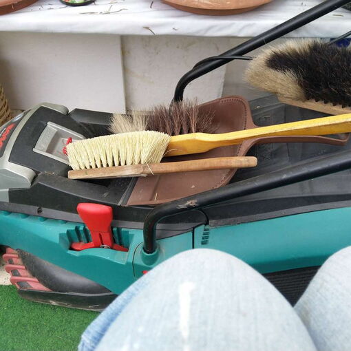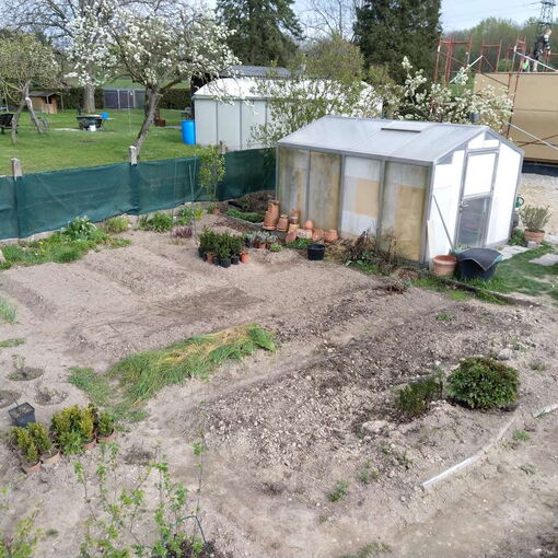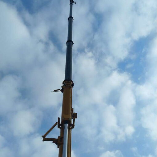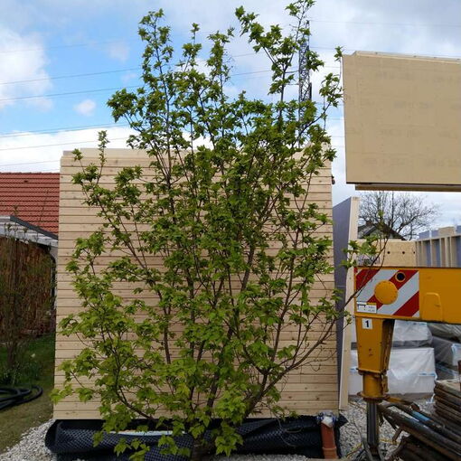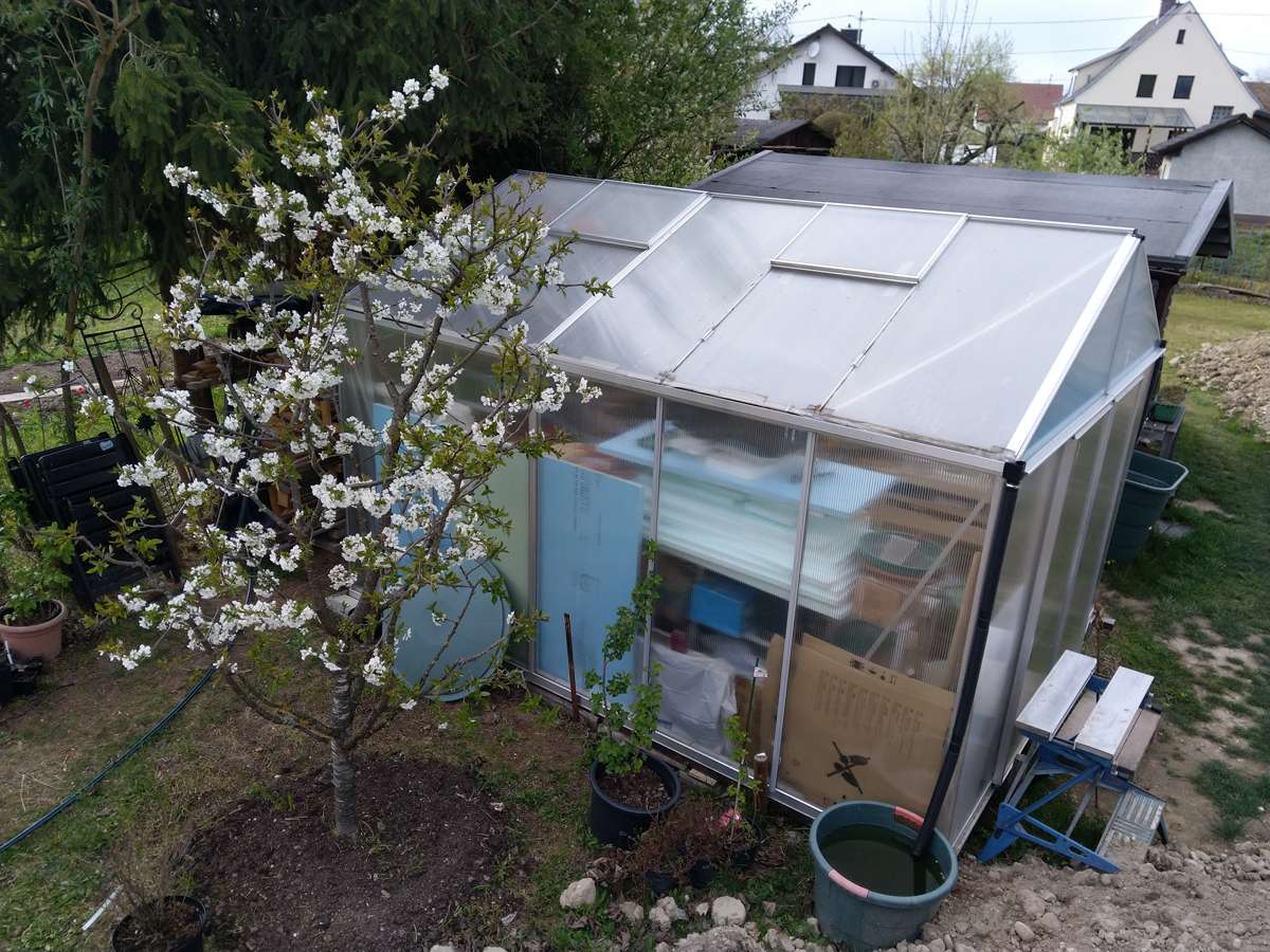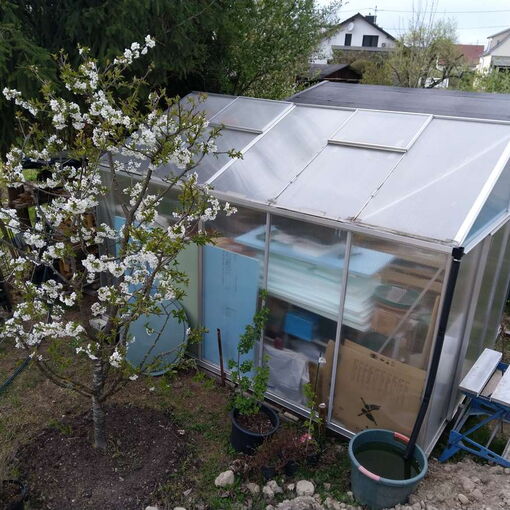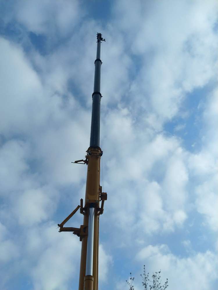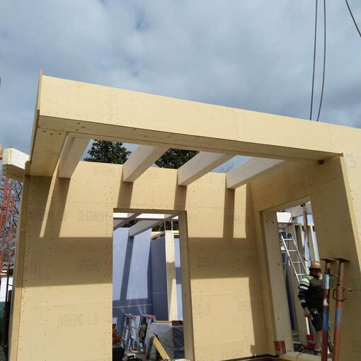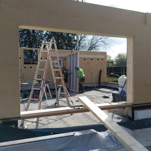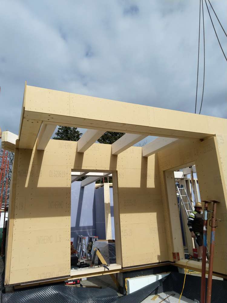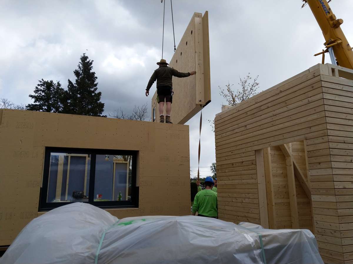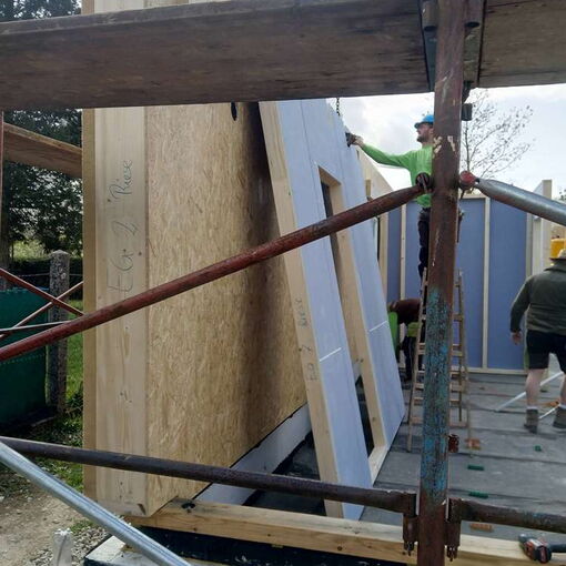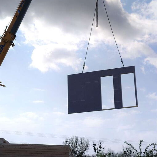 Der Teleskopkran ist schon startbereit, und bald kommt schon der erste Tieflader mit den Wänden für das Erdgeschoß. Eine Wand nach der anderen wird an Ort und Stelle gehoben und festgezurrt. Wir schauen gebannt zu und hoffen, dass uns kein Trum auf den Kopf fällt. Ein wirklich spannender Tag, nur das Wetter lässt zu wünschen übrig. Es ist saukalt und wir müssen uns immer wieder im Glashaus aufwärmen. Unser Polier trotzt den arktischen Temperaturen in der kurzen Lederhose ...