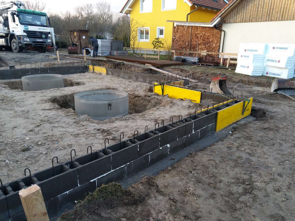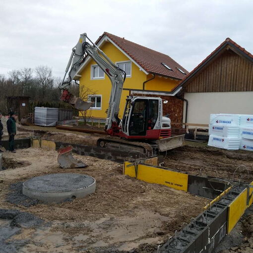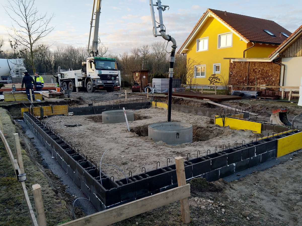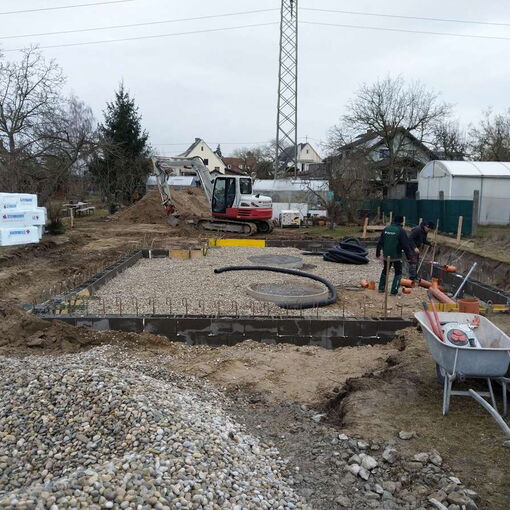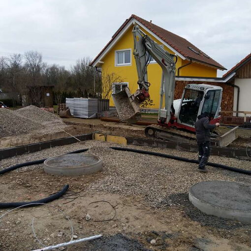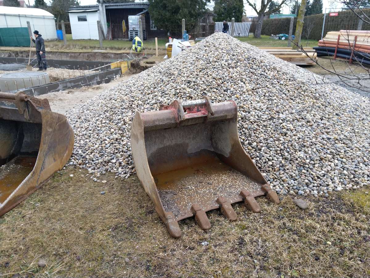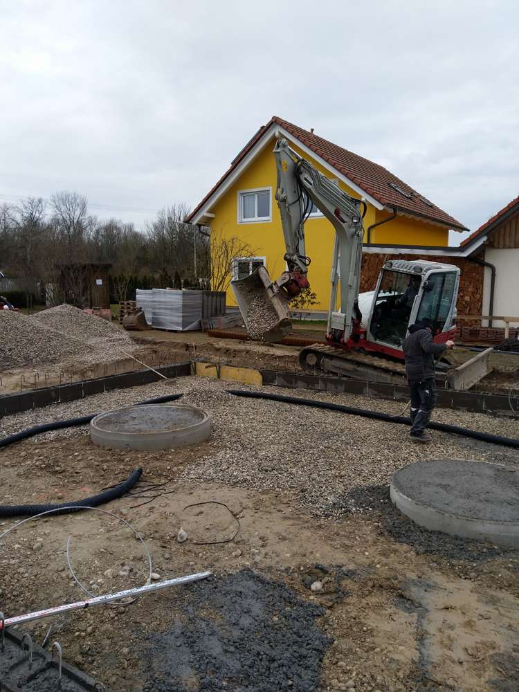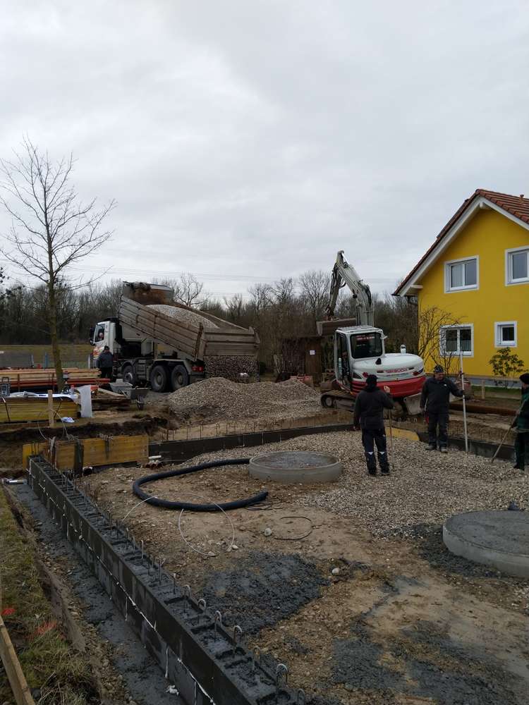 Um ja nicht wieder etwas zu versäumen, wurde der Dokumentationsbeginn heute auf 7:15 gesetzt. Und eh klar, die Betonpumpe steht schon wieder parat. Diesmal werden die "Hausbrunnen" und die beiden Reihen Schalsteine gefüllt. Die Sonne kommt raus und das Makita-Baustellenradio dudelt 95.2. Dann kommt wieder ein LKW und bringt zwei Fuhren Kies (16/32). Der Bagger kämpft mit der Enge am Grundstück (lang genug wäre es ja, aber links ist einfach zuwenig Platz ...), gräbt den Spierstrauch aus, stellt ihn beiseite und schaufelt sich einen Weg zum Kieshaufen frei. Dann wird ein Schlauch verlegt (vermutlich für die Radondrainage) und die Baugrube mit Kies gefüllt. Und schon sind wir auf der Höhe der Kanalanschlüsse, die auch schon verlegt werden. Wärmepumpe, WC und Küche - aha, irgendwie sieht das alles recht klein aus. Vielleicht hätten wir doch größer bauen sollen?