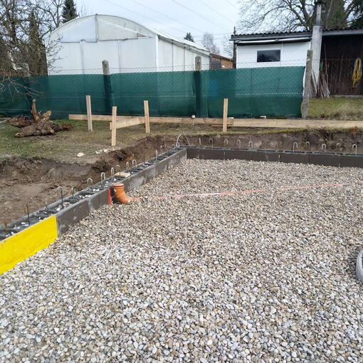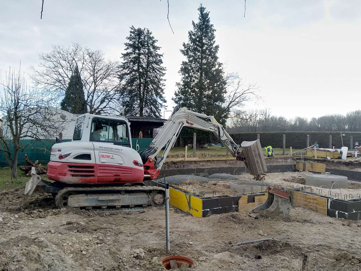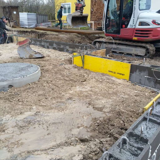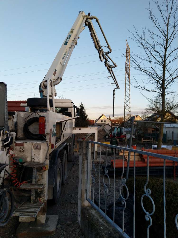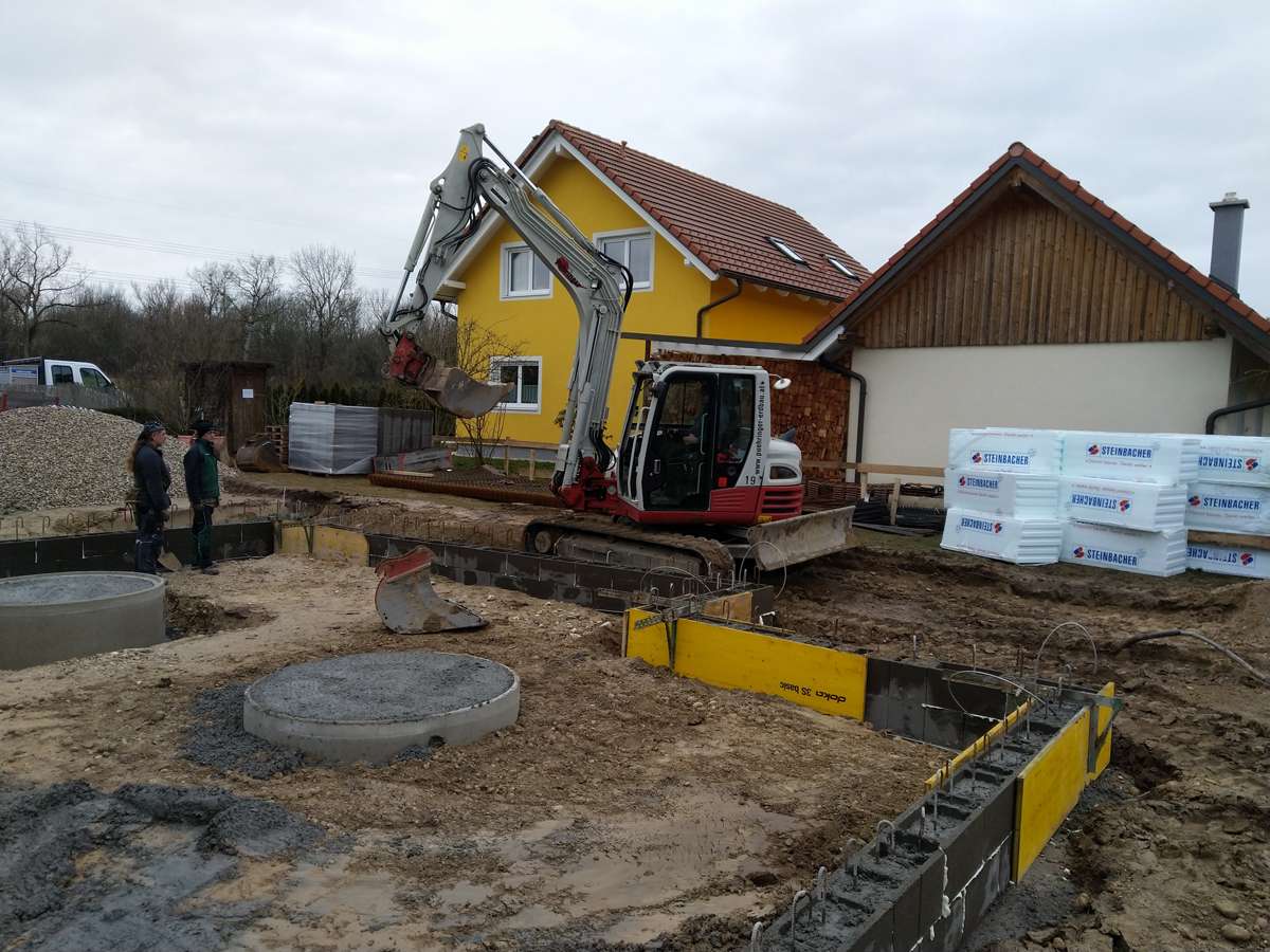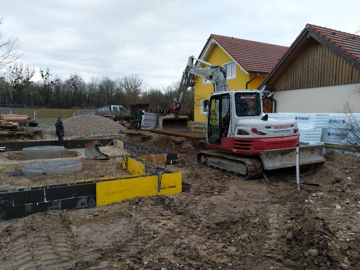 Um ja nicht wieder etwas zu versäumen, wurde der Dokumentationsbeginn heute auf 7:15 gesetzt. Und eh klar, die Betonpumpe steht schon wieder parat. Diesmal werden die "Hausbrunnen" und die beiden Reihen Schalsteine gefüllt. Die Sonne kommt raus und das Makita-Baustellenradio dudelt 95.2. Dann kommt wieder ein LKW und bringt zwei Fuhren Kies (16/32). Der Bagger kämpft mit der Enge am Grundstück (lang genug wäre es ja, aber links ist einfach zuwenig Platz ...), gräbt den Spierstrauch aus, stellt ihn beiseite und schaufelt sich einen Weg zum Kieshaufen frei. Dann wird ein Schlauch verlegt (vermutlich für die Radondrainage) und die Baugrube mit Kies gefüllt. Und schon sind wir auf der Höhe der Kanalanschlüsse, die auch schon verlegt werden. Wärmepumpe, WC und Küche - aha, irgendwie sieht das alles recht klein aus. Vielleicht hätten wir doch größer bauen sollen?