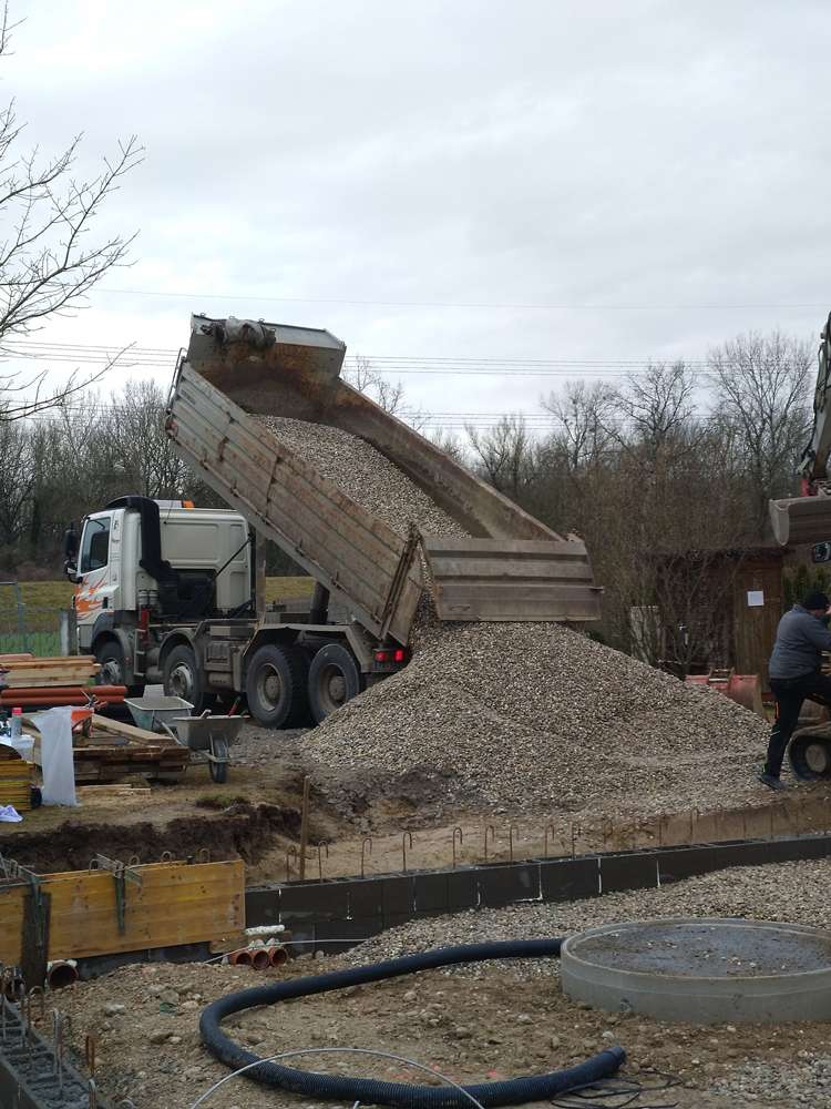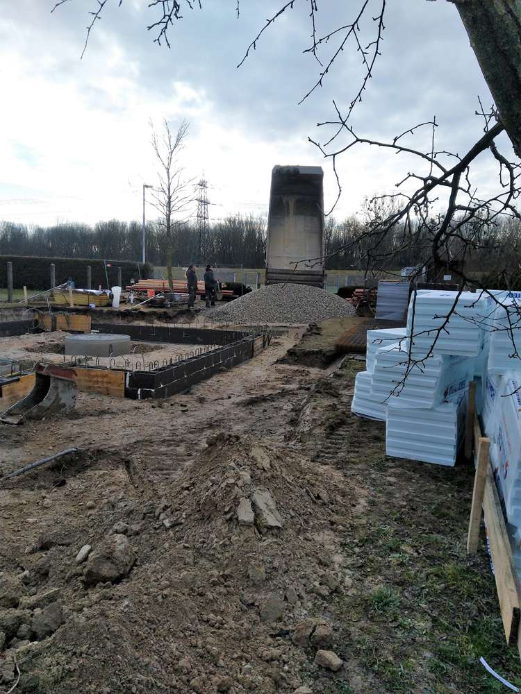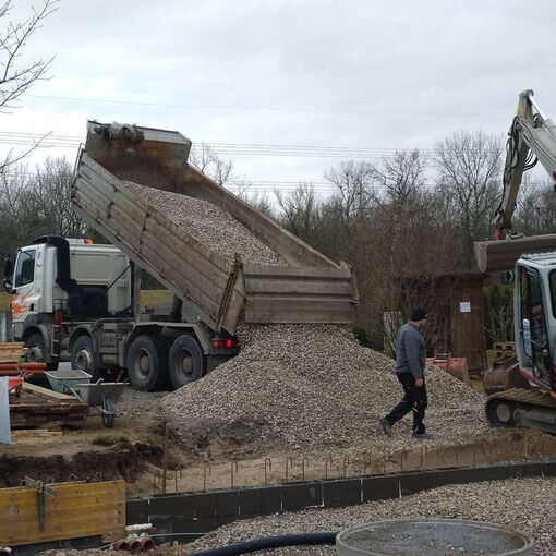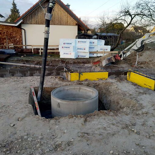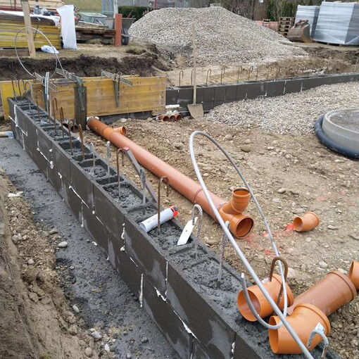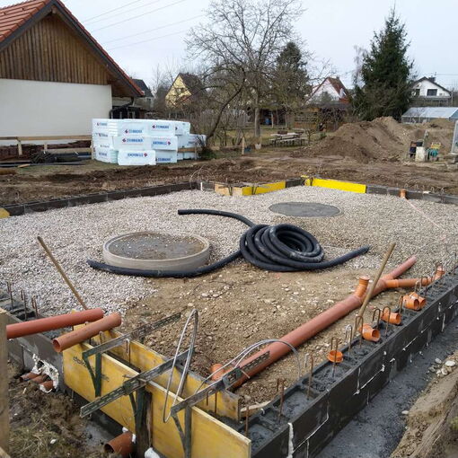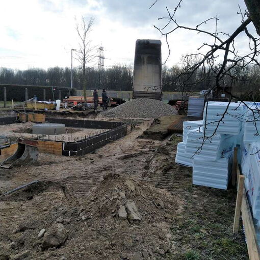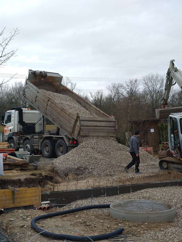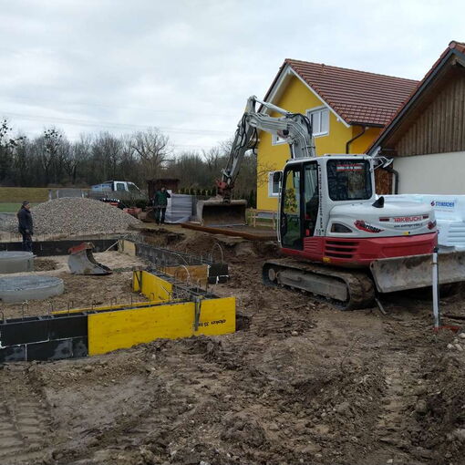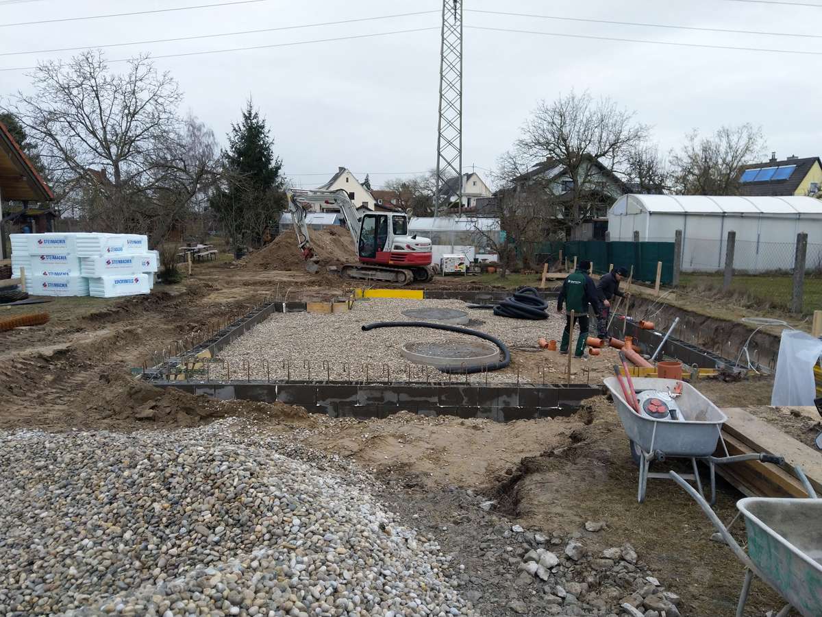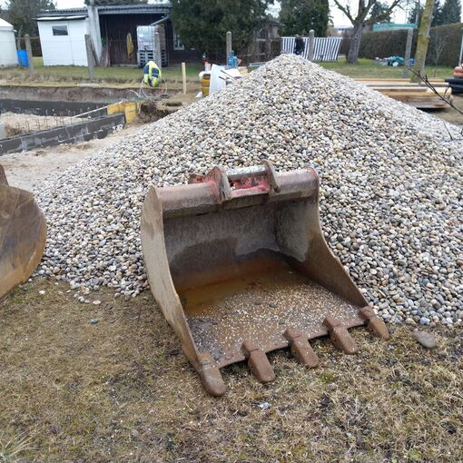 Um ja nicht wieder etwas zu versäumen, wurde der Dokumentationsbeginn heute auf 7:15 gesetzt. Und eh klar, die Betonpumpe steht schon wieder parat. Diesmal werden die "Hausbrunnen" und die beiden Reihen Schalsteine gefüllt. Die Sonne kommt raus und das Makita-Baustellenradio dudelt 95.2. Dann kommt wieder ein LKW und bringt zwei Fuhren Kies (16/32). Der Bagger kämpft mit der Enge am Grundstück (lang genug wäre es ja, aber links ist einfach zuwenig Platz ...), gräbt den Spierstrauch aus, stellt ihn beiseite und schaufelt sich einen Weg zum Kieshaufen frei. Dann wird ein Schlauch verlegt (vermutlich für die Radondrainage) und die Baugrube mit Kies gefüllt. Und schon sind wir auf der Höhe der Kanalanschlüsse, die auch schon verlegt werden. Wärmepumpe, WC und Küche - aha, irgendwie sieht das alles recht klein aus. Vielleicht hätten wir doch größer bauen sollen?