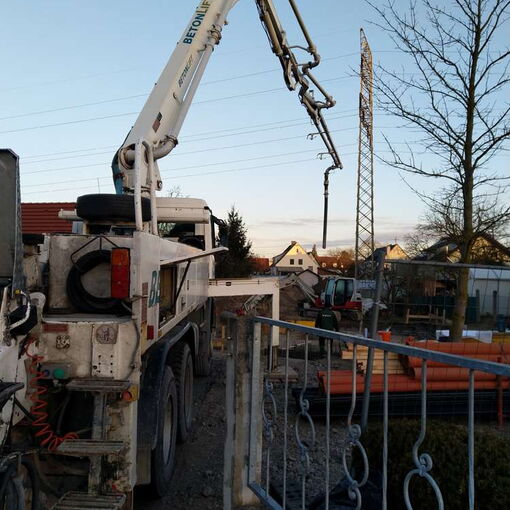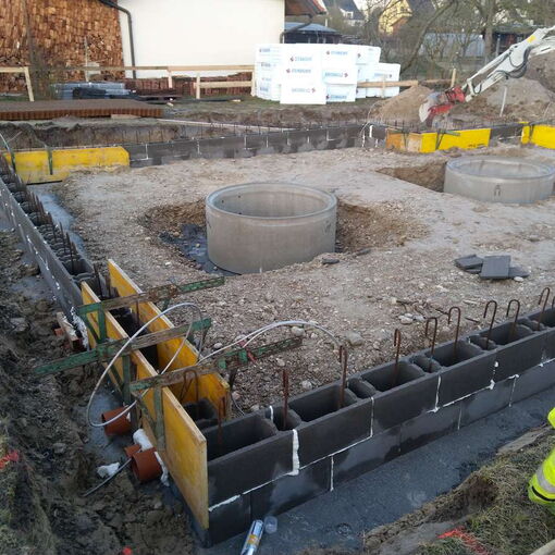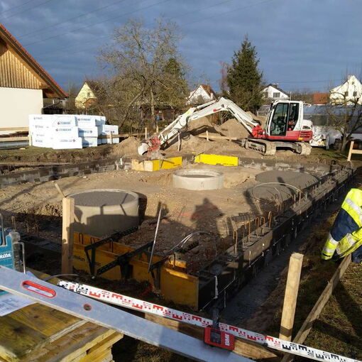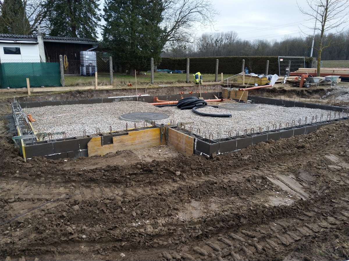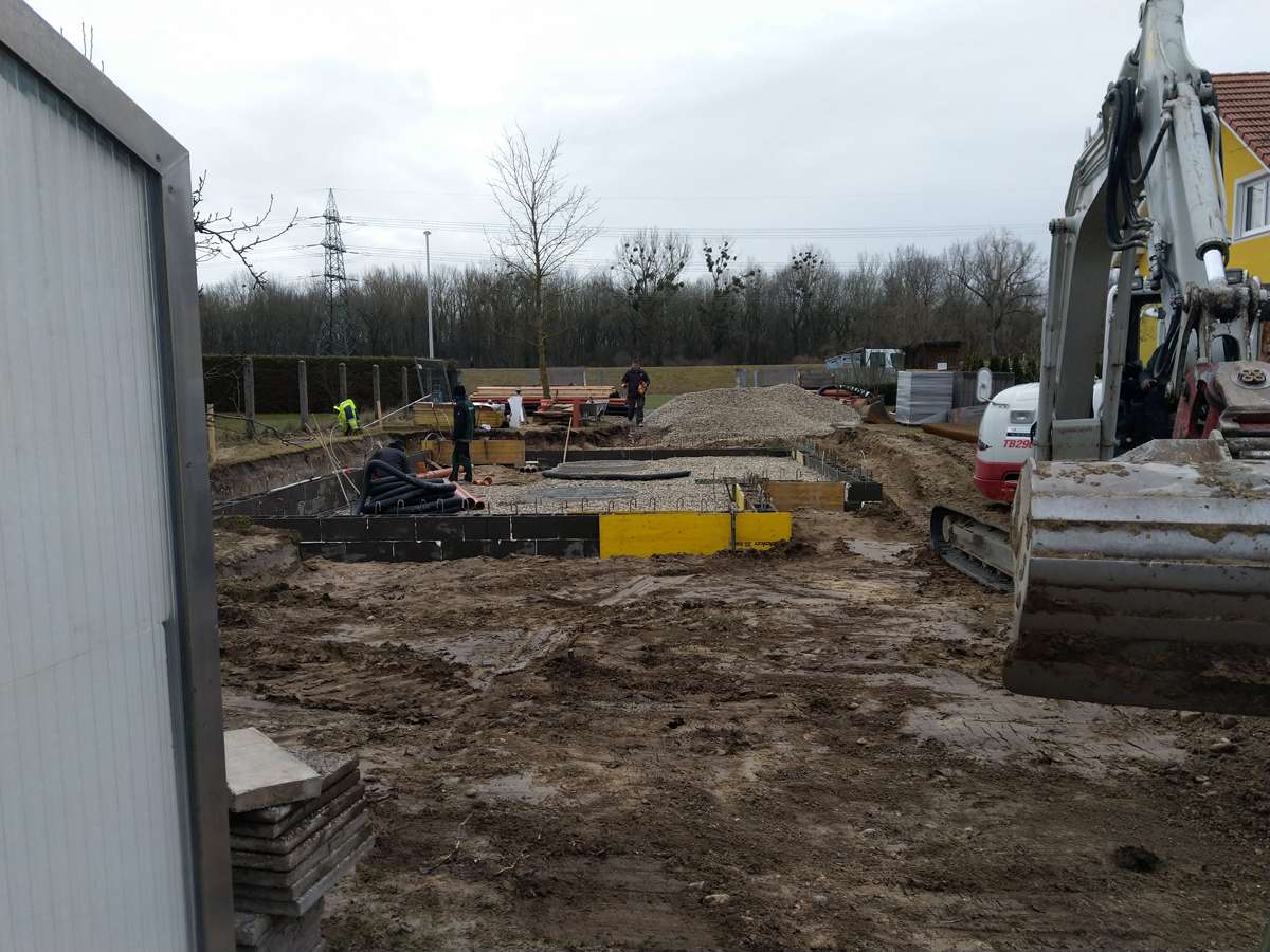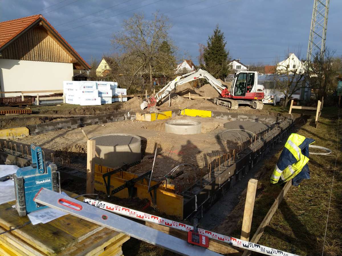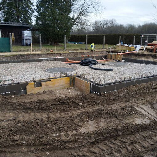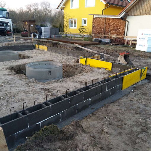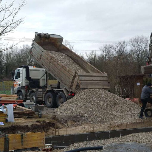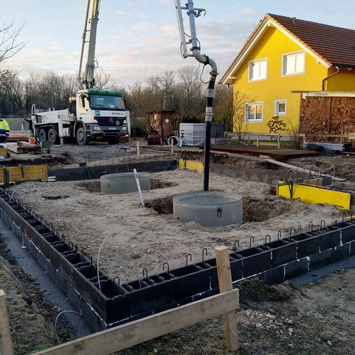 Um ja nicht wieder etwas zu versäumen, wurde der Dokumentationsbeginn heute auf 7:15 gesetzt. Und eh klar, die Betonpumpe steht schon wieder parat. Diesmal werden die "Hausbrunnen" und die beiden Reihen Schalsteine gefüllt. Die Sonne kommt raus und das Makita-Baustellenradio dudelt 95.2. Dann kommt wieder ein LKW und bringt zwei Fuhren Kies (16/32). Der Bagger kämpft mit der Enge am Grundstück (lang genug wäre es ja, aber links ist einfach zuwenig Platz ...), gräbt den Spierstrauch aus, stellt ihn beiseite und schaufelt sich einen Weg zum Kieshaufen frei. Dann wird ein Schlauch verlegt (vermutlich für die Radondrainage) und die Baugrube mit Kies gefüllt. Und schon sind wir auf der Höhe der Kanalanschlüsse, die auch schon verlegt werden. Wärmepumpe, WC und Küche - aha, irgendwie sieht das alles recht klein aus. Vielleicht hätten wir doch größer bauen sollen?