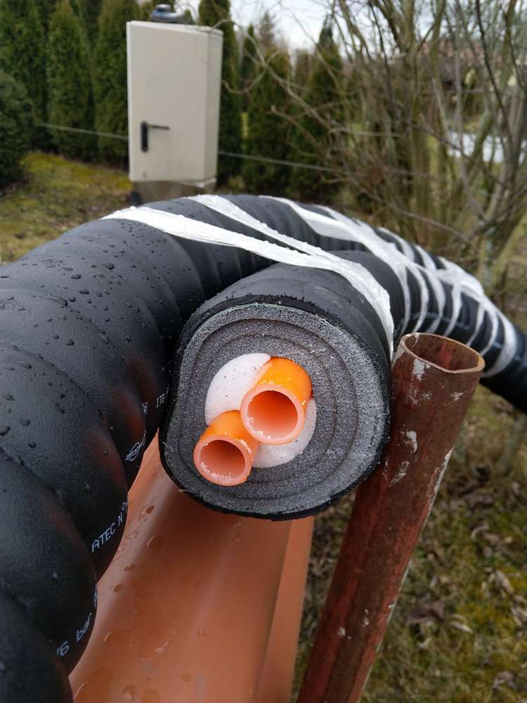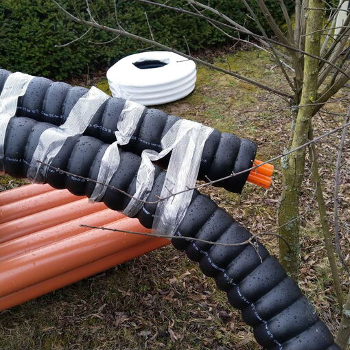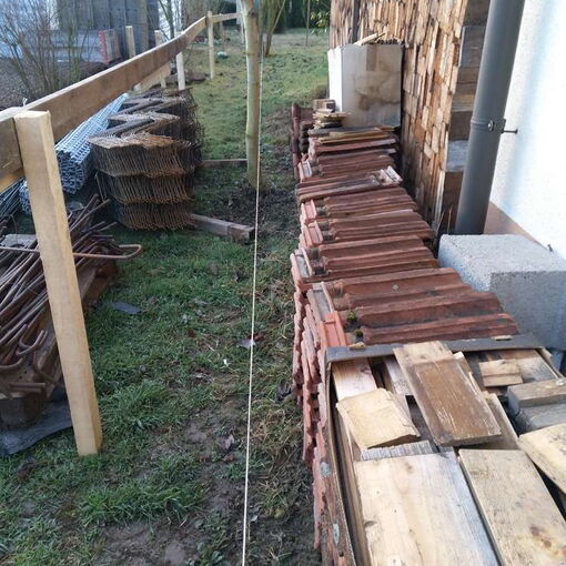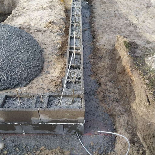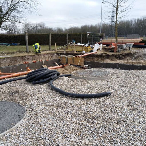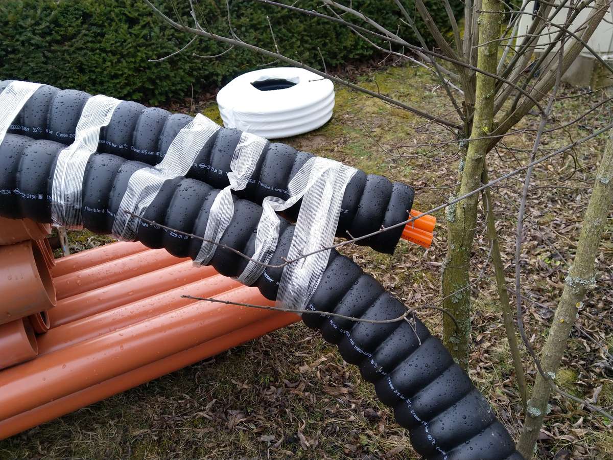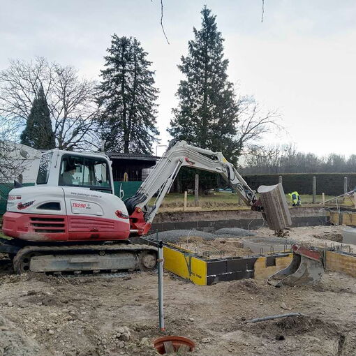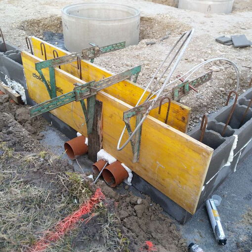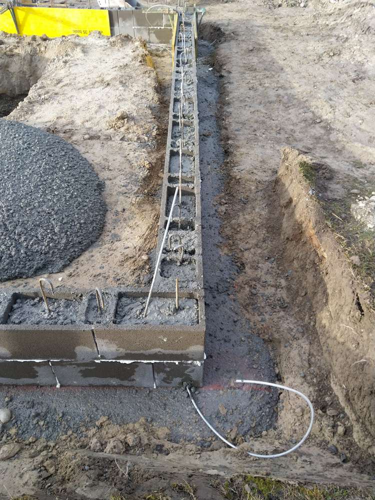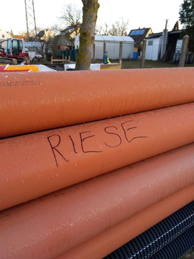 Um ja nicht wieder etwas zu versäumen, wurde der Dokumentationsbeginn heute auf 7:15 gesetzt. Und eh klar, die Betonpumpe steht schon wieder parat. Diesmal werden die "Hausbrunnen" und die beiden Reihen Schalsteine gefüllt. Die Sonne kommt raus und das Makita-Baustellenradio dudelt 95.2. Dann kommt wieder ein LKW und bringt zwei Fuhren Kies (16/32). Der Bagger kämpft mit der Enge am Grundstück (lang genug wäre es ja, aber links ist einfach zuwenig Platz ...), gräbt den Spierstrauch aus, stellt ihn beiseite und schaufelt sich einen Weg zum Kieshaufen frei. Dann wird ein Schlauch verlegt (vermutlich für die Radondrainage) und die Baugrube mit Kies gefüllt. Und schon sind wir auf der Höhe der Kanalanschlüsse, die auch schon verlegt werden. Wärmepumpe, WC und Küche - aha, irgendwie sieht das alles recht klein aus. Vielleicht hätten wir doch größer bauen sollen?