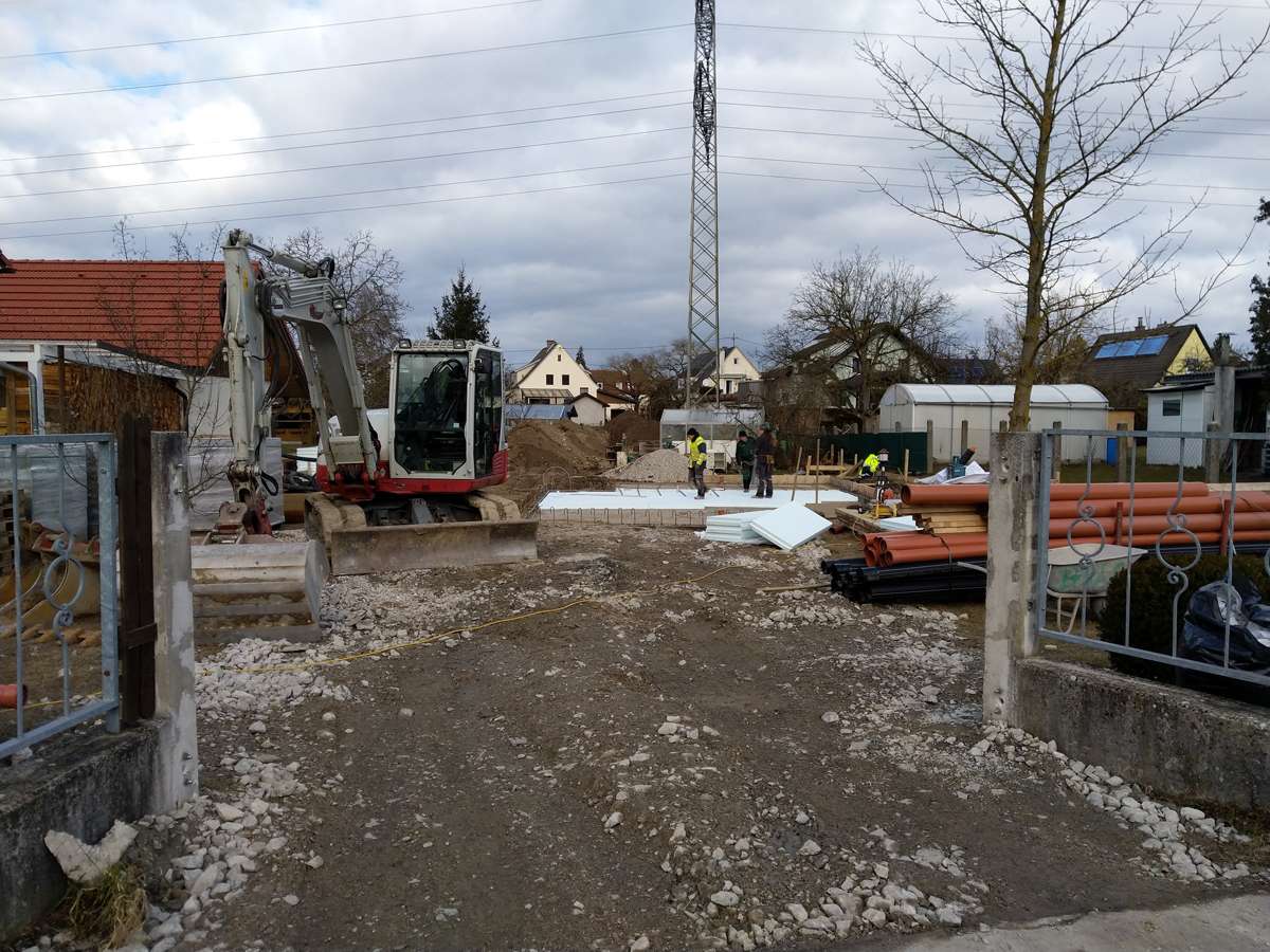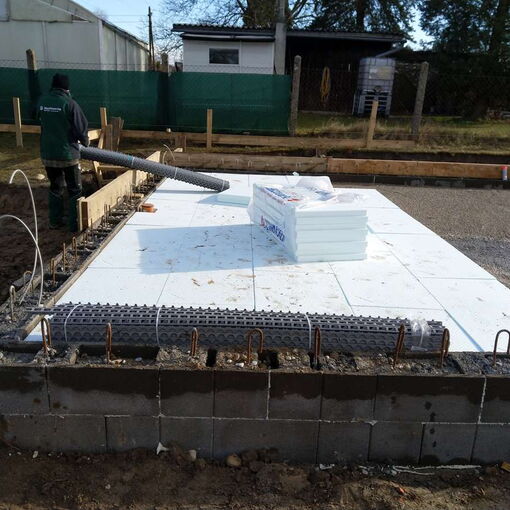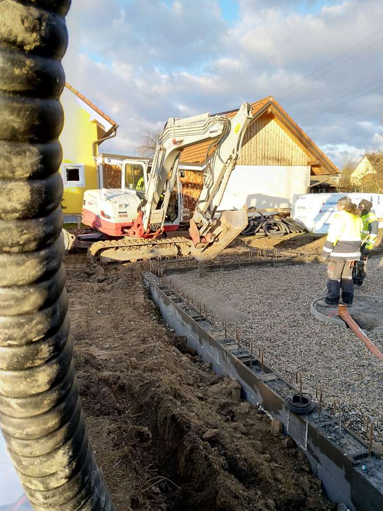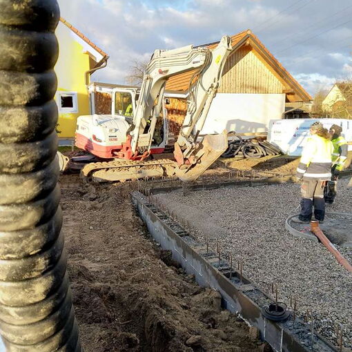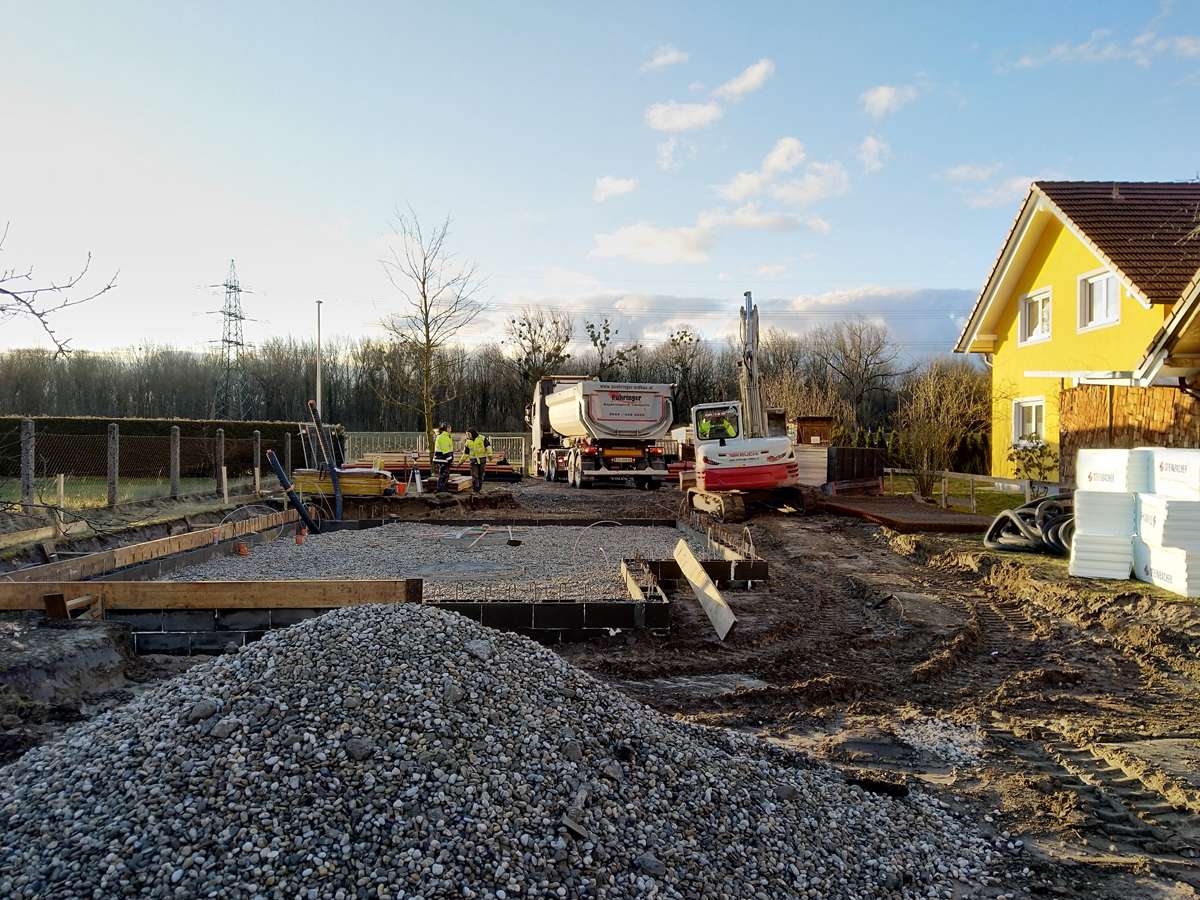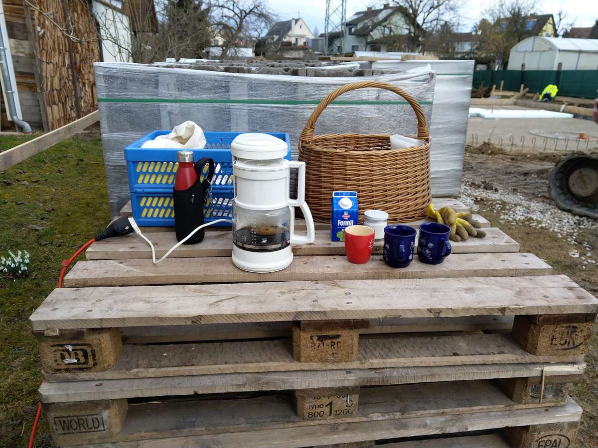 Nach einer nassen und windigen Nacht haben sich die Wolken wie von Zauberhand pünktlich zu Arbeitsbeginn verzogen – dummerweise, denn ein Tag Pause hätte heute gar nicht geschadet. Die Baustellendokumentation ist schließlich fast so anstrengend wie die Arbeit auf der Baustelle selbst. Aber gut, hilft nix. Draußen ist es saukalt und der Wind verbläst alles, was nicht niet- und nagelfest ist. Der frisch angelieferte »Riesel« (Kies mit der Korngröße 4/8) bleibt aber an Ort und Stelle und wird gleich auf dem Fundament verteilt. Dann wird die Dämmung verlegt, darauf kommen »Drunterleisten« und ein Baustahlgitter. Zwischendurch gibt's zum Aufwärmen einen heißen Kaffee. Die Schalung ringsum lässt vermuten, dass wir am Montag die Betonpumpe wiedersehen werden.