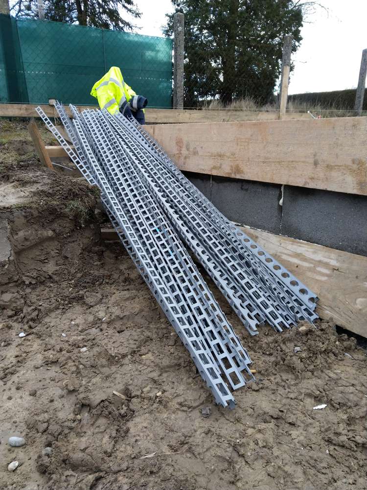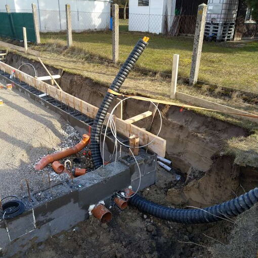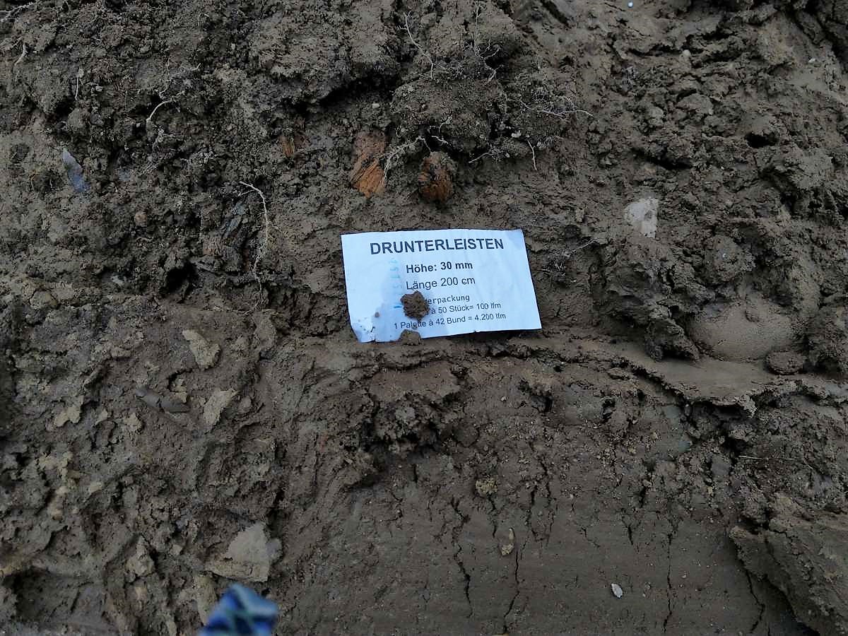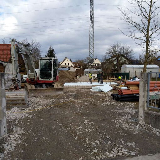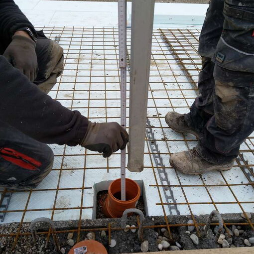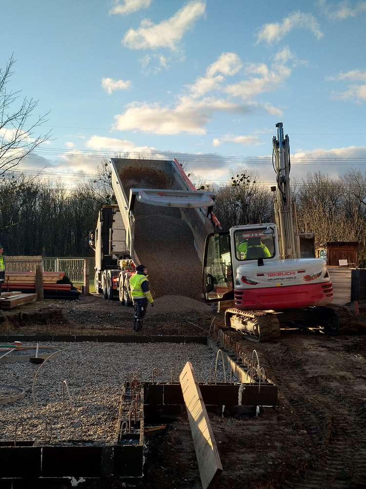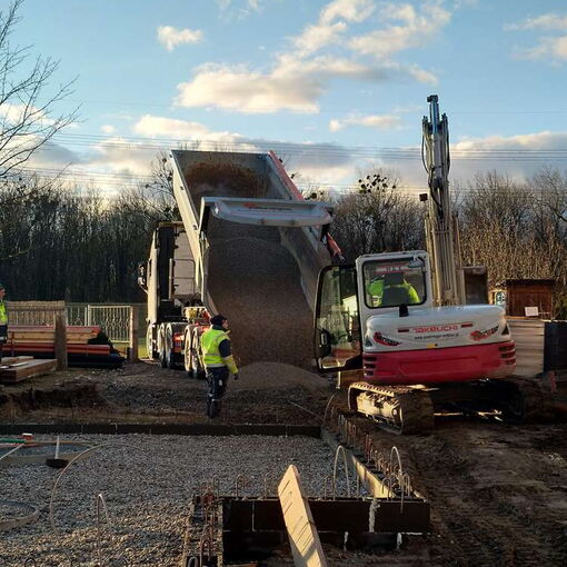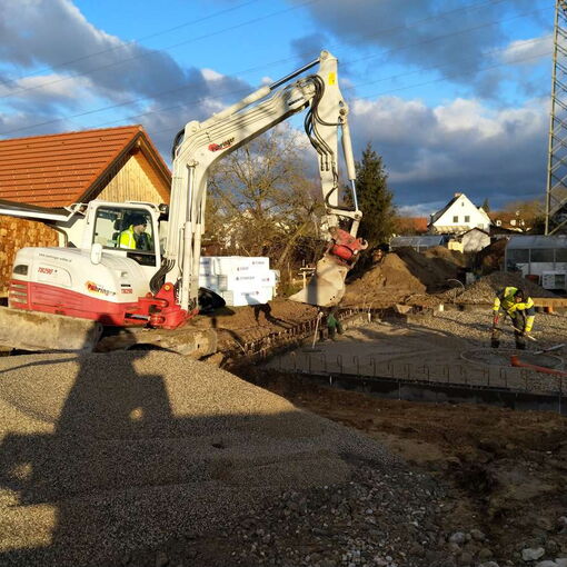 Nach einer nassen und windigen Nacht haben sich die Wolken wie von Zauberhand pünktlich zu Arbeitsbeginn verzogen – dummerweise, denn ein Tag Pause hätte heute gar nicht geschadet. Die Baustellendokumentation ist schließlich fast so anstrengend wie die Arbeit auf der Baustelle selbst. Aber gut, hilft nix. Draußen ist es saukalt und der Wind verbläst alles, was nicht niet- und nagelfest ist. Der frisch angelieferte »Riesel« (Kies mit der Korngröße 4/8) bleibt aber an Ort und Stelle und wird gleich auf dem Fundament verteilt. Dann wird die Dämmung verlegt, darauf kommen »Drunterleisten« und ein Baustahlgitter. Zwischendurch gibt's zum Aufwärmen einen heißen Kaffee. Die Schalung ringsum lässt vermuten, dass wir am Montag die Betonpumpe wiedersehen werden.